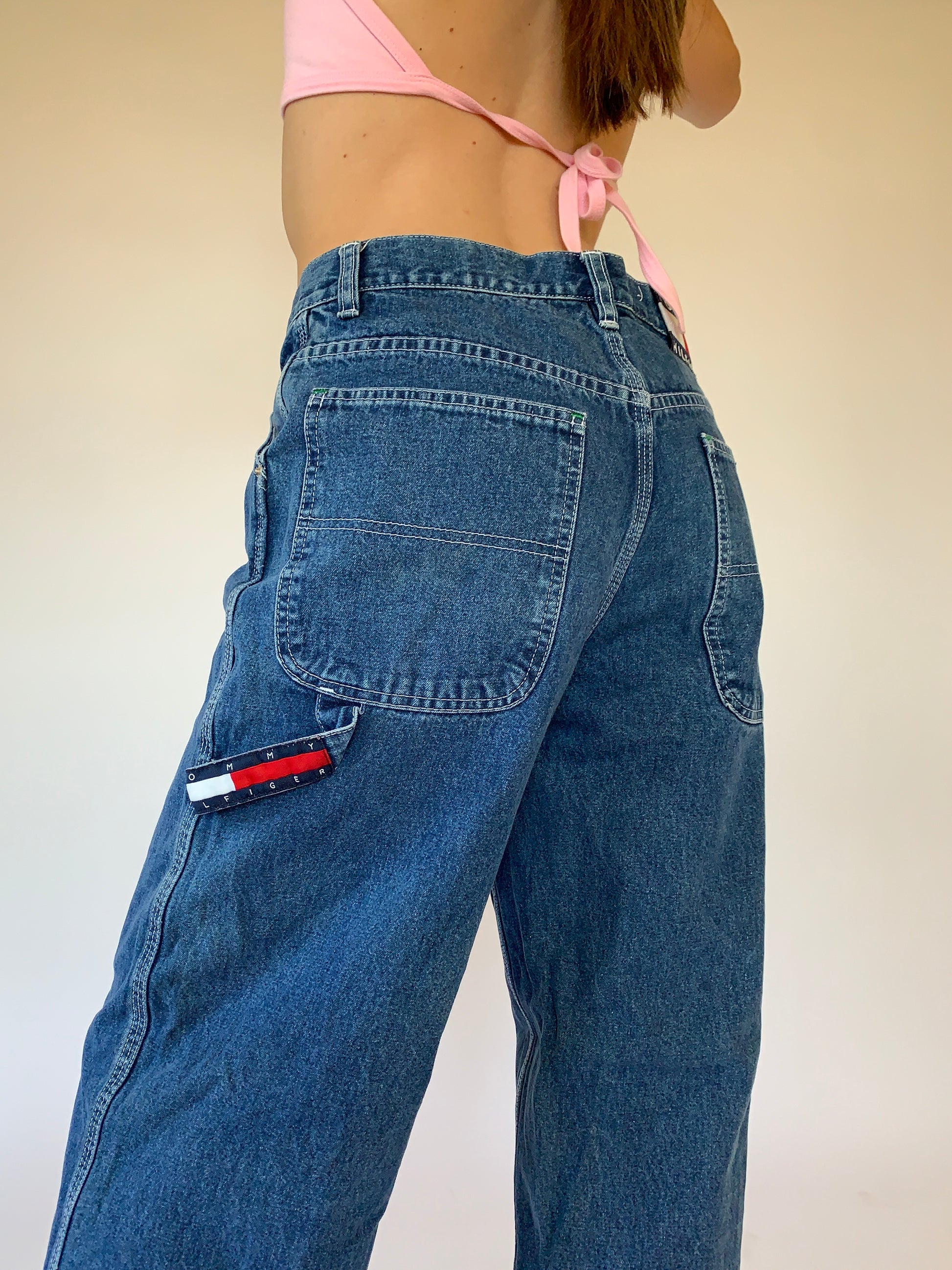 Vintage 1990s Tommy Hilfiger carpenter style jeans. High waisted with a zip fly and relaxed leg. In a dark wash. 100% cotton denim. In excellent vintage condition. Tagged size 5, best fits 28-29” waist.