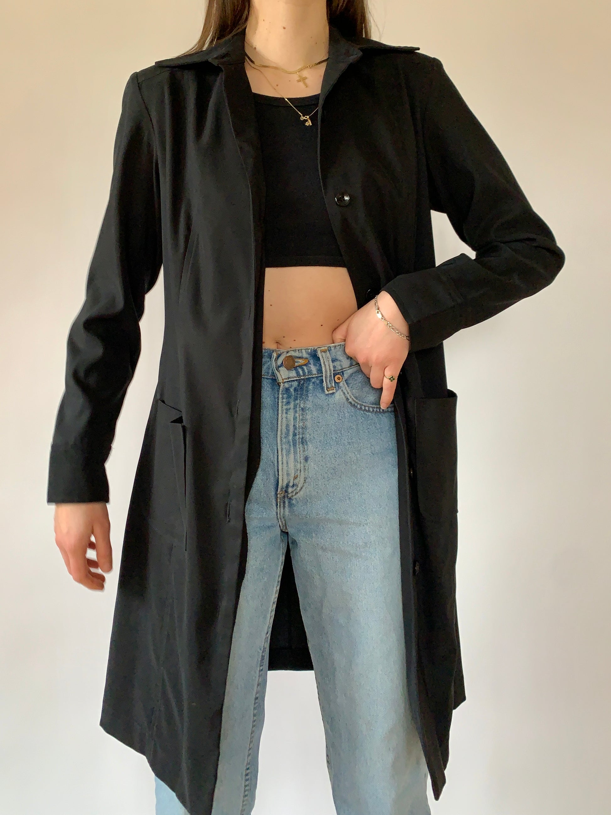 Vintage 1990s Newport News simple trench coat. In black. Material is a poly spandex blend. Excellent condition. Tagged size 6, shown on size XS.