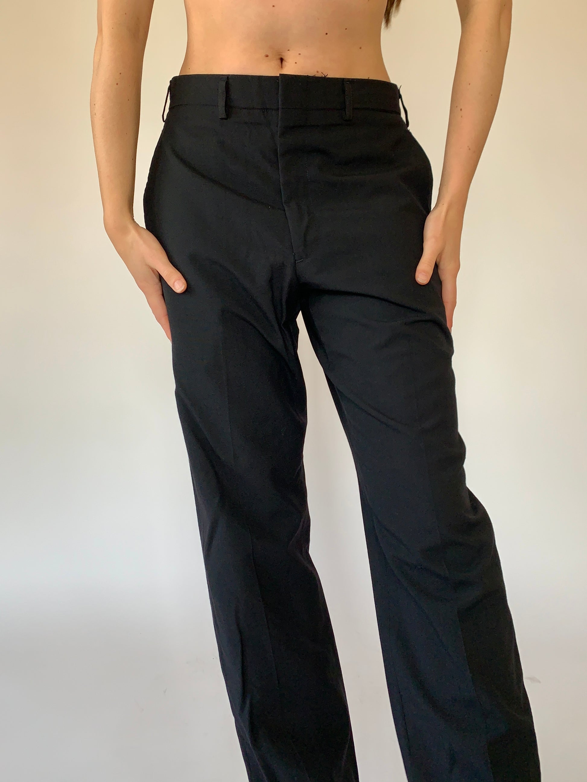 Vintage 1990s simple black trousers. High waisted with a zip fly and straight leg. Material is a polyester/wool blend. Excellent condition. Tagged size 32S, best fits 30” waist.