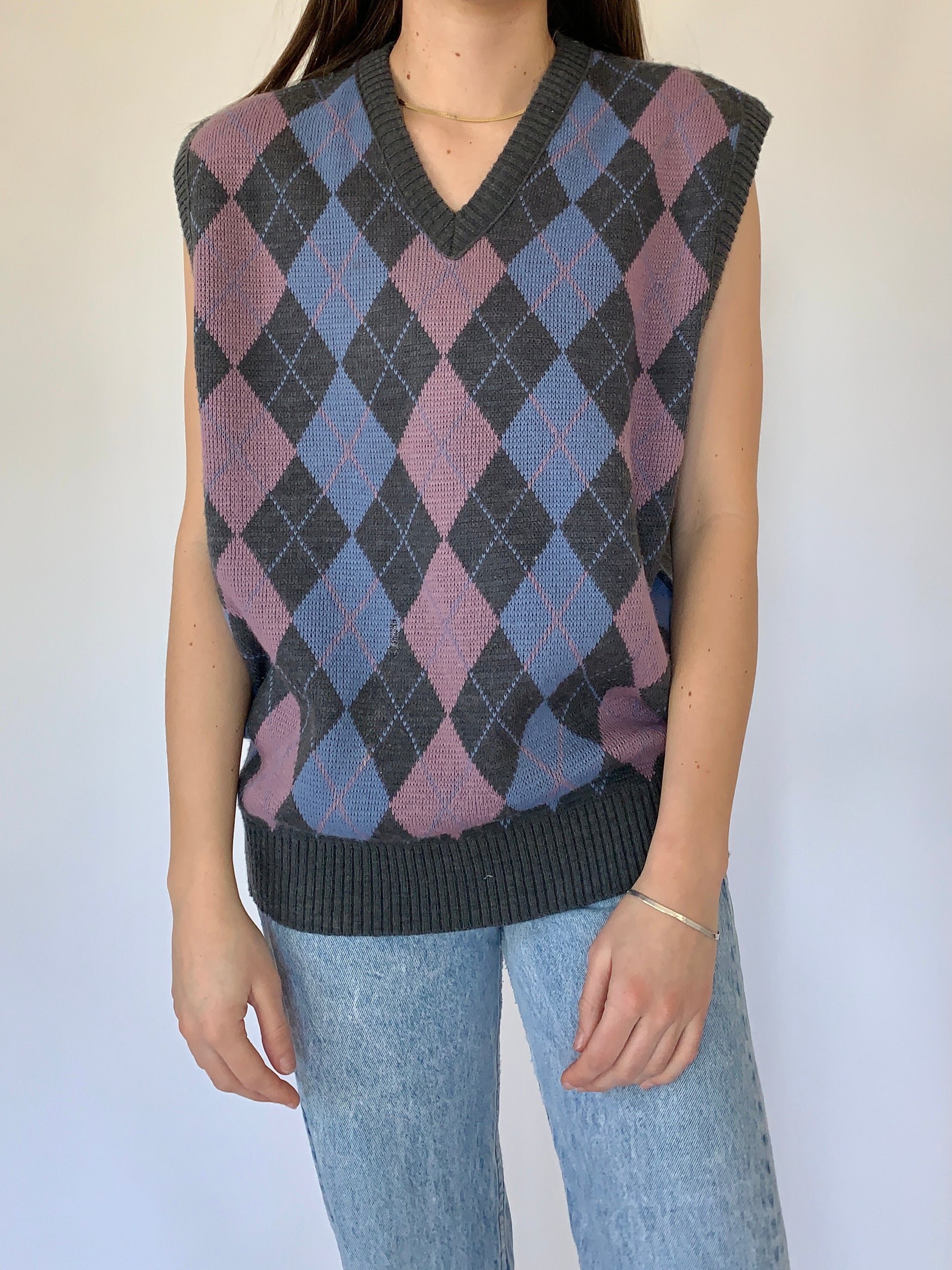 Vintage Le Tigré argyle sweater vest. In pink and blue. Made in USA. In good vintage condition despite minor thin spot - see second pic. Tagged size XL, shown oversized on size XS.