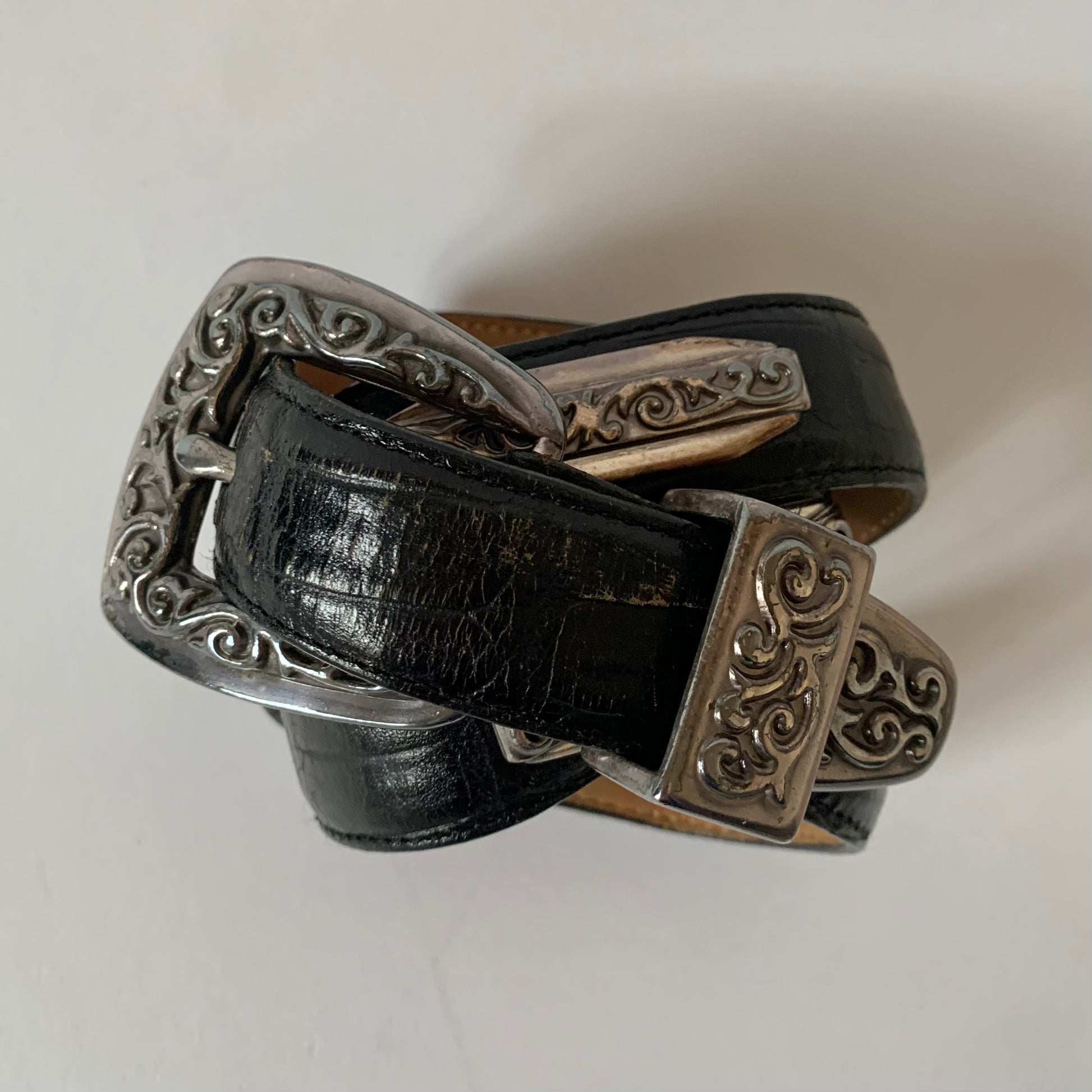 Vintage leather belt. In black with silver hardware. Good condition. Best fits XXS, 23”-26” waist.
