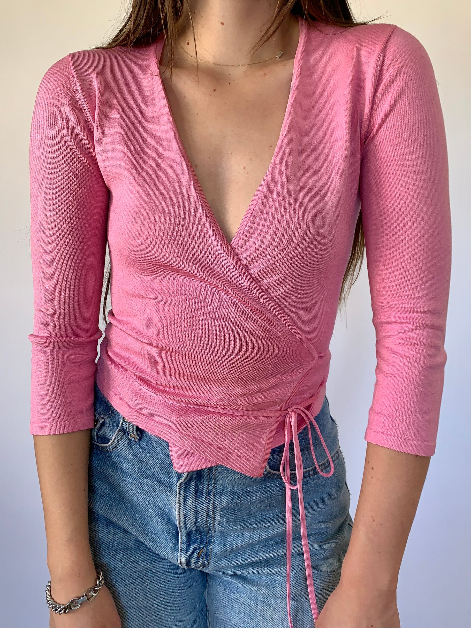 Vintage 1990s Betsey Johnson wrap top. In pink. Material is a silk spandex blend with stretch. Excellent condition. Tagged size medium. Shown on size small.