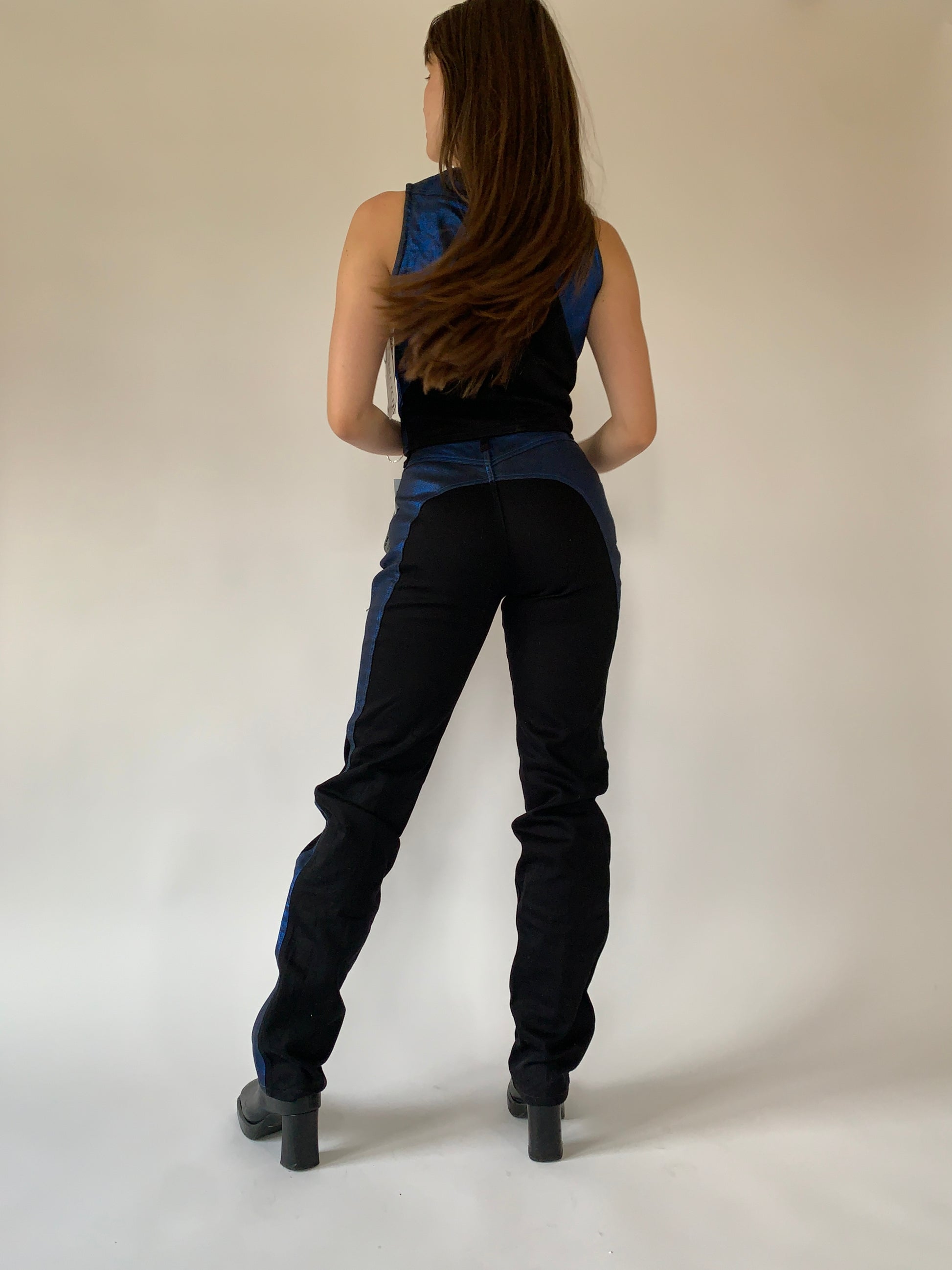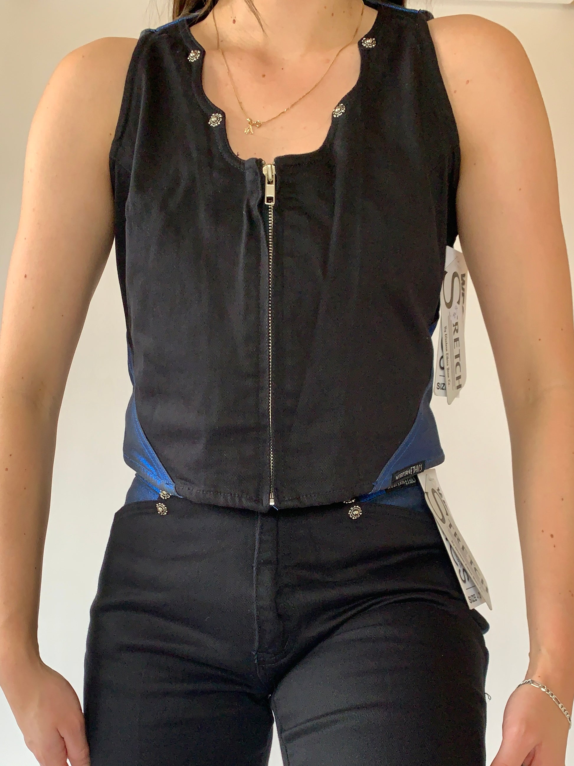 Vintage 1980s deadstock western two-piece set, made by Western Ethics. Includes jeans and vest. In black with metallic blue color block detail. Material is a cotton spandex blend. Brand new condition with original tags attached. Tagged size 3, best fits 24-25” waist. Vest is tagged a size medium. Full outfit shown on size XS.