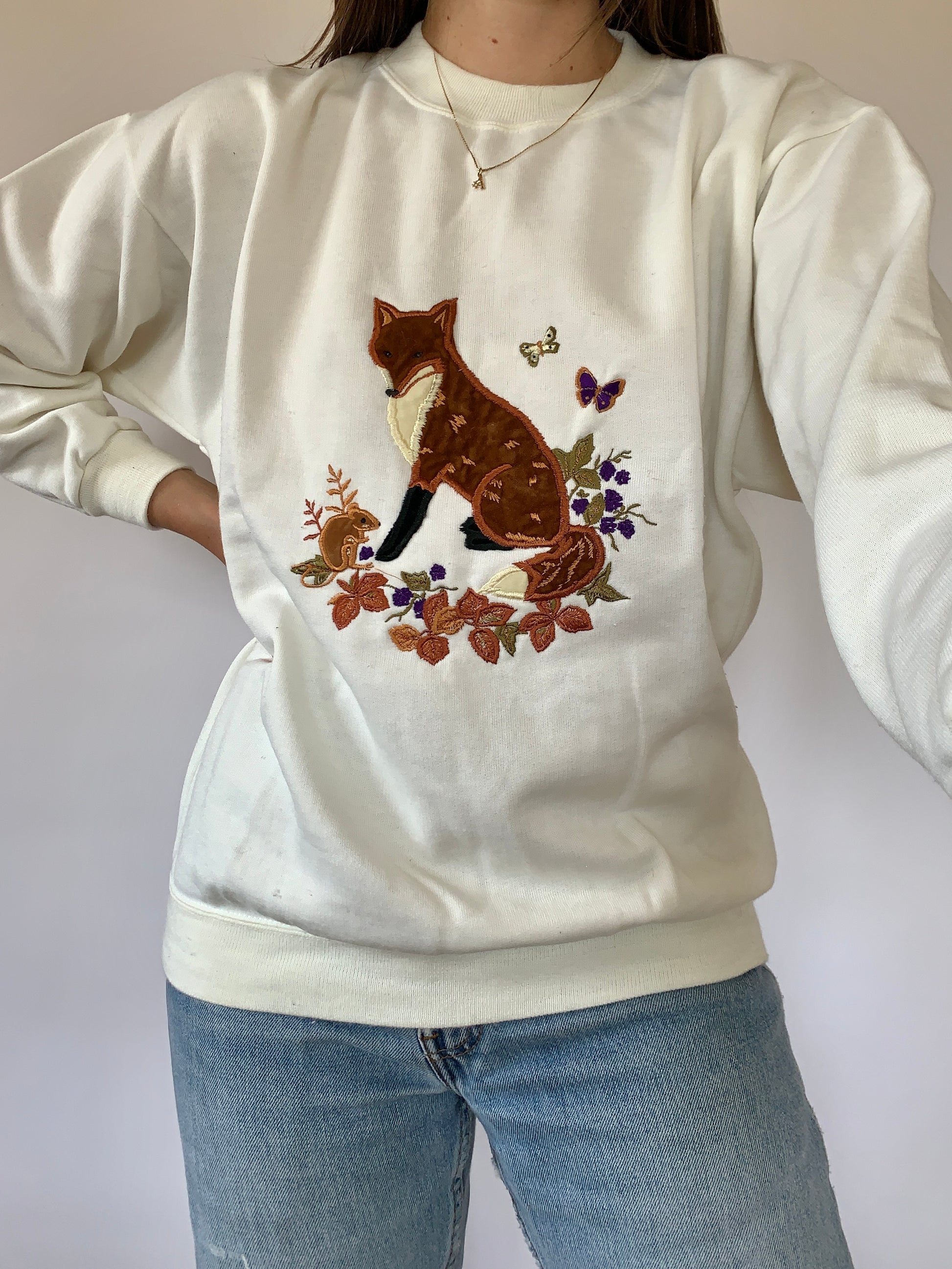 Vintage fox scene crewneck sweatshirt. Material is an acrylic cotton blend. Made in Great Britain. Good condition. Tagged size S/M. Shown on size XS.