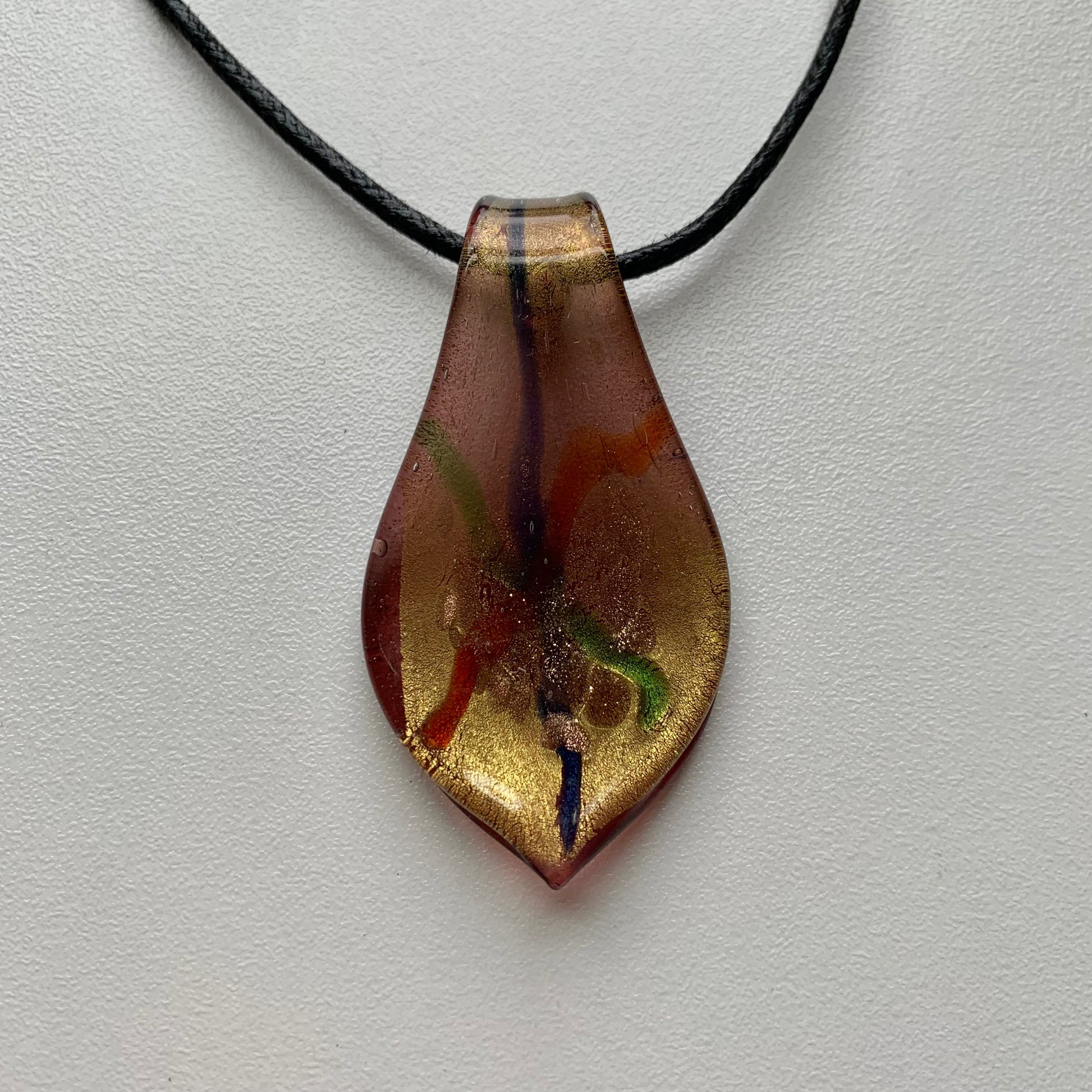 Vintage glass pendant necklace. Gold and purple pendant on black string. Good condition. Measures 40 inches long and can be worn at various lengths due to simple tie closure. Pendant measures 2 inches tall by 1 inch wide.