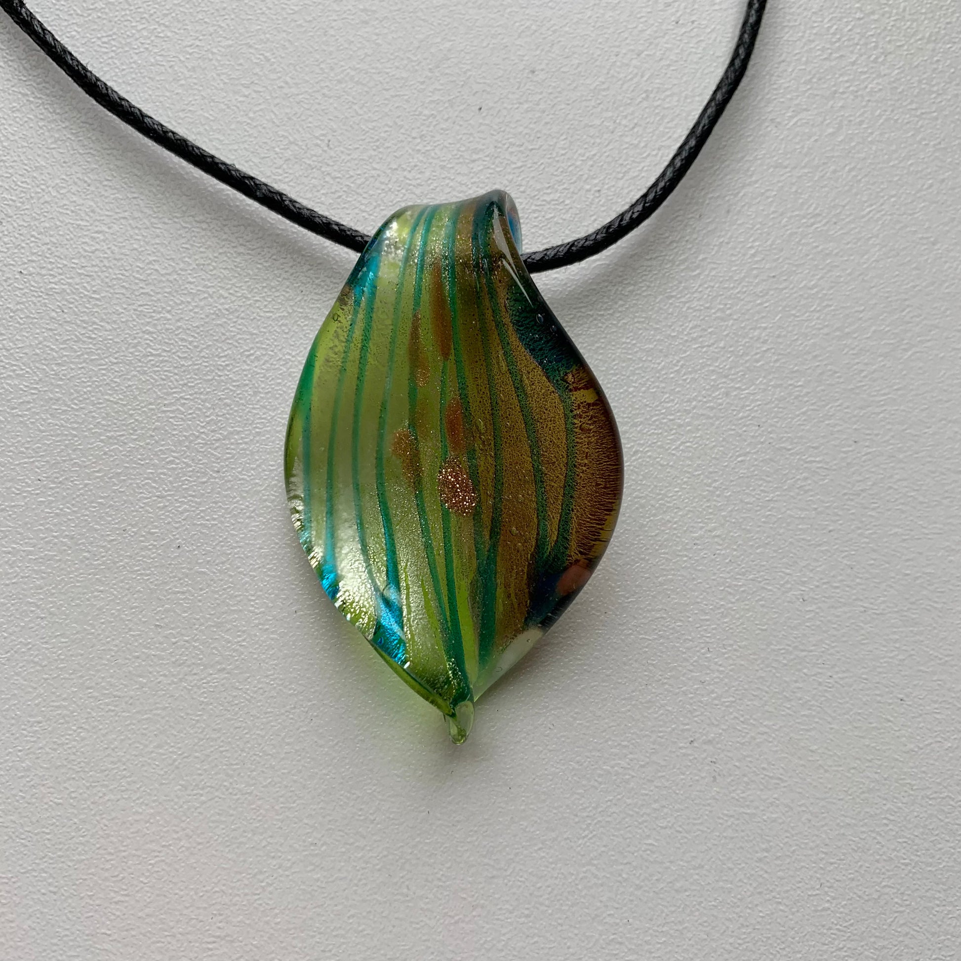Vintage glass pendant necklace. Green pendant on black string. Good condition. Measures 40 inches long and can be worn at various lengths due to simple tie closure. Pendant measures 2 inches tall by 1.5 inches wide.