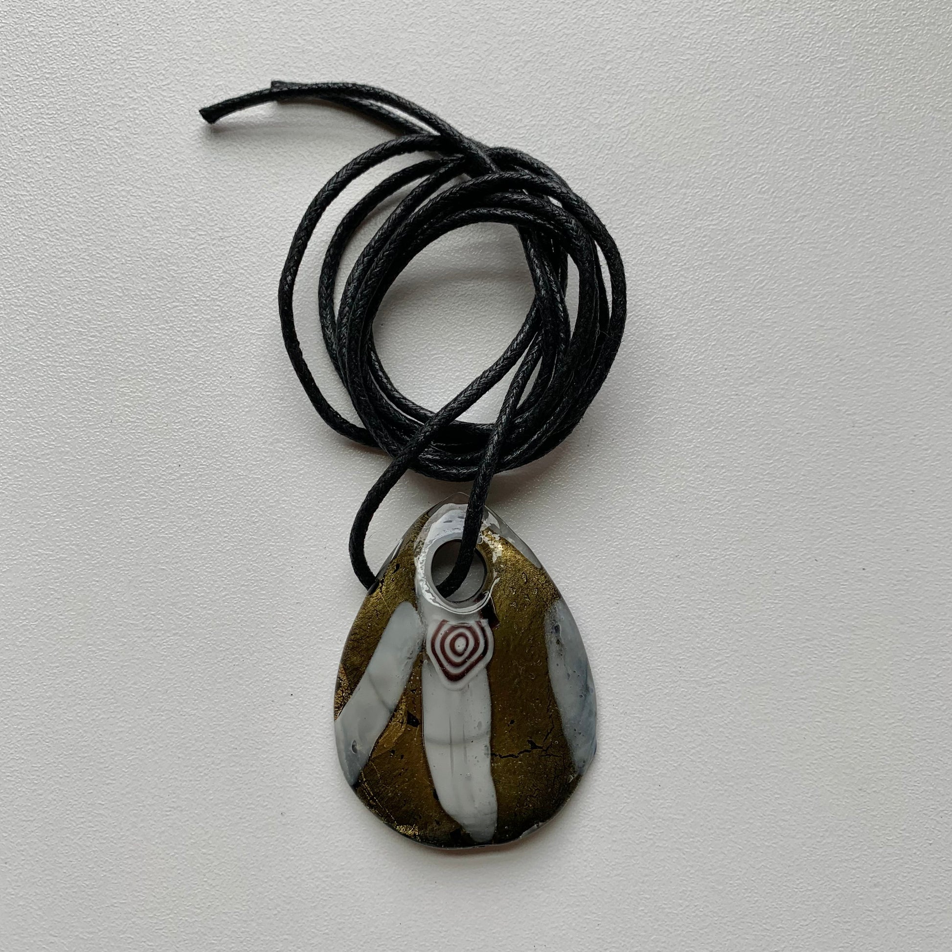 Vintage glass pendant necklace. Black, gold and white pendant on black string. Good condition. Measures 40 inches long and can be worn at various lengths due to simple tie closure. Pendant measures 2 inches tall by 1.5 inches wide.