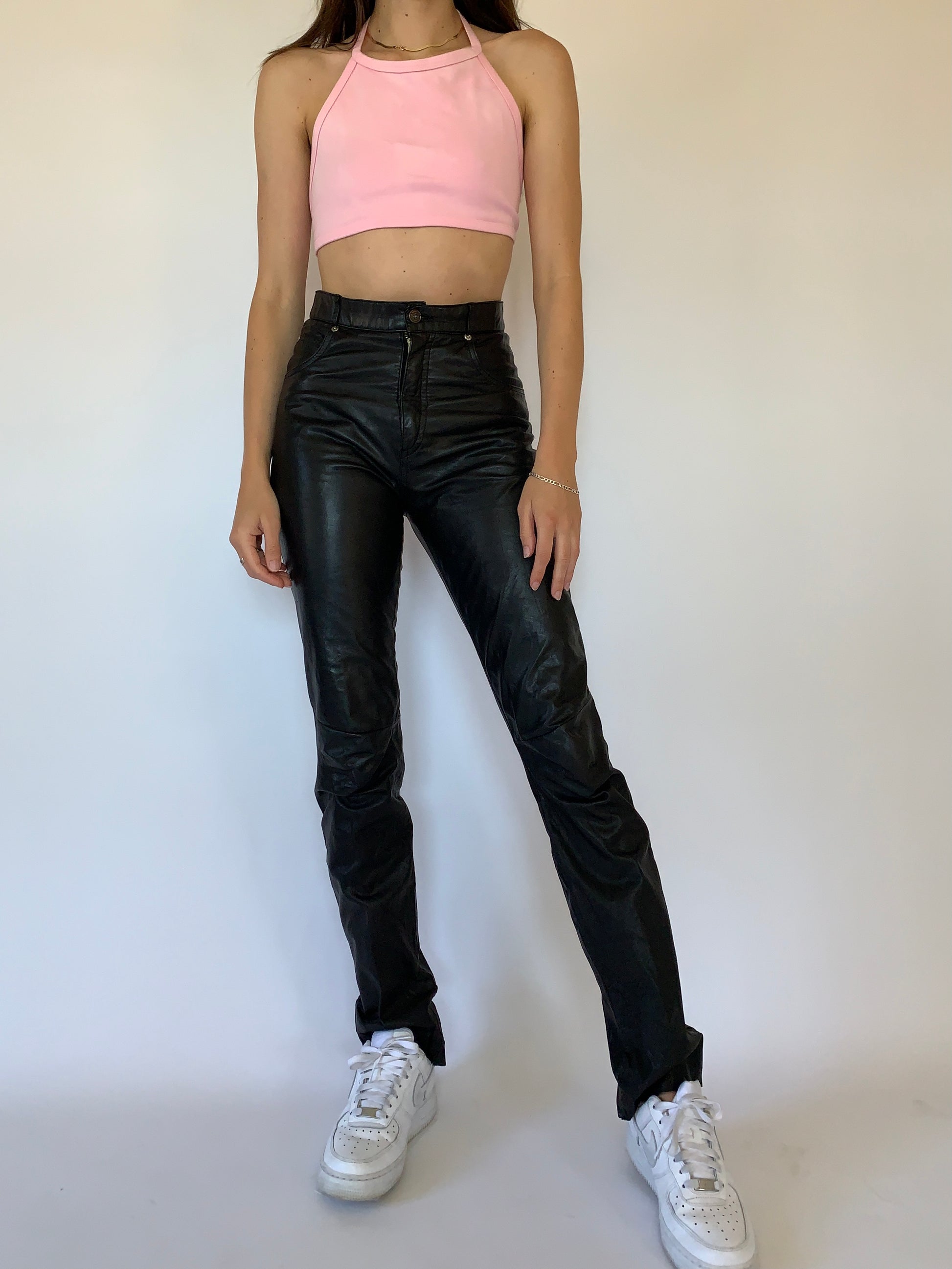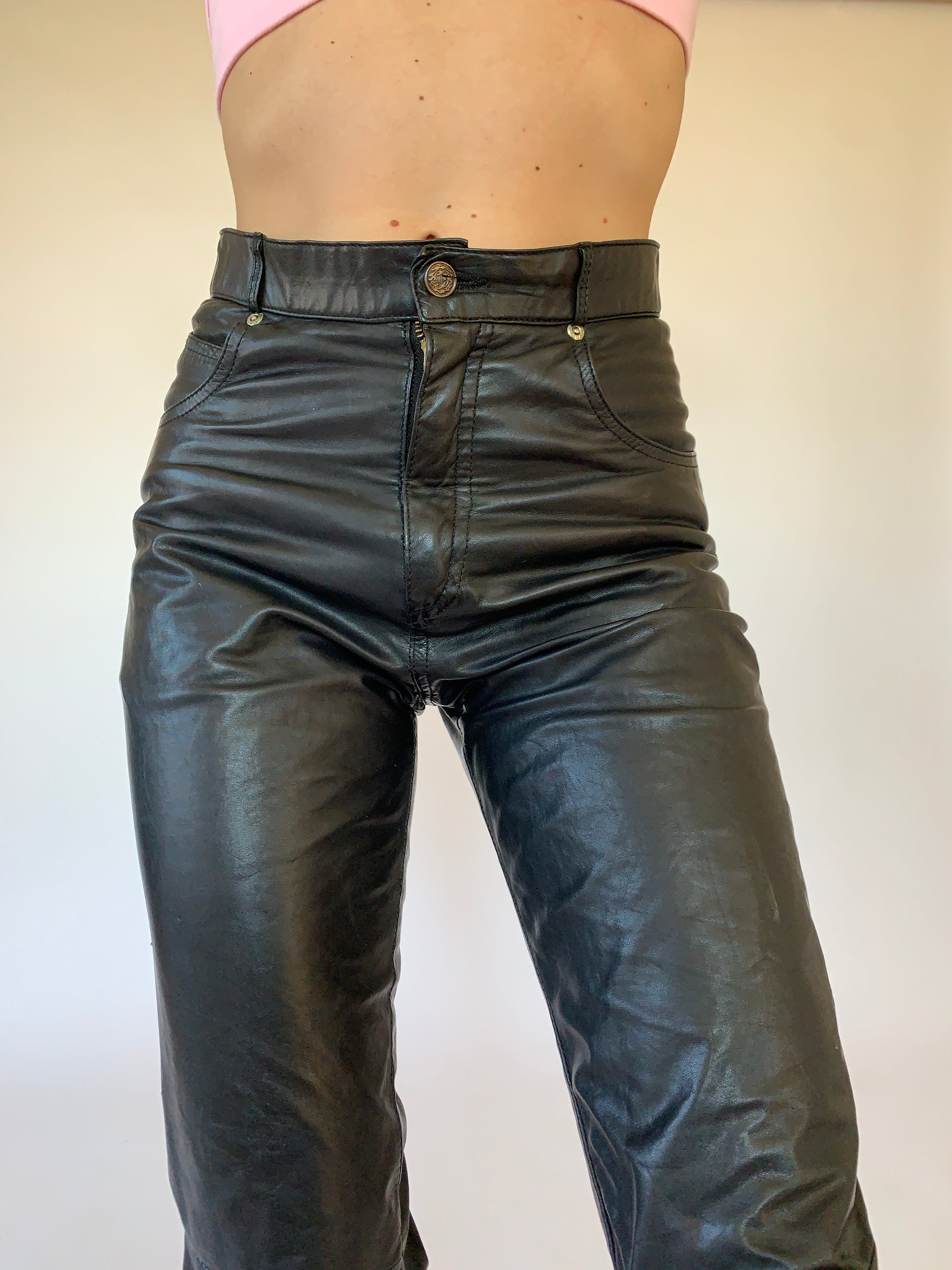 Vintage leather pants. High waisted with a zip fly and slim fit. Black genuine leather. Unlined. In good vintage condition with raw hem and some wrinkling to the leather. Best fits 25-26” waist.