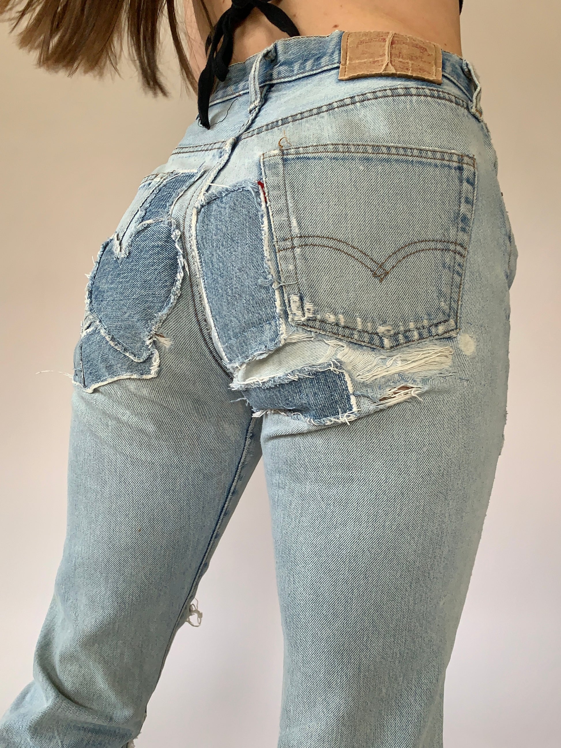 Vintage 1970s/1980s Levi’s 501 jeans. High rise with a five button fly and tapered leg. In a light wash. Distressed condition with alterations, patchwork, holes, and cut pockets. Best fits 27” waist.
