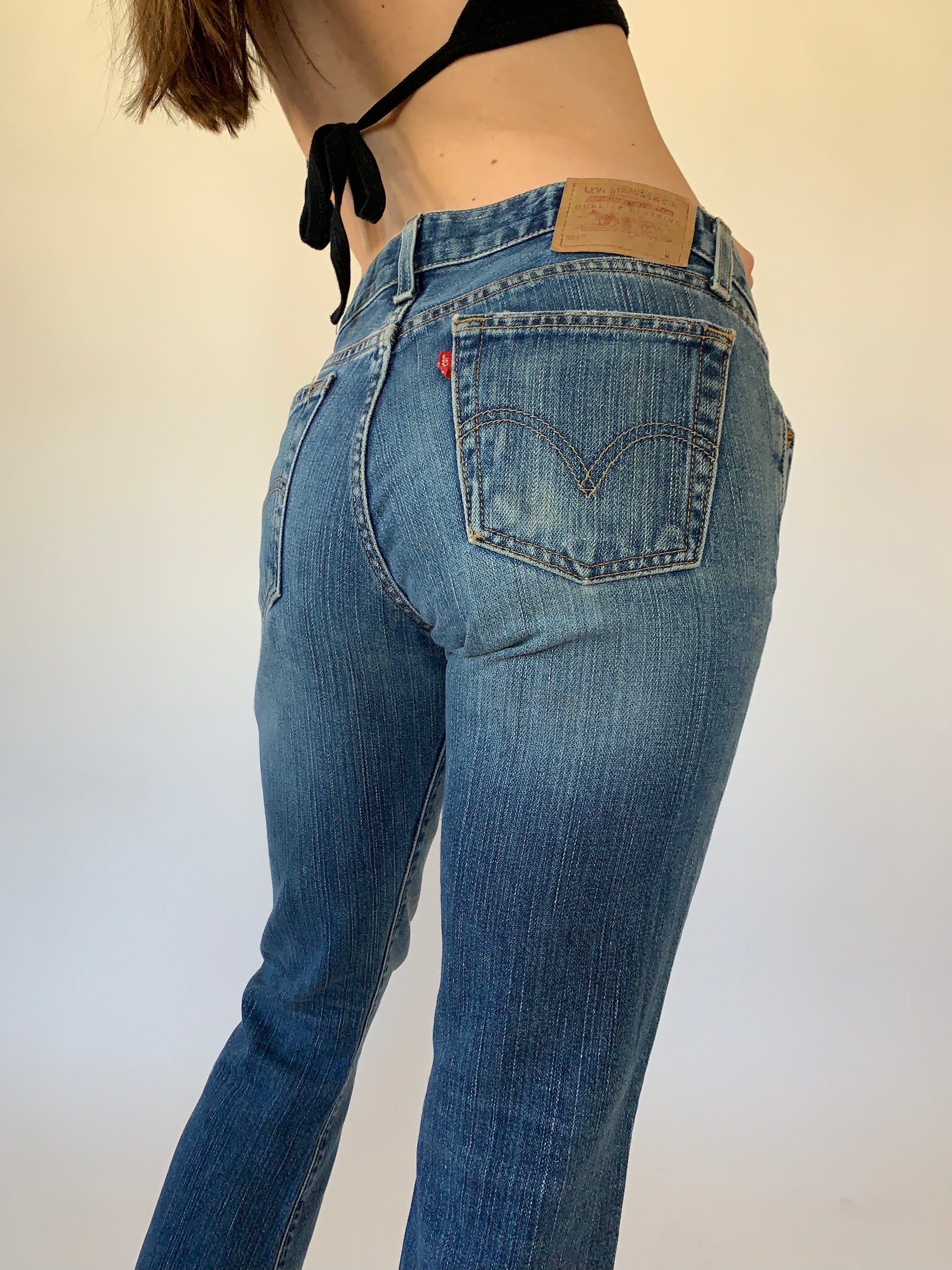 Late 1990s/Early 2000s Levi’s 524 jeans. Low rise with flare. In a medium dark wash. In distressed vintage condition with discoloration and split hem. Best fits 31-32” waist at low rise.