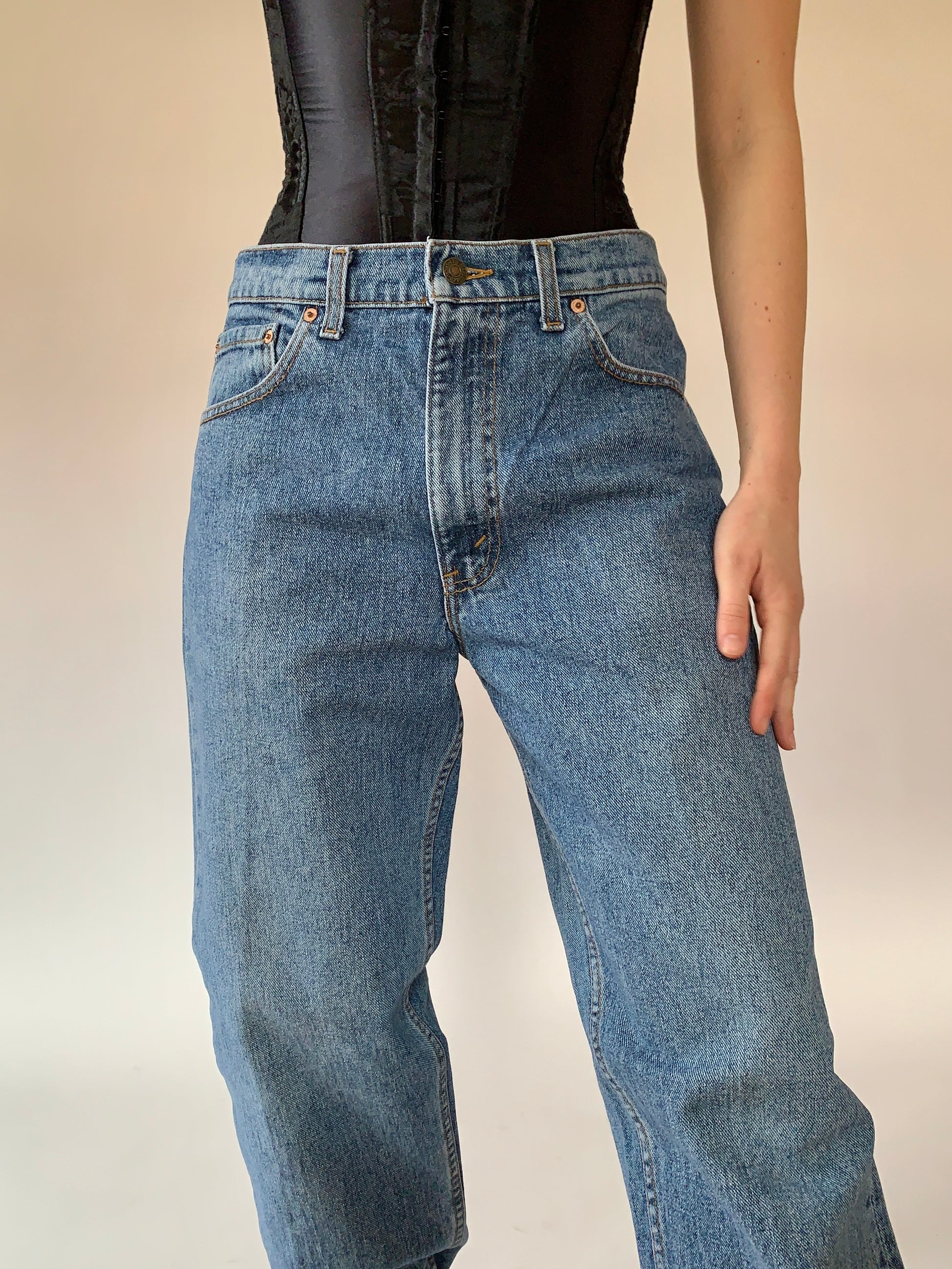 Vintage 1990s Levi’s 550 jeans. High rise with a zip fly and tapered leg. In a medium wash. 100% cotton denim. Made in USA. Excellent condition. Tagged W33 L36.