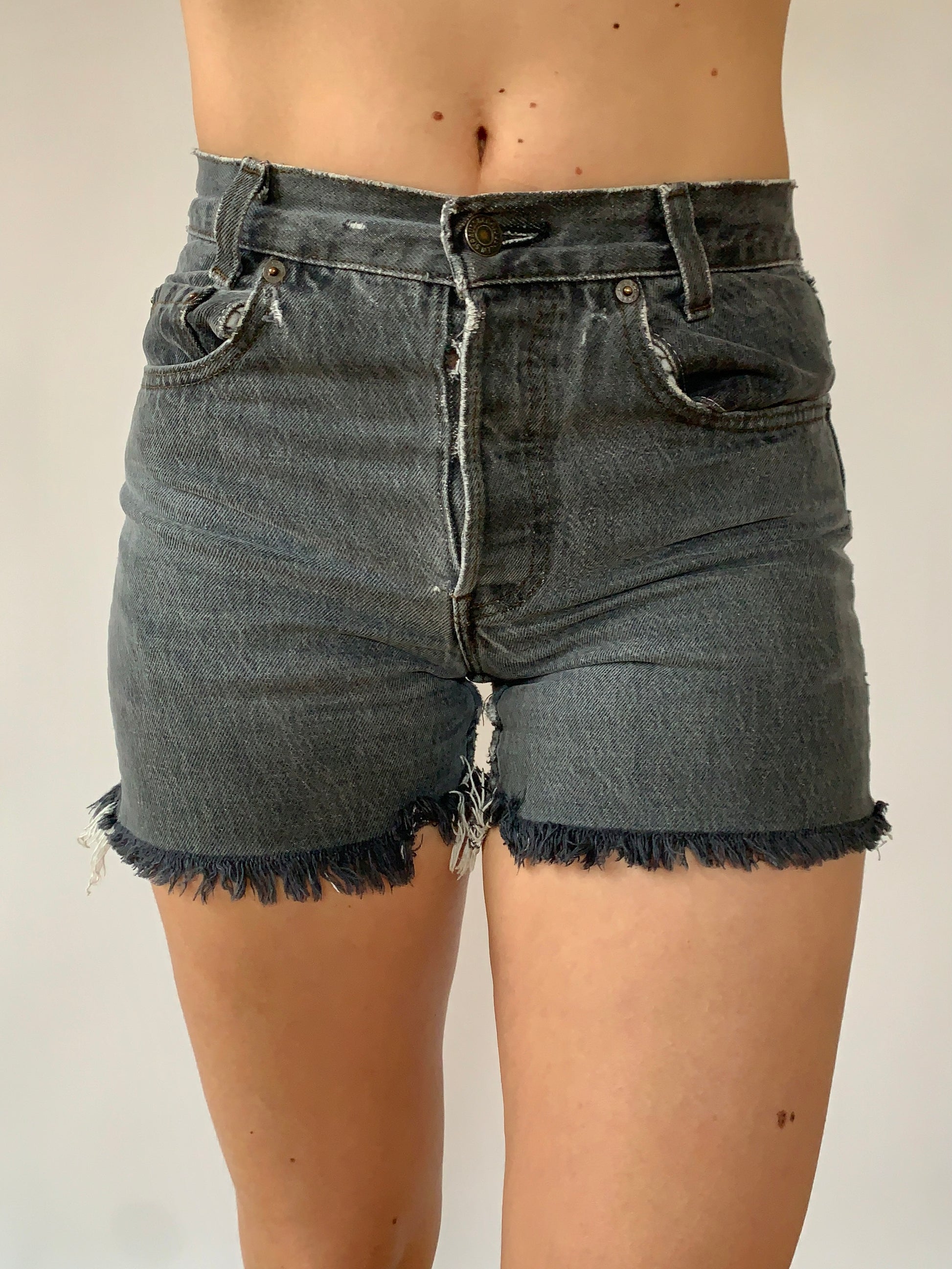 Vintage 1980s Levi’s cutoff shorts. Mid rise with a four button fly. In a gray wash. 100% cotton denim. Made in USA. Distressed condition with visible wear such as disconnected belt loop, holes, and fraying. Tagged W27, but best fits 24-25” waist.