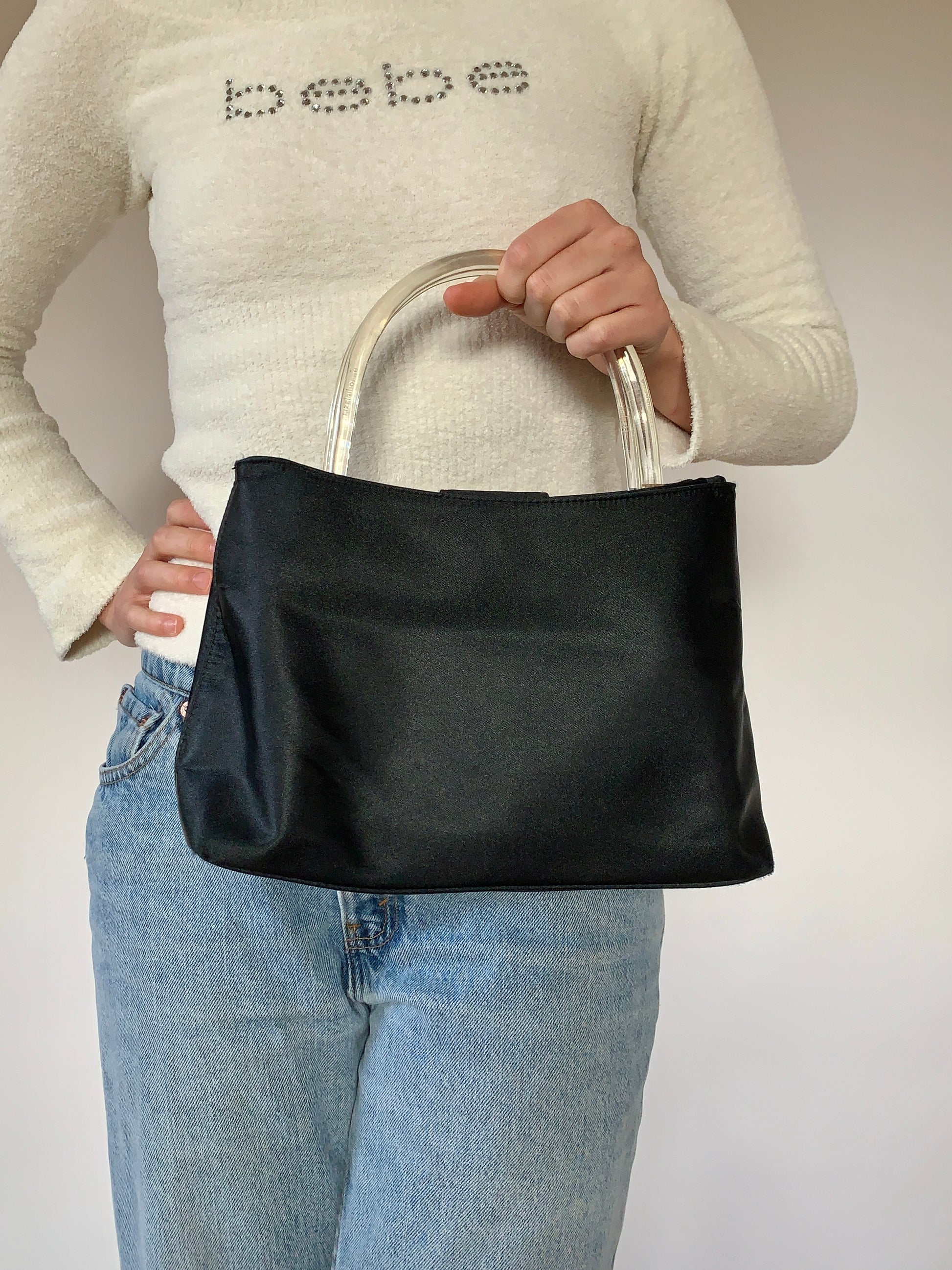 Vintage Liz Claiborne bag. In black satin with lucite handles. Good condition. Body measures 11 inches wide by 7 inches tall.