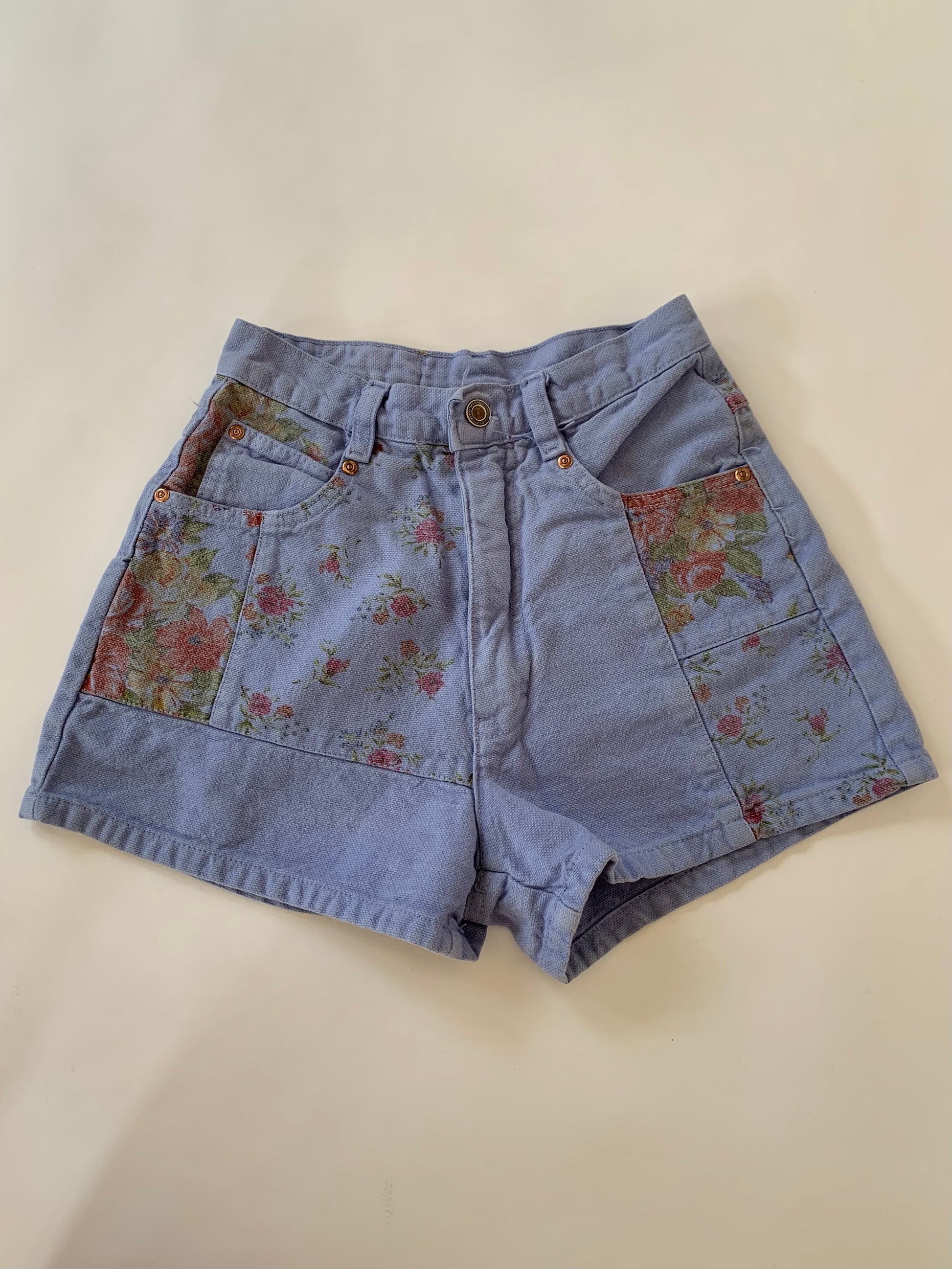 Vintage Michael G. shorts. High waisted with a zip fly. In lavender with floral detail. Material is 100% cotton. Made in USA. In excellent vintage condition. Tagged size 5, but best fits 24-25” waist.