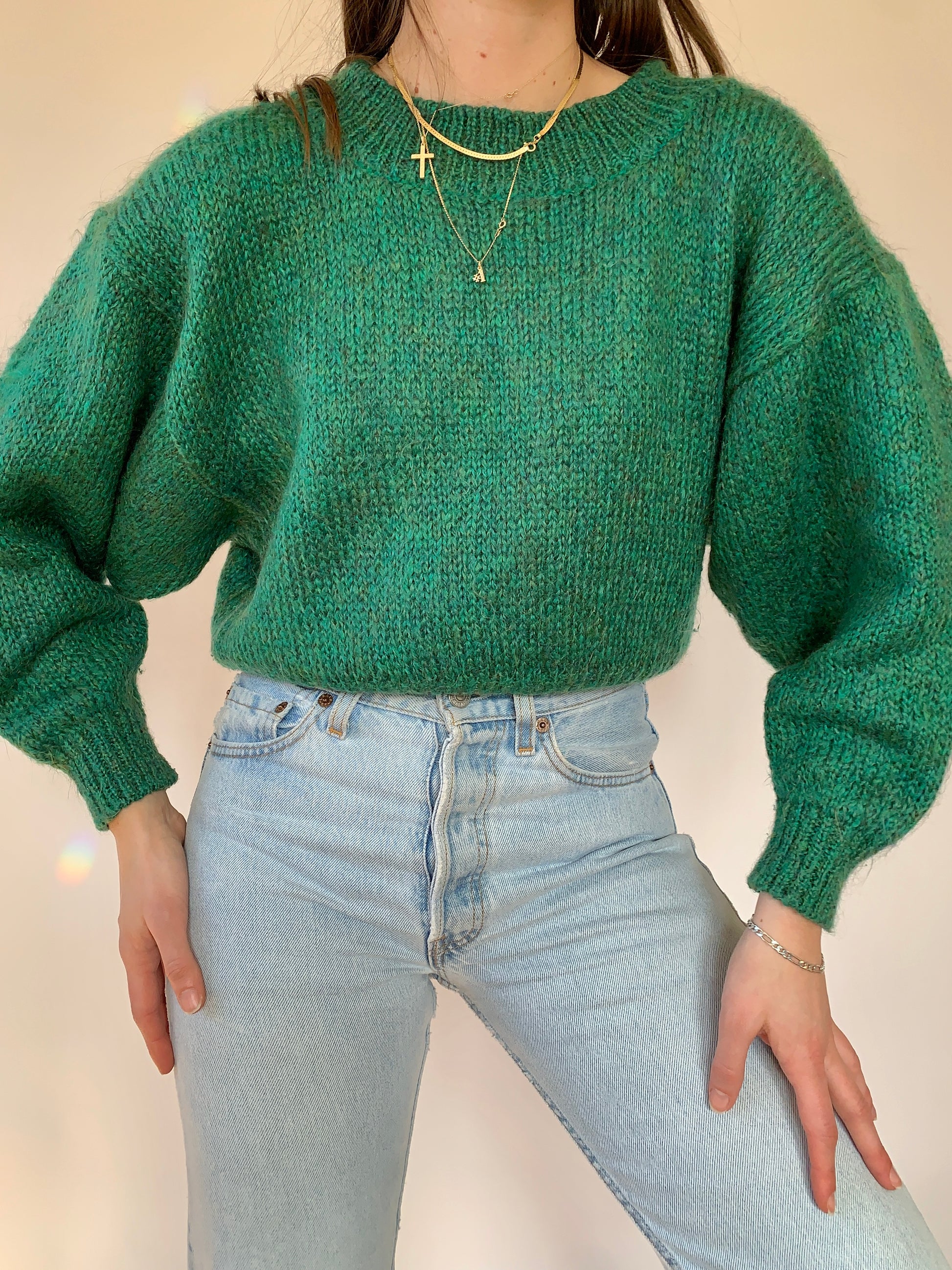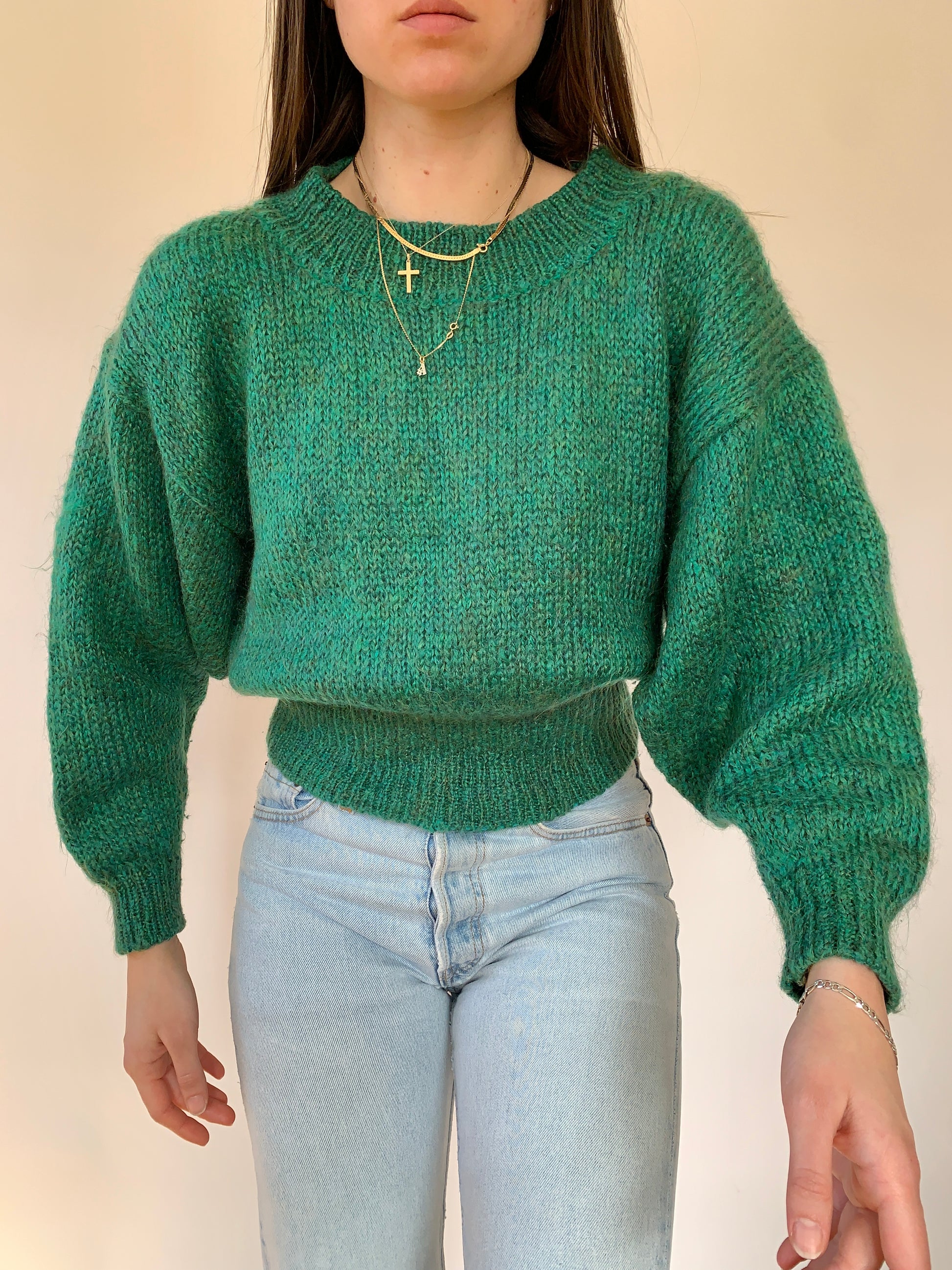 Vintage knit mohair sweater. In green. Excellent condition. Tagged size M. Shown on size XS.