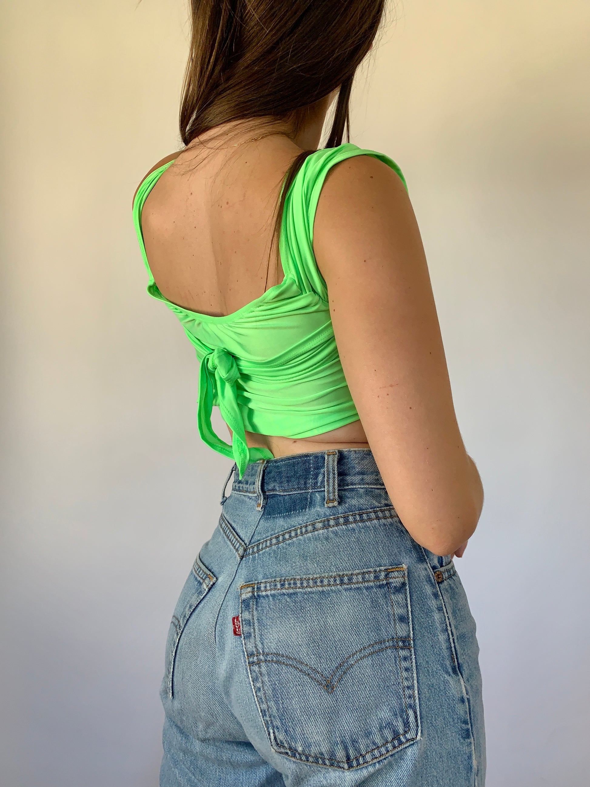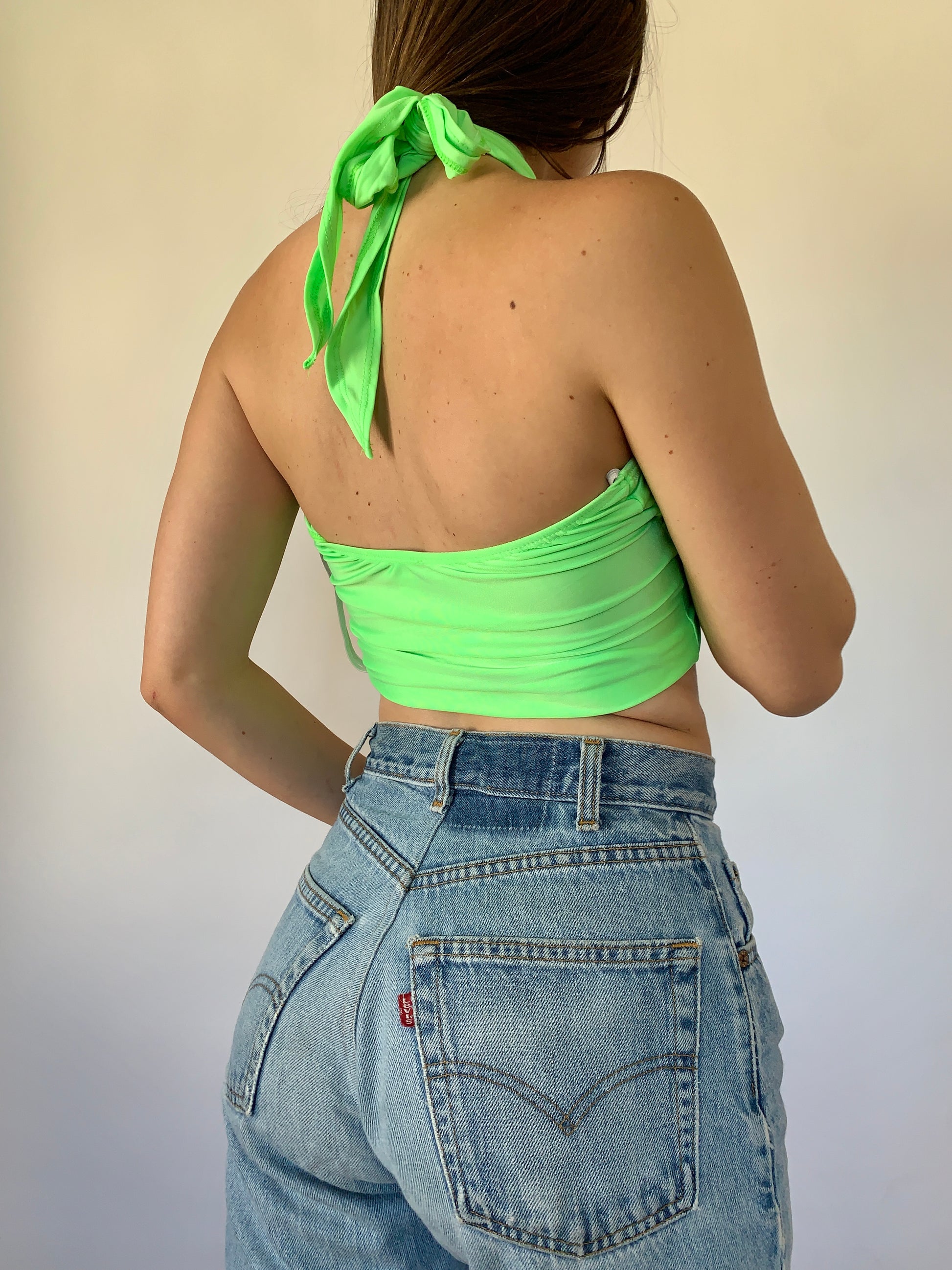 Vintage 1990s neon green wrap top, made by Cheryl Creations. Can be styled in a multitude of ways. Material is a nylon lycra blend with stretch. Made in USA. Excellent condition. No size labeled. Shown on size small.