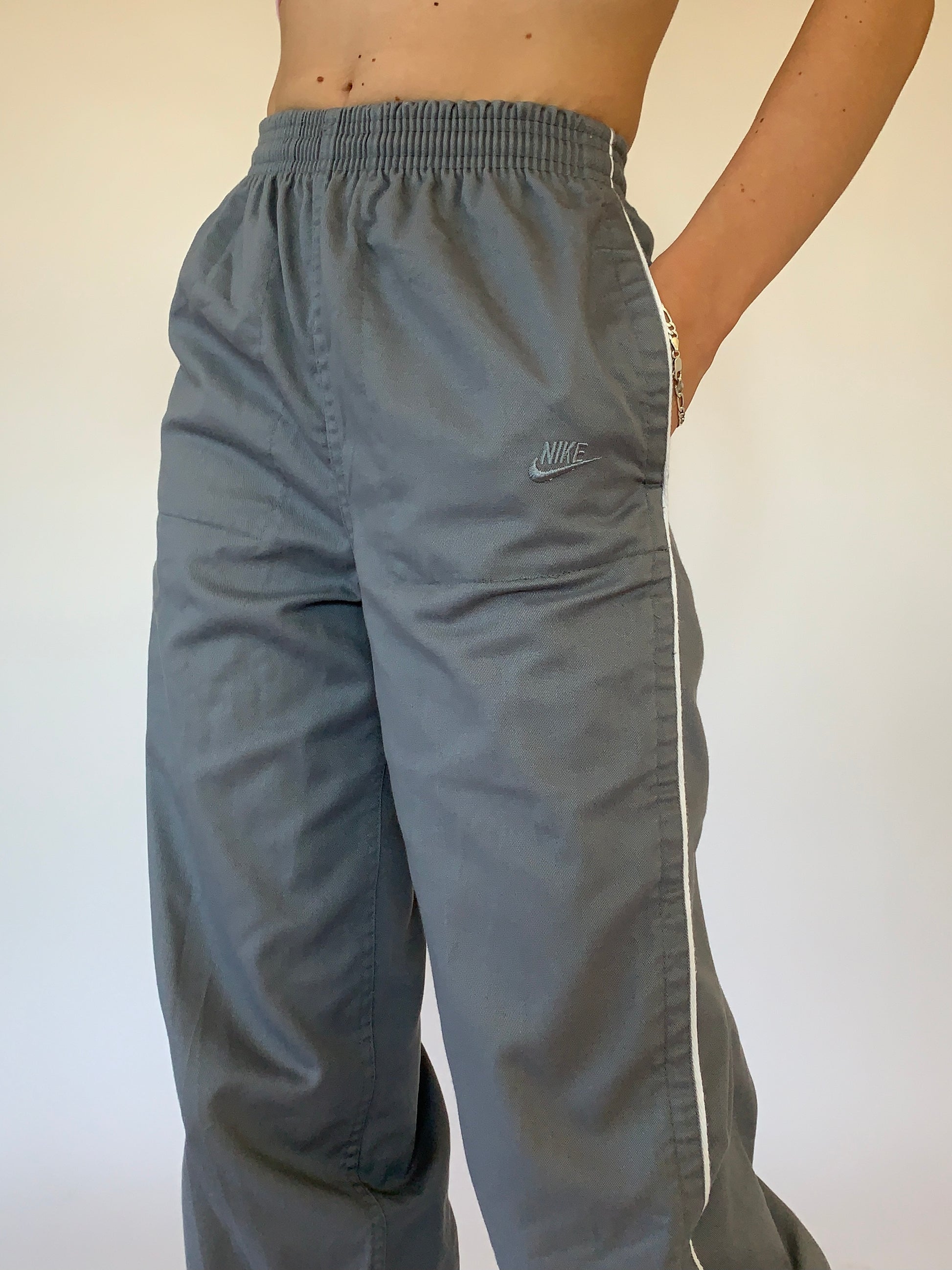Vintage Nike track pants. High waisted with an elastic waistband and straight leg. In grey and white. Material is a poly cotton blend. Made in USA. In excellent vintage condition. Tagged size S, best fits XXS-XS frames.