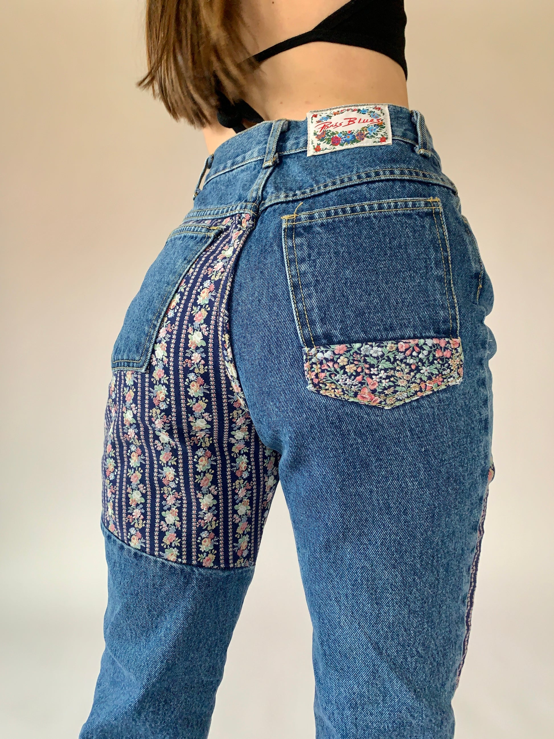 Vintage 1980s/90s patchwork Paris Blues jeans. High waisted with a tapered leg. Made in USA. Excellent condition. Tagged size 9, best fits 26” waist.