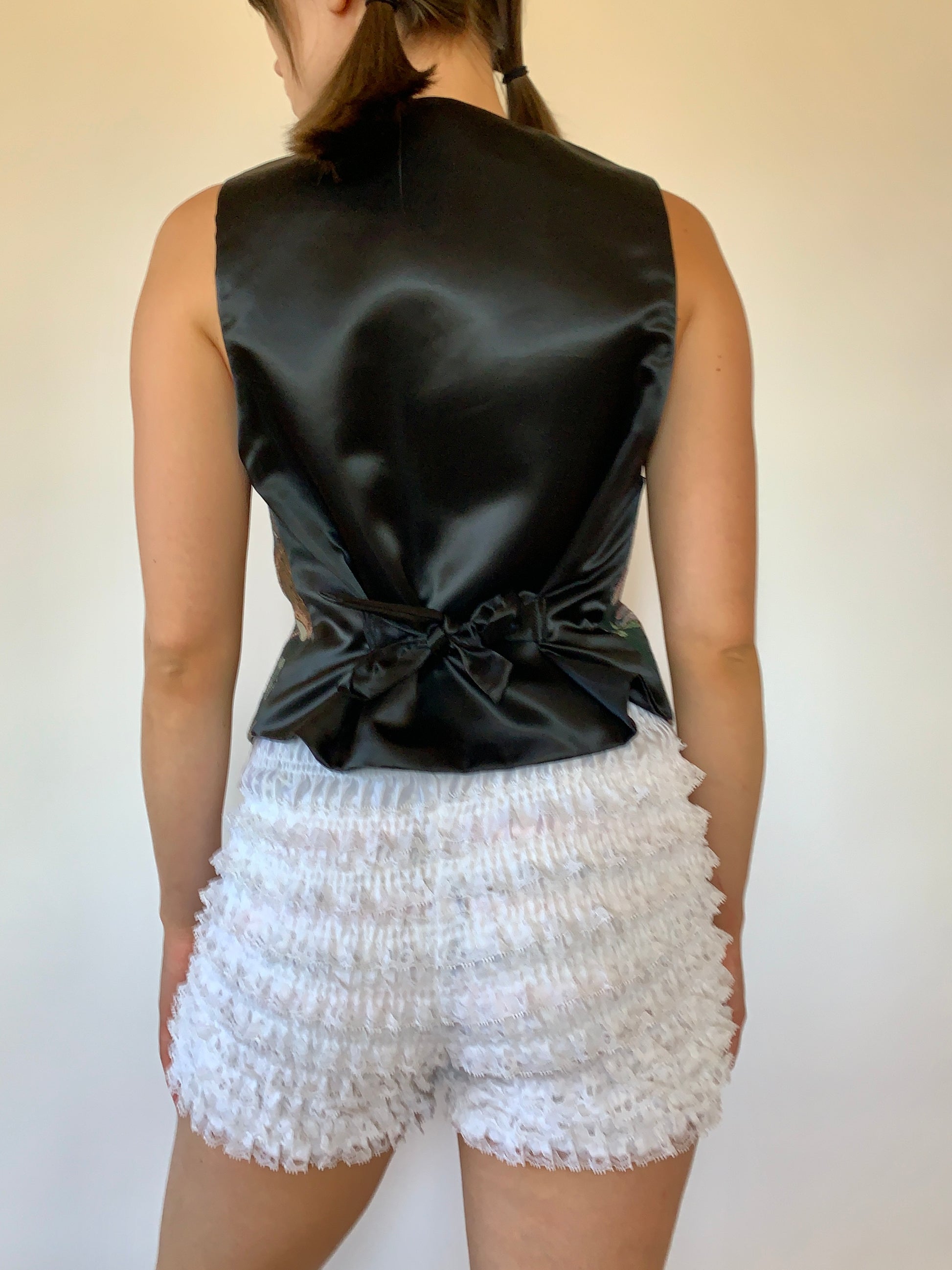 - No size labeled, fits like a S-M, ties in the back to fit your waist