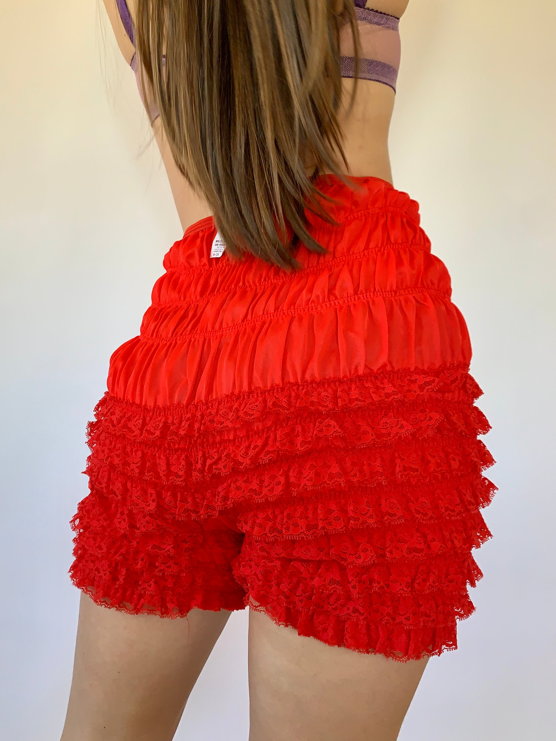 Vintage ruffle bloomers in red. Made by Partners Please Malco Modes. Material is nylon. Made in USA. Excellent condition. Tagged XL, but best fits 26-28” waist.
