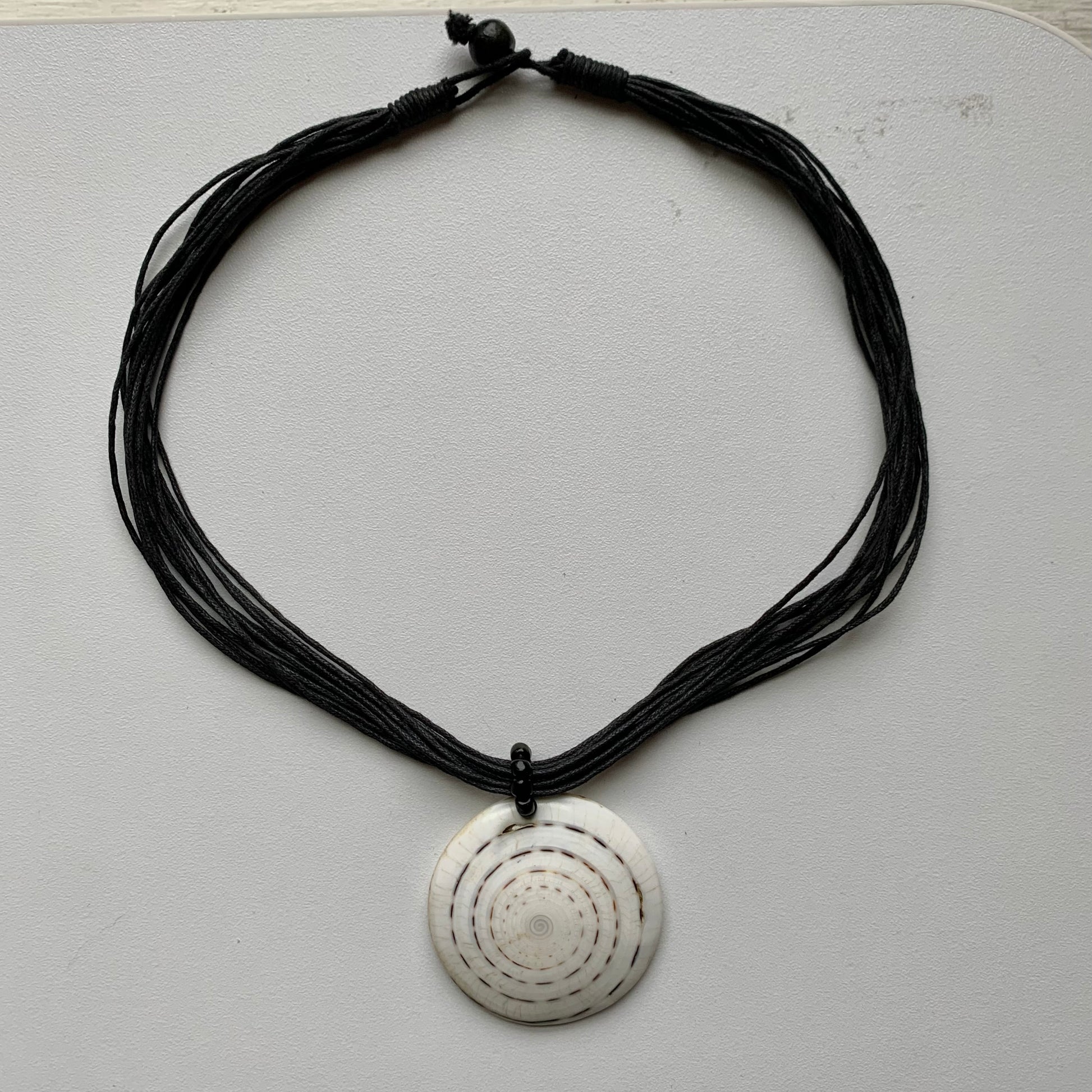 Vintage shell necklace. On layered black string. Good condition. Measures 18 inches long when unclasped.