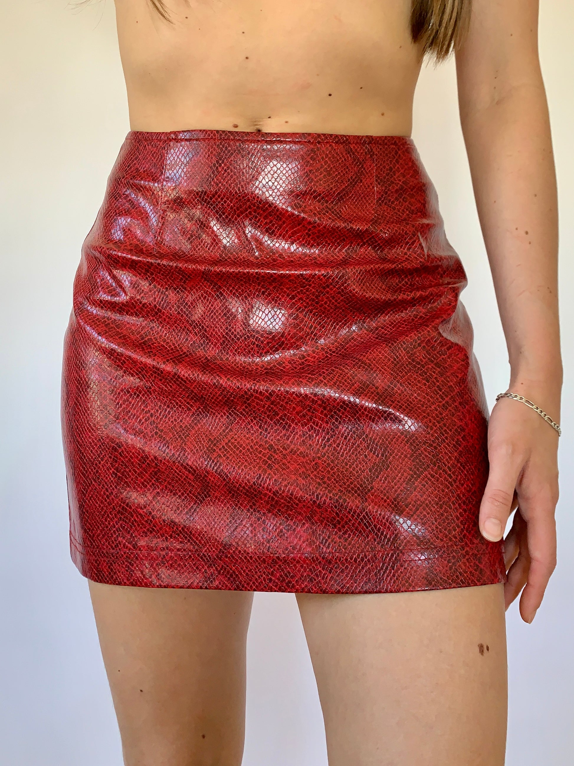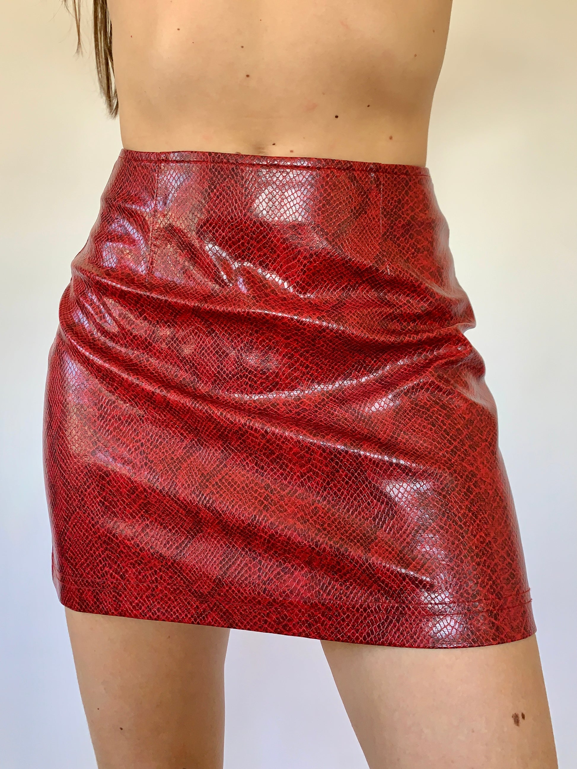 Vintage 1990s snake print mini skirt by XOXO. In red. Material is a pvc/cotton/polyurethane blend. Made in USA. Excellent condition. Tagged size 5, best fits 25-26” waist.