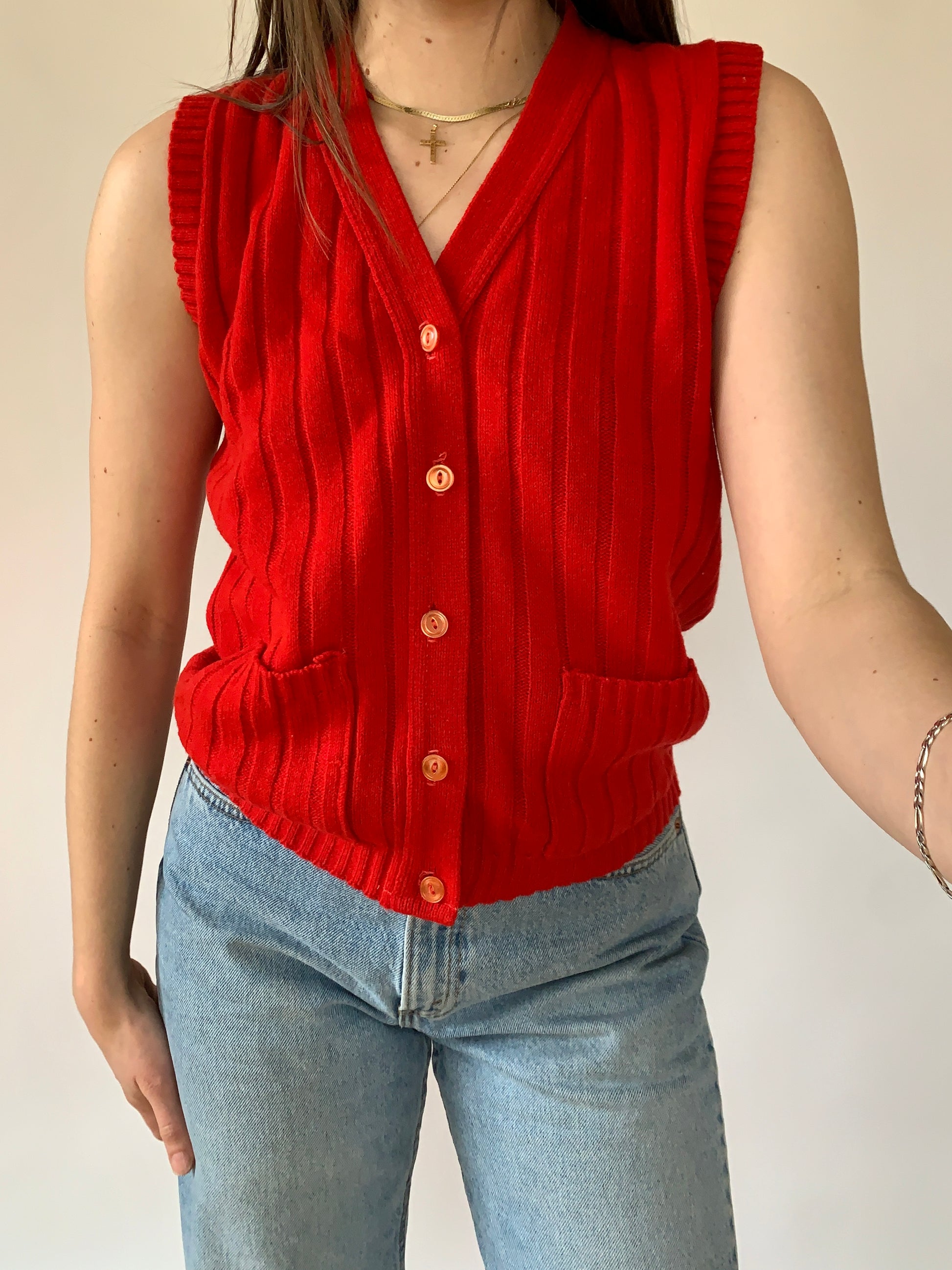 Vintage 1980s sweater vest. In red. Material is acrylic. Made in USA. Excellent condition. Best fits size XS-S. Shown on size XS.