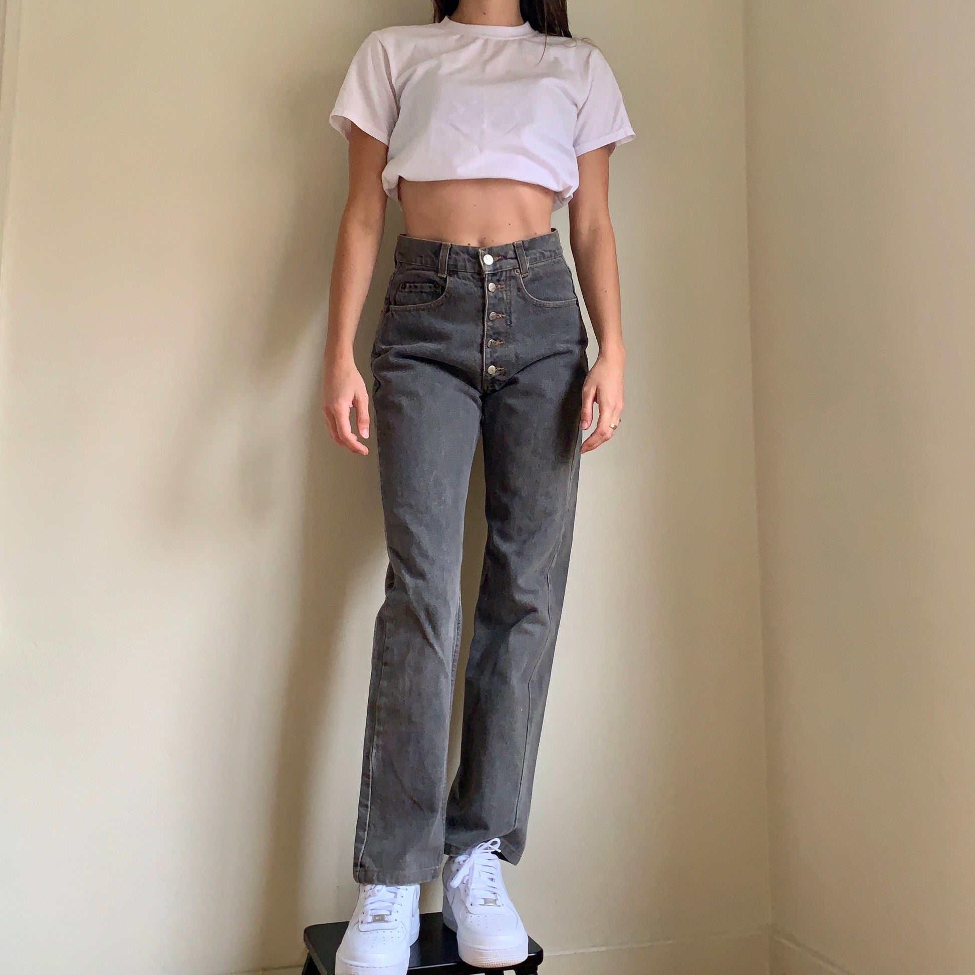 Vintage Valentino jeans. High waisted with an exposed button fly and straight leg. In a faded gray wash. 100% cotton denim. Made in Italy. In excellent vintage condition. Tagged size 29, but best fits 27” waist.