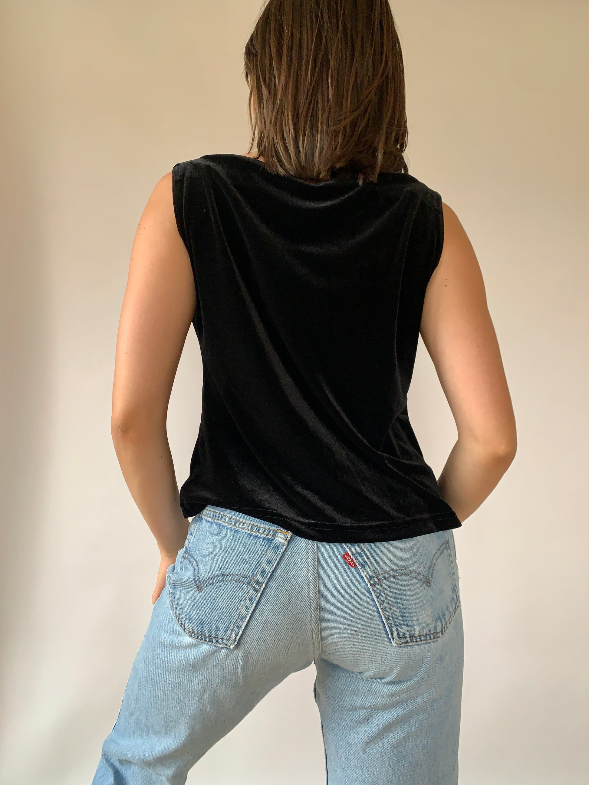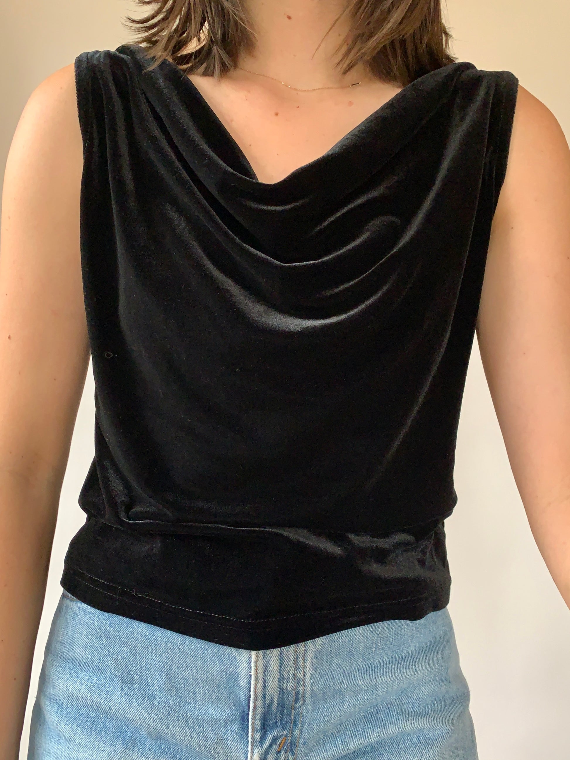Vintage 1990s black velvet cowl neck tank, by Fiore. Made in USA. Excellent condition. No size labeled, recommended for size S-M. Shown on size S.