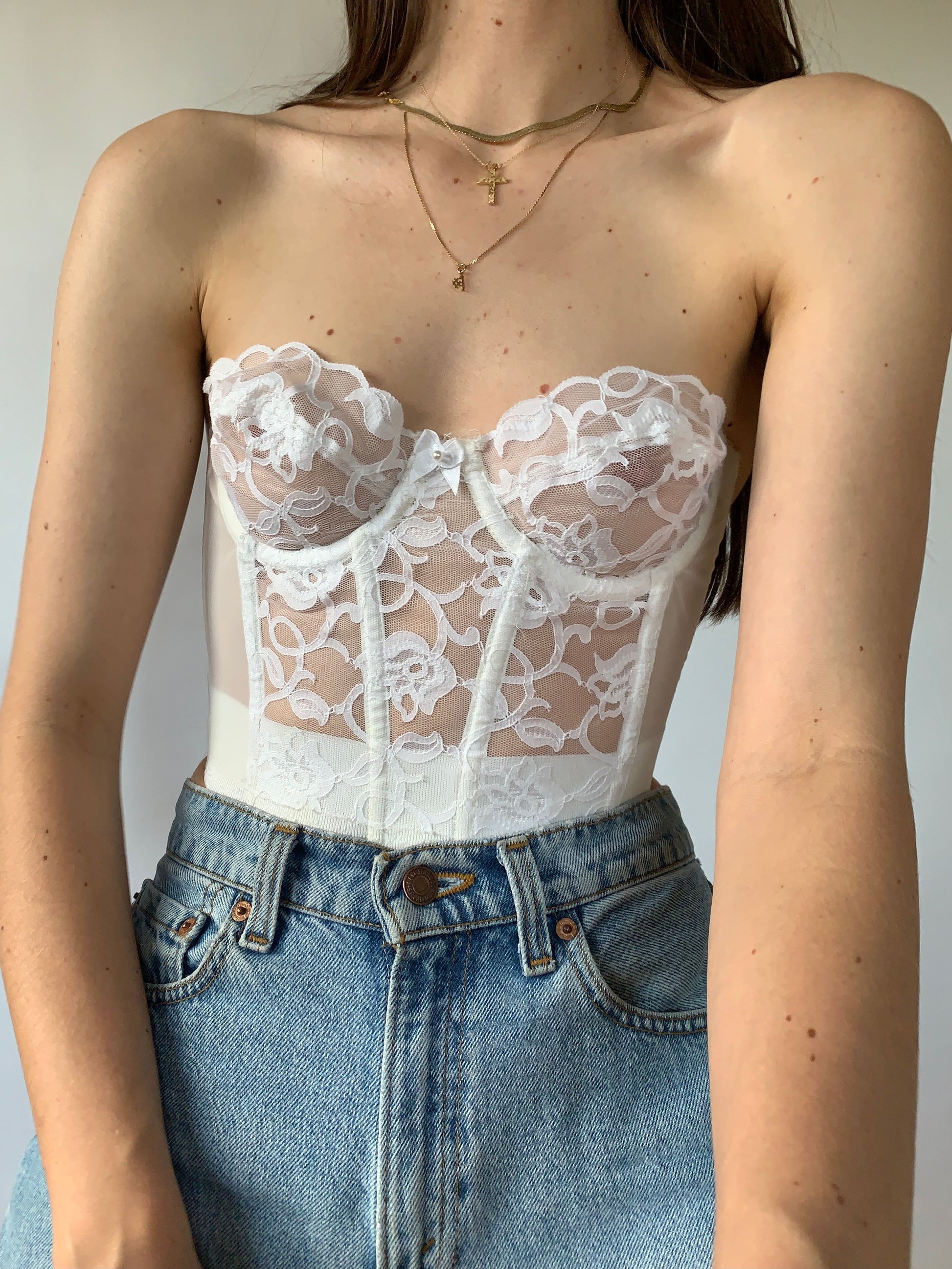 Vintage 1980s Victoria’s Secret lace bustier. Strapless fit with all over lace. In white. Material is a poly/nylon/spandex blend. Union made in USA. In good condition. Tagged size 32B, best fits size XS. Shown on size XS/32B.