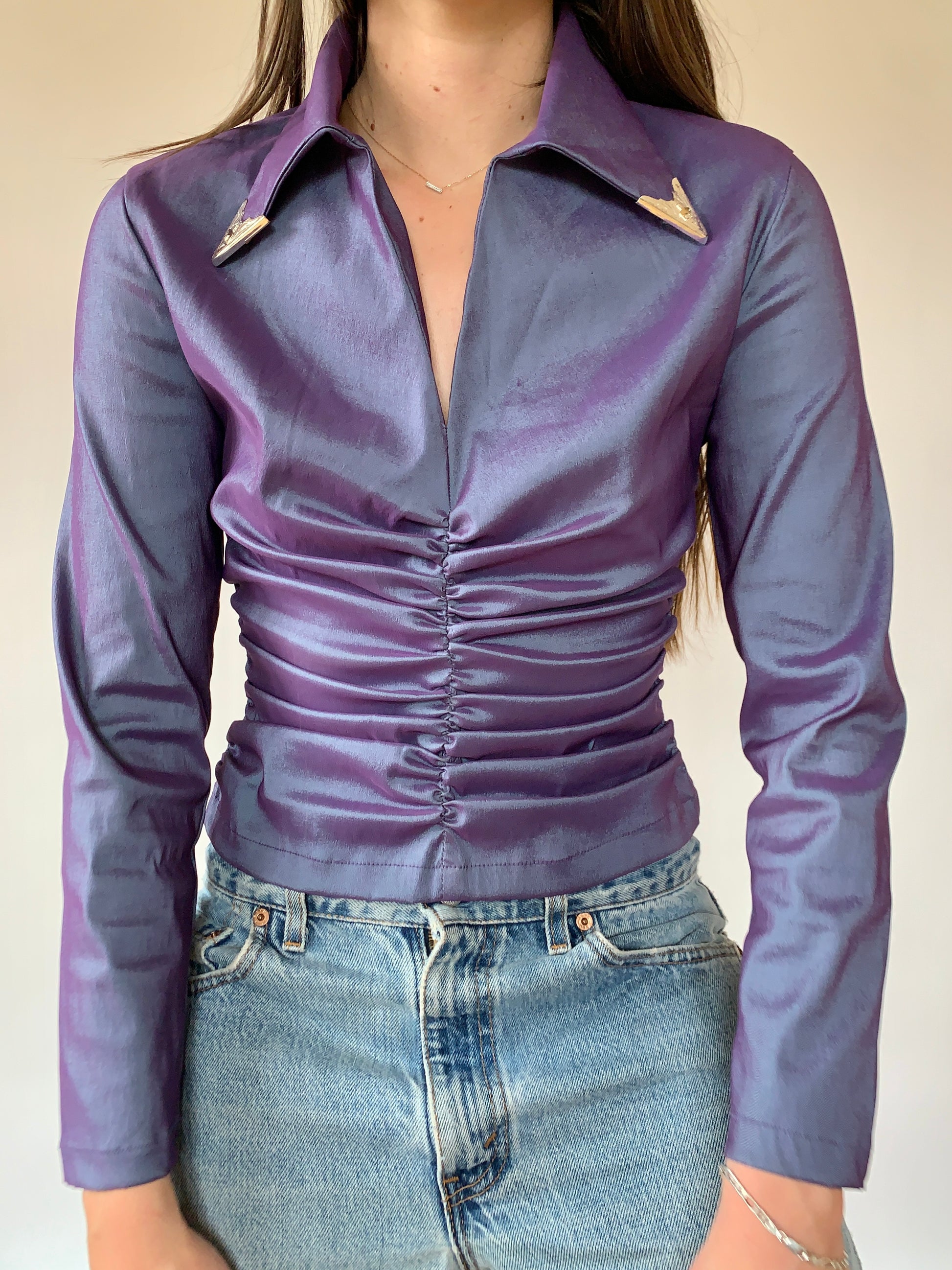 Vintage 1990s western style blouse, made by Tadashi. In purple. Full back zip closure. Material has stretch. Excellent condition. Tagged size 0, best fits size XS-S. Shown on size S.