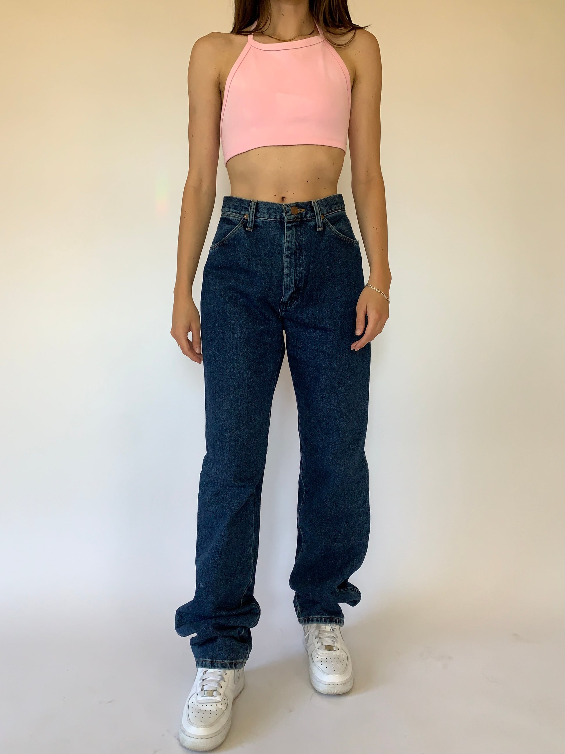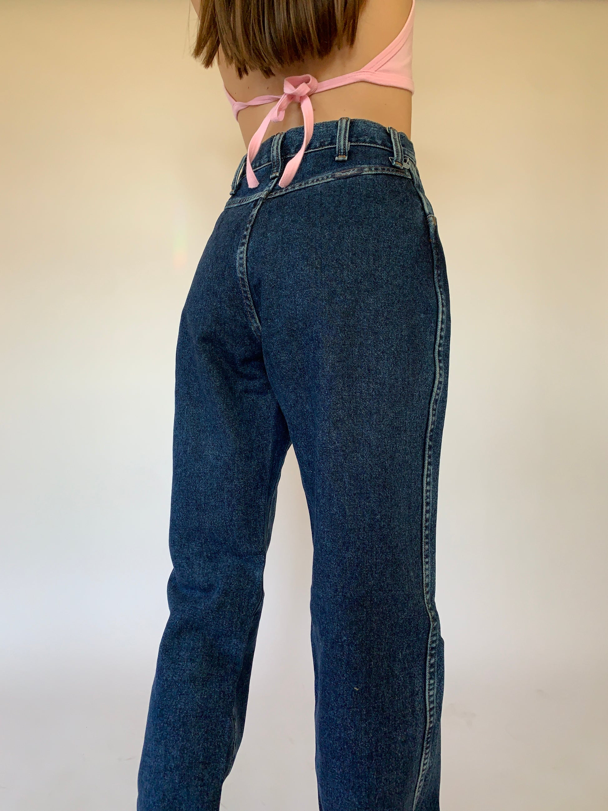 Vintage Wrangler jeans. High waisted with a zip fly and straight leg. In a dark blue wash. 100% cotton denim. Made in USA. In excellent vintage condition. Tagged size 5/6, best fits 26-27” waist.