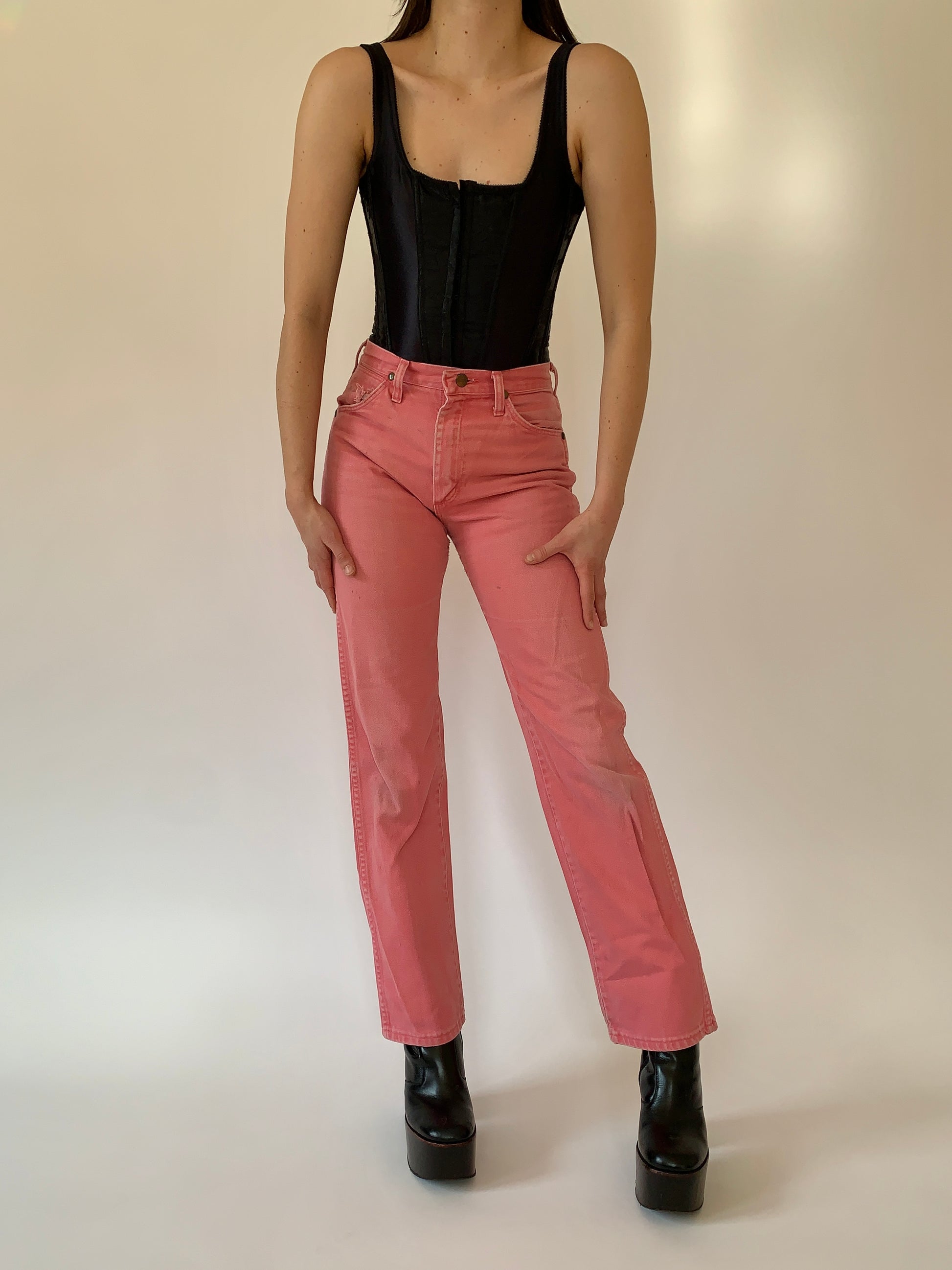 Vintage Wrangler jeans in pink. High waisted with a zip fly and straight leg. Made in USA. In worn vintage condition with visible fading and light discoloration marks.
