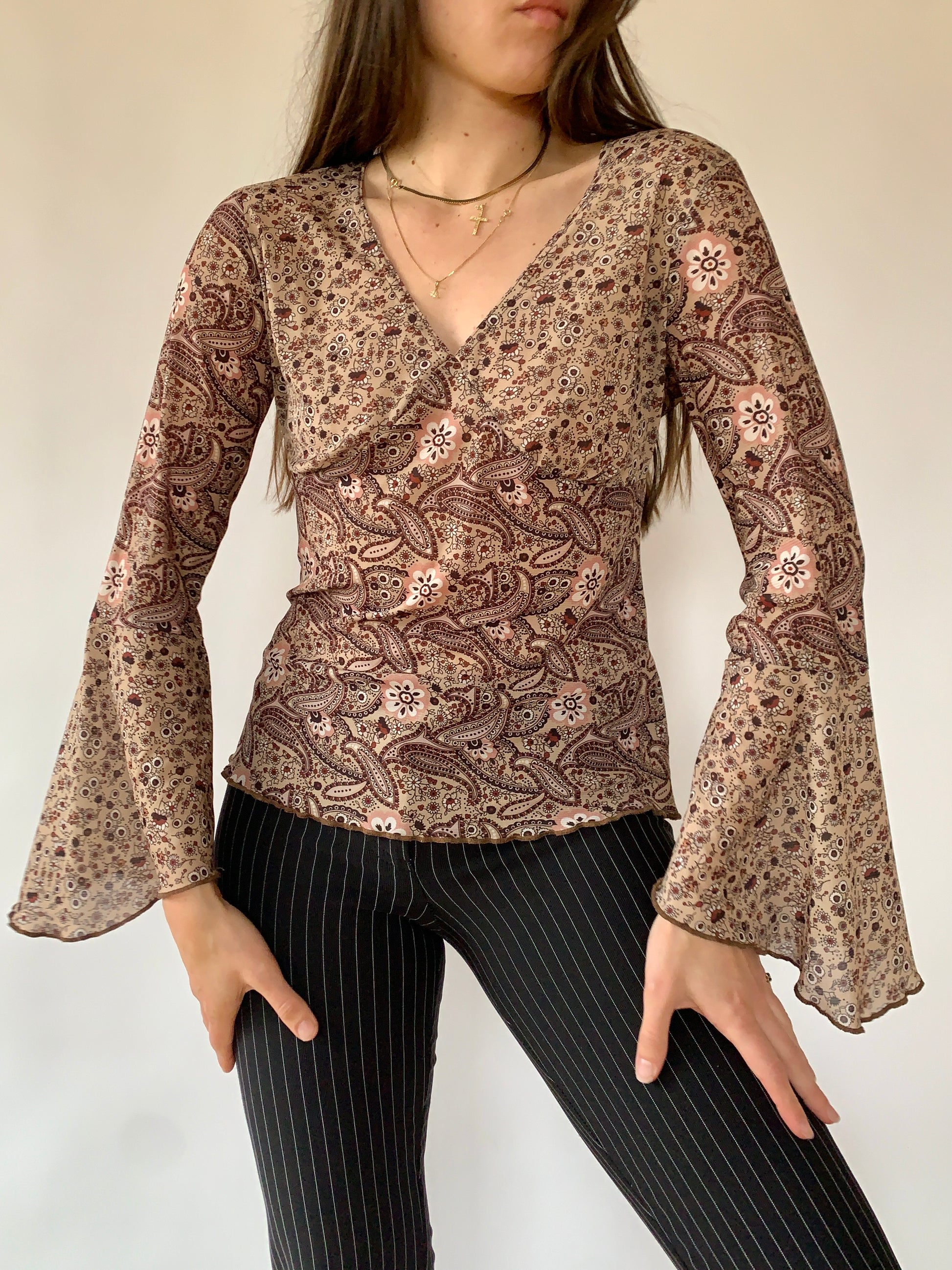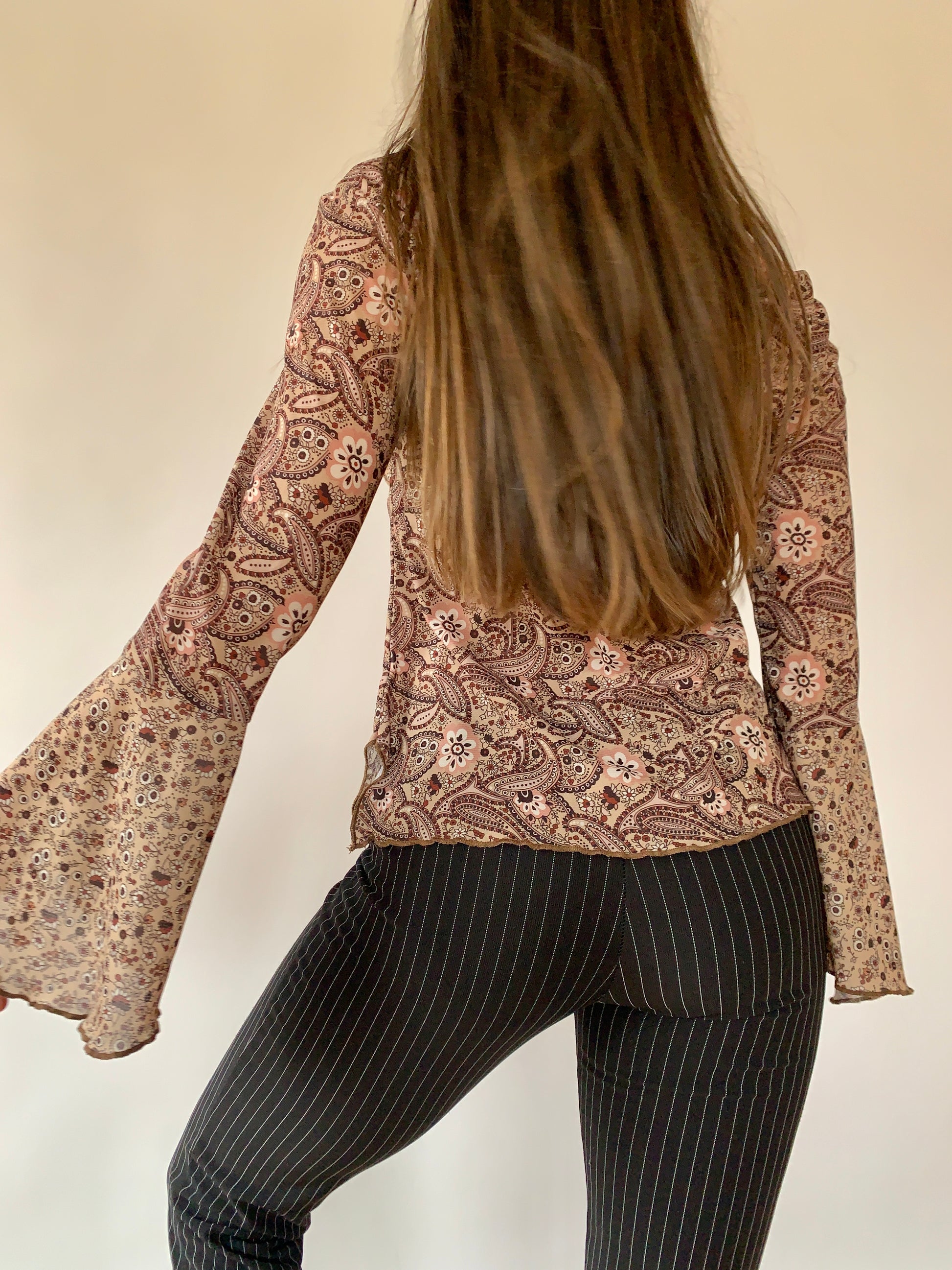 Y2K bell sleeve paisley top by Route 66. In a neutral brown colorway. Material is polyester with stretch. Excellent condition. Tagged size medium. Shown on size XS.