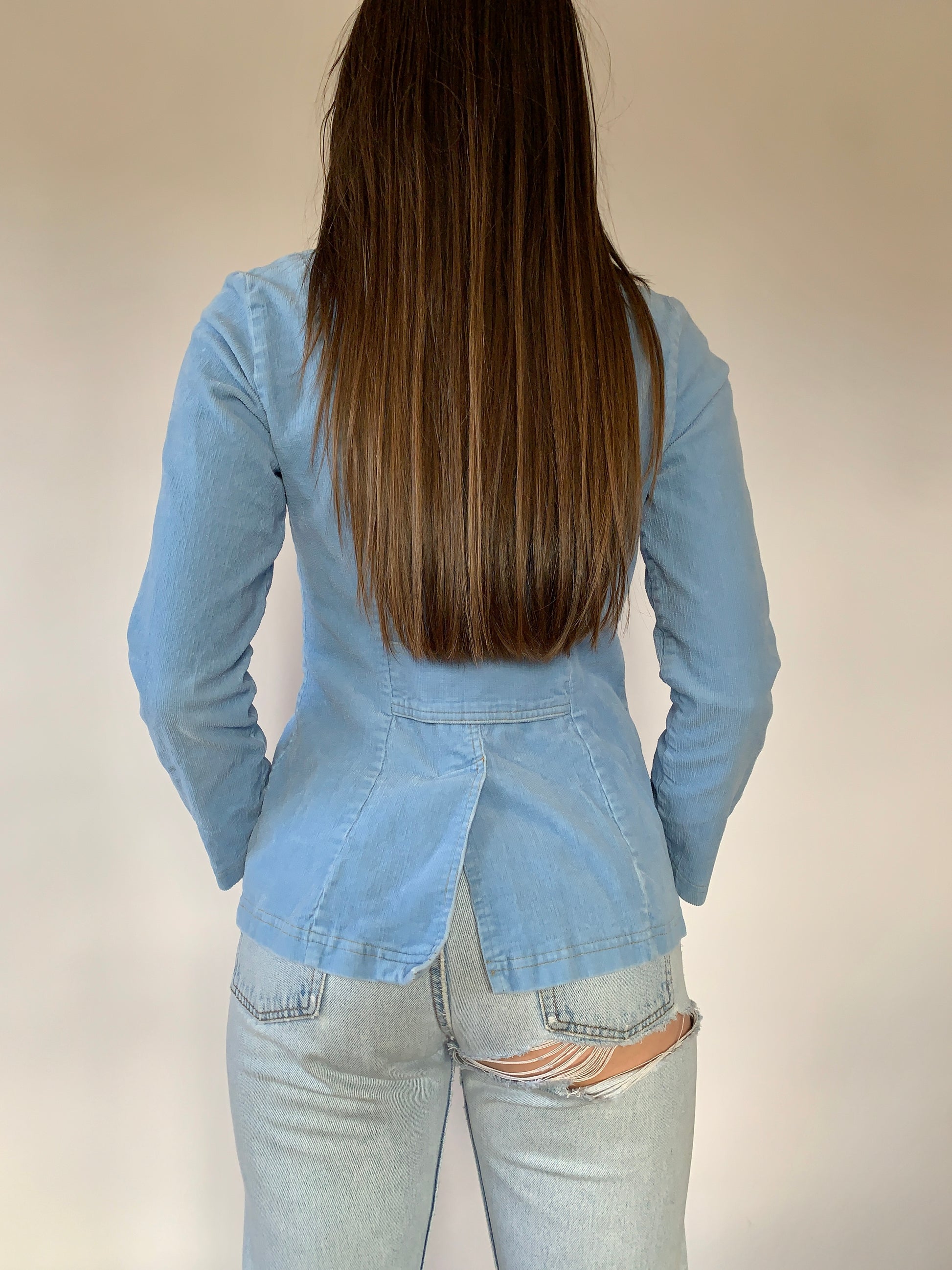 Y2K baby blue corduroy blazer, made by Casual Choice. Material is a cotton spandex blend with stretch. Made in USA. Excellent condition. Tagged size S. Shown on size XS.