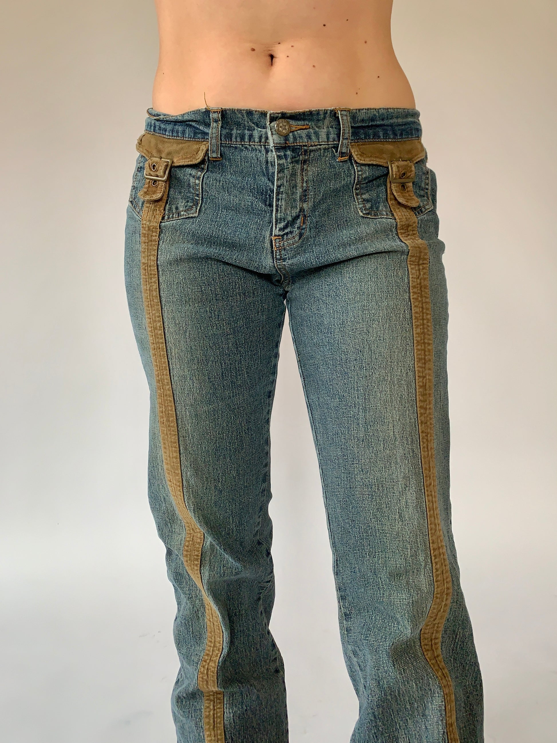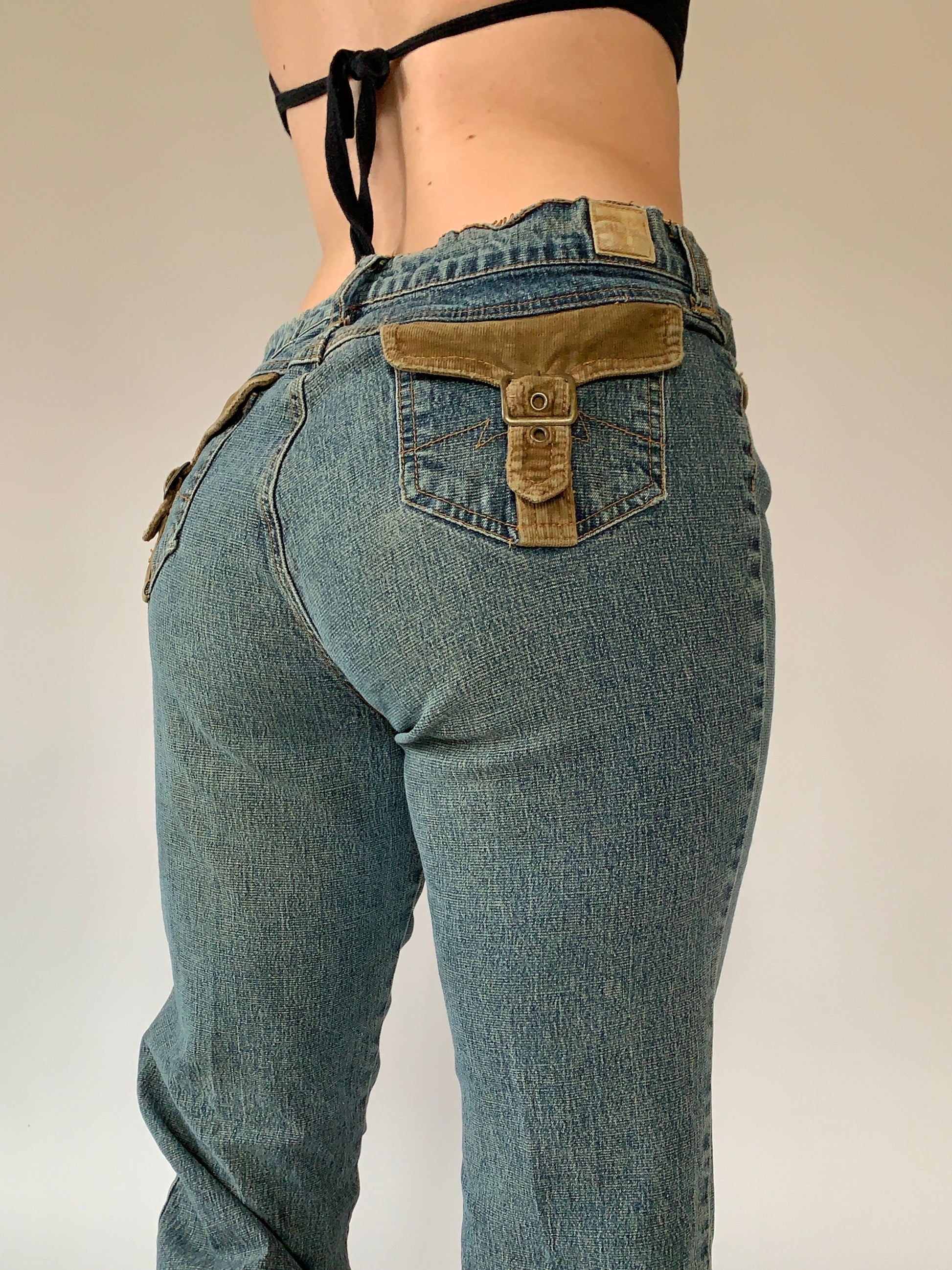 Y2K Bongo jeans. Low rise. In a dark wash with corduroy detail. Material is a ramie/cotton/poly/spandex blend. Great condition. Tagged size 9.