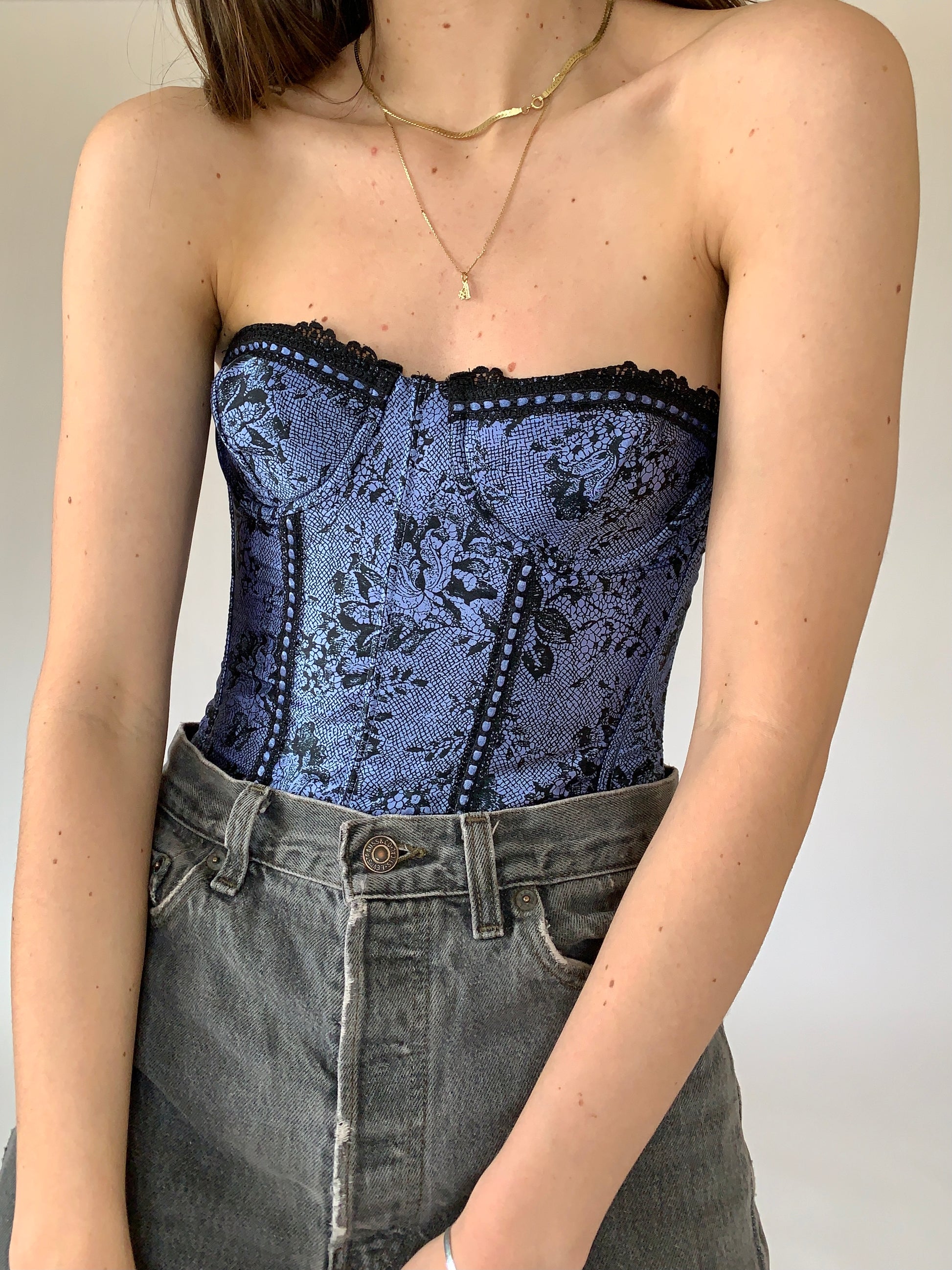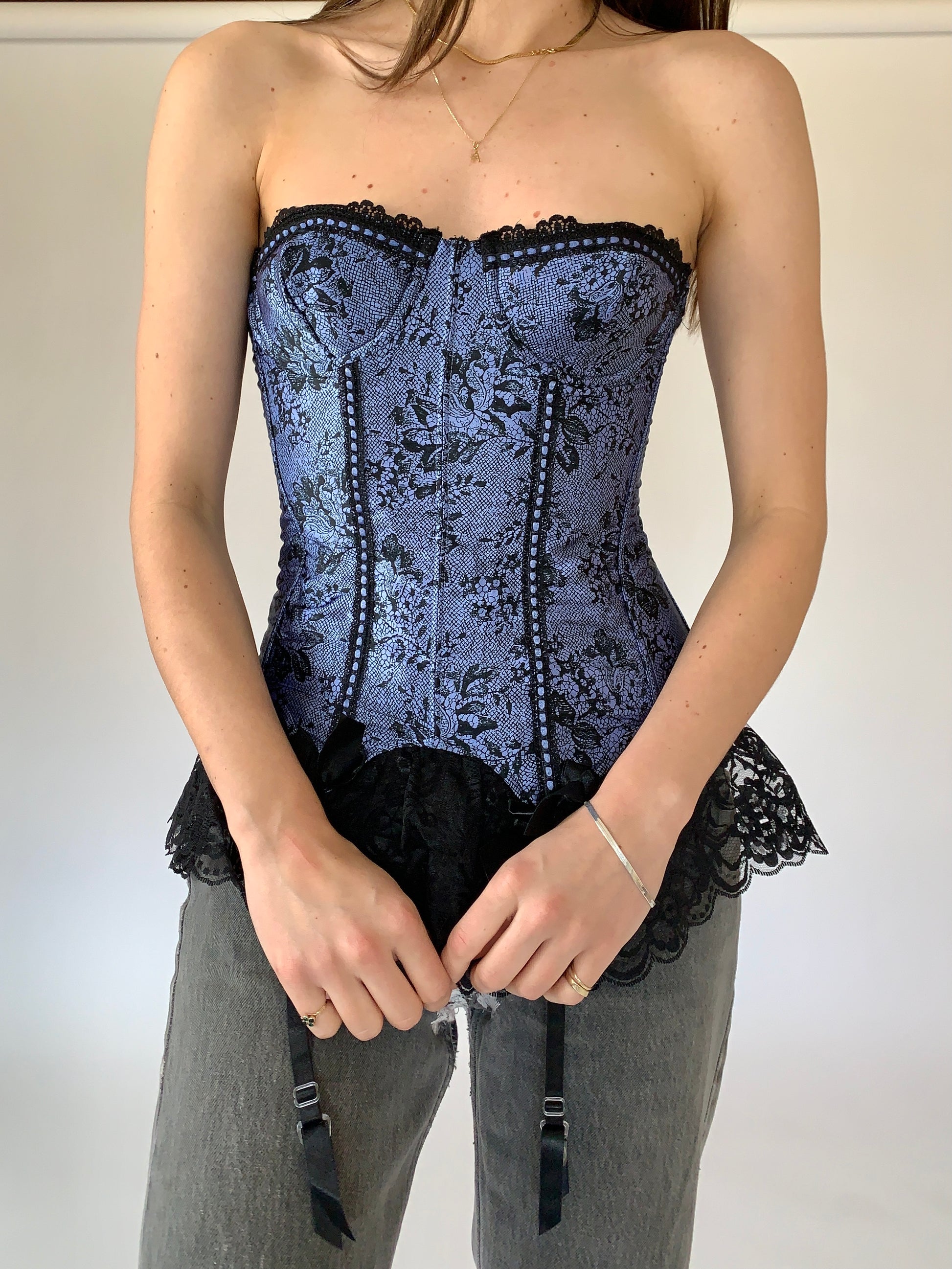 Y2K Frederick’s of Hollywood bustier. Strapless fit with adjustable hook closure, and ruffle hem. In a purple satin with black floral design. Material is a poly, nylon, spandex blend. In excellent vintage condition. Tagged size 32, best fits XS-S frames.
