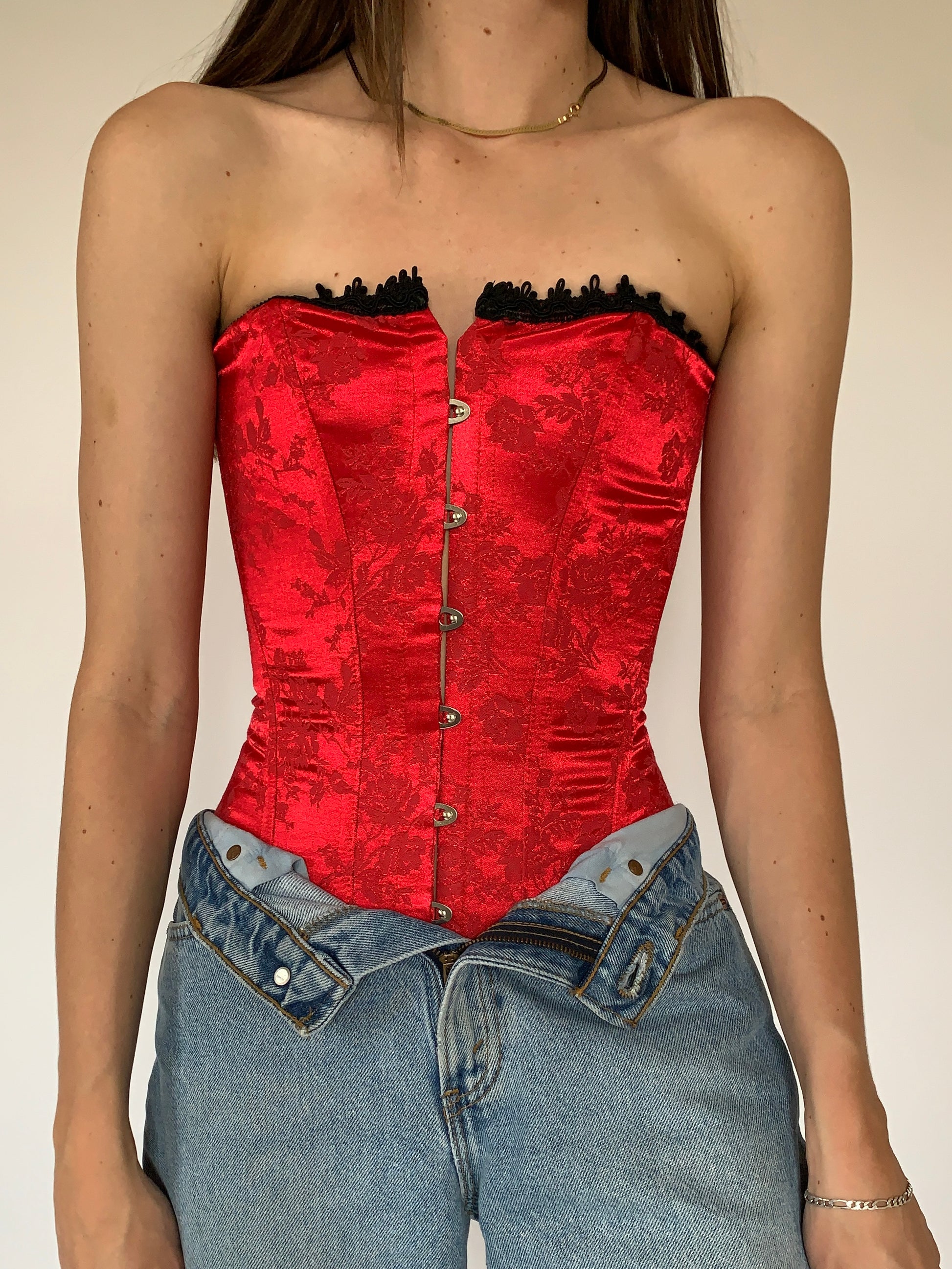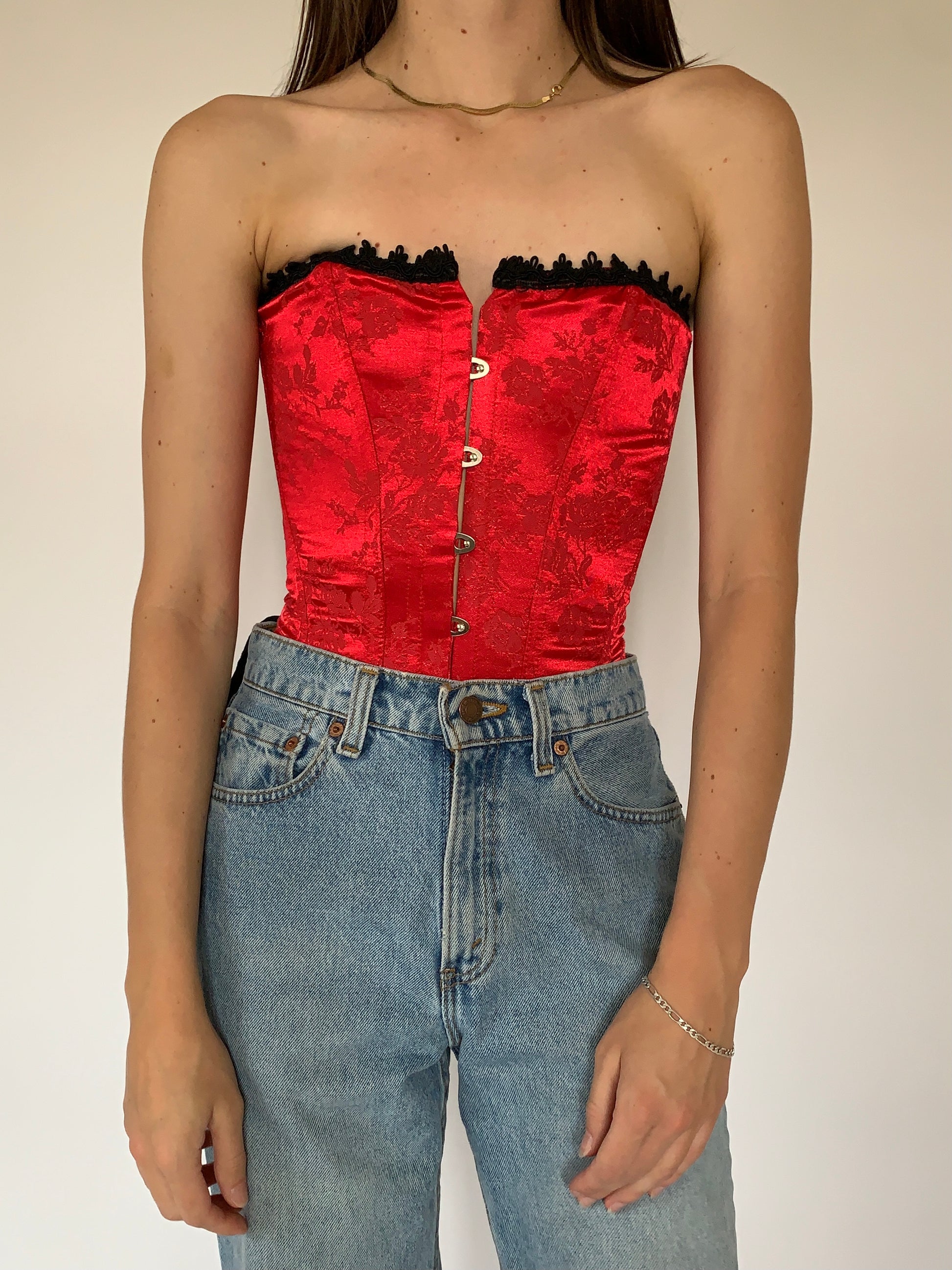 Y2K corset made by Coquette. Strapless fit with hook front closure and lace up back. In red and black. Material is a cotton/acetate blend. In excellent condition. Tagged size M, but fits more like XS-S. Shown on size XS/32 model. Adjustable fit due to lace up closure.
