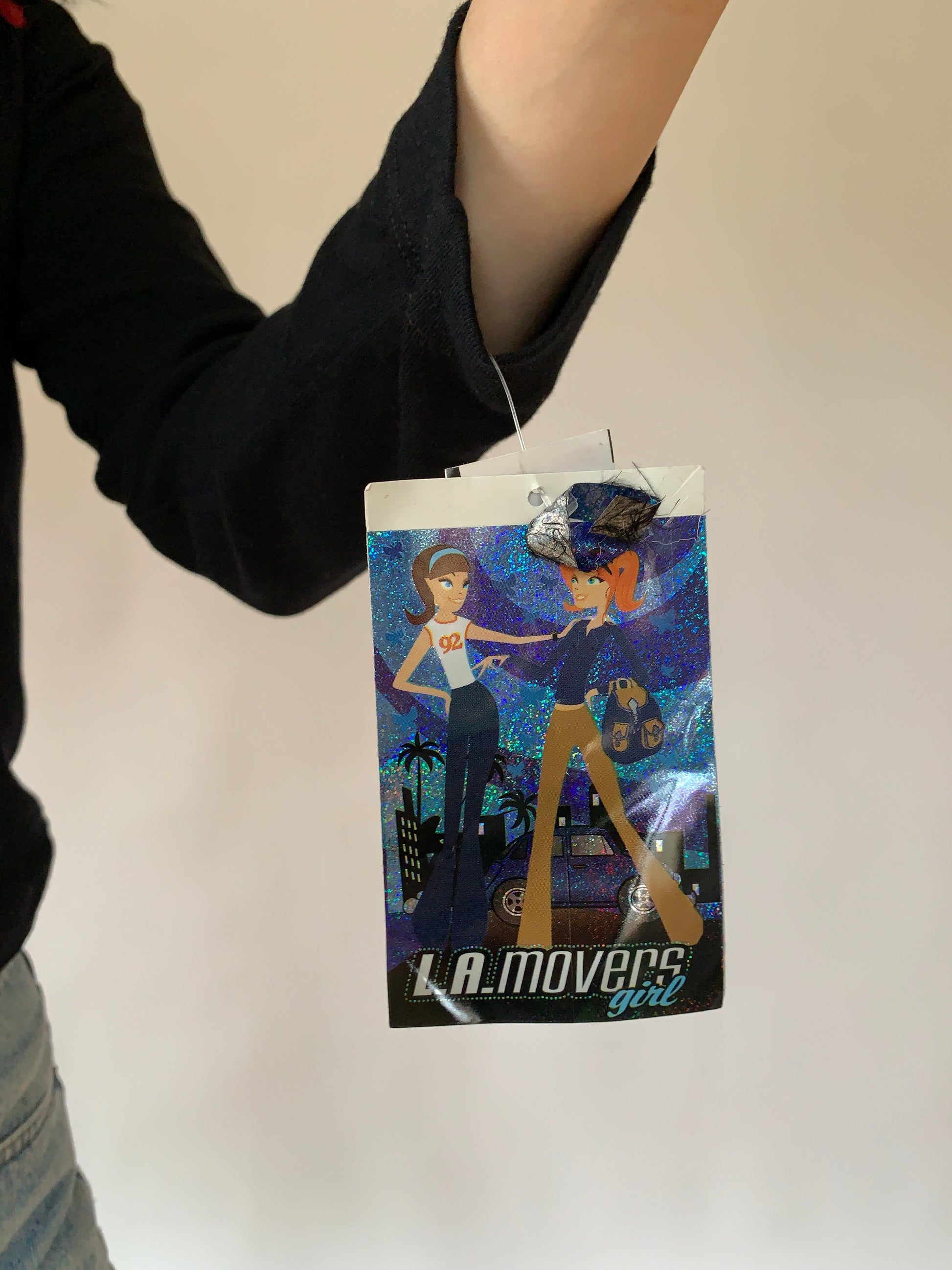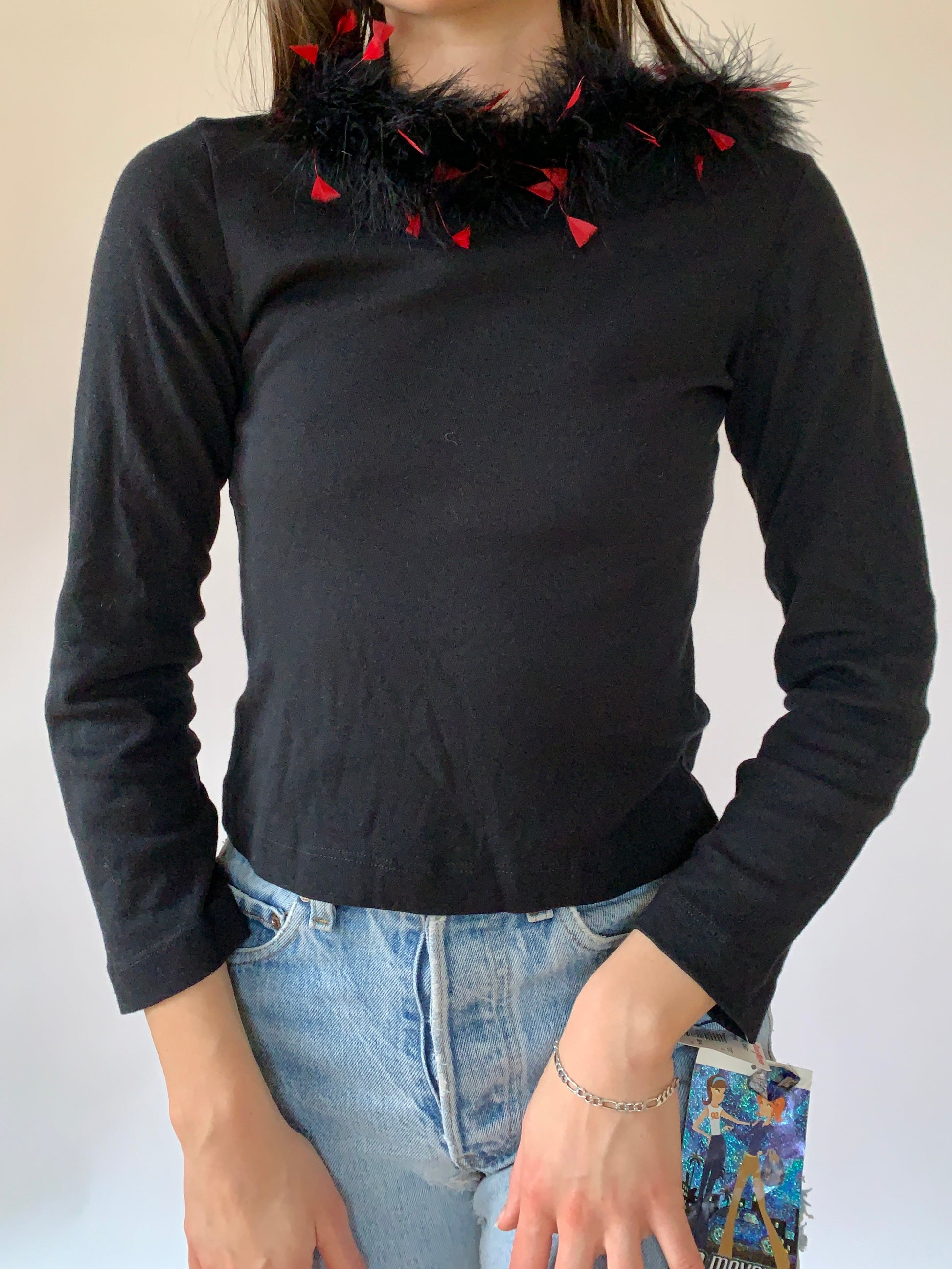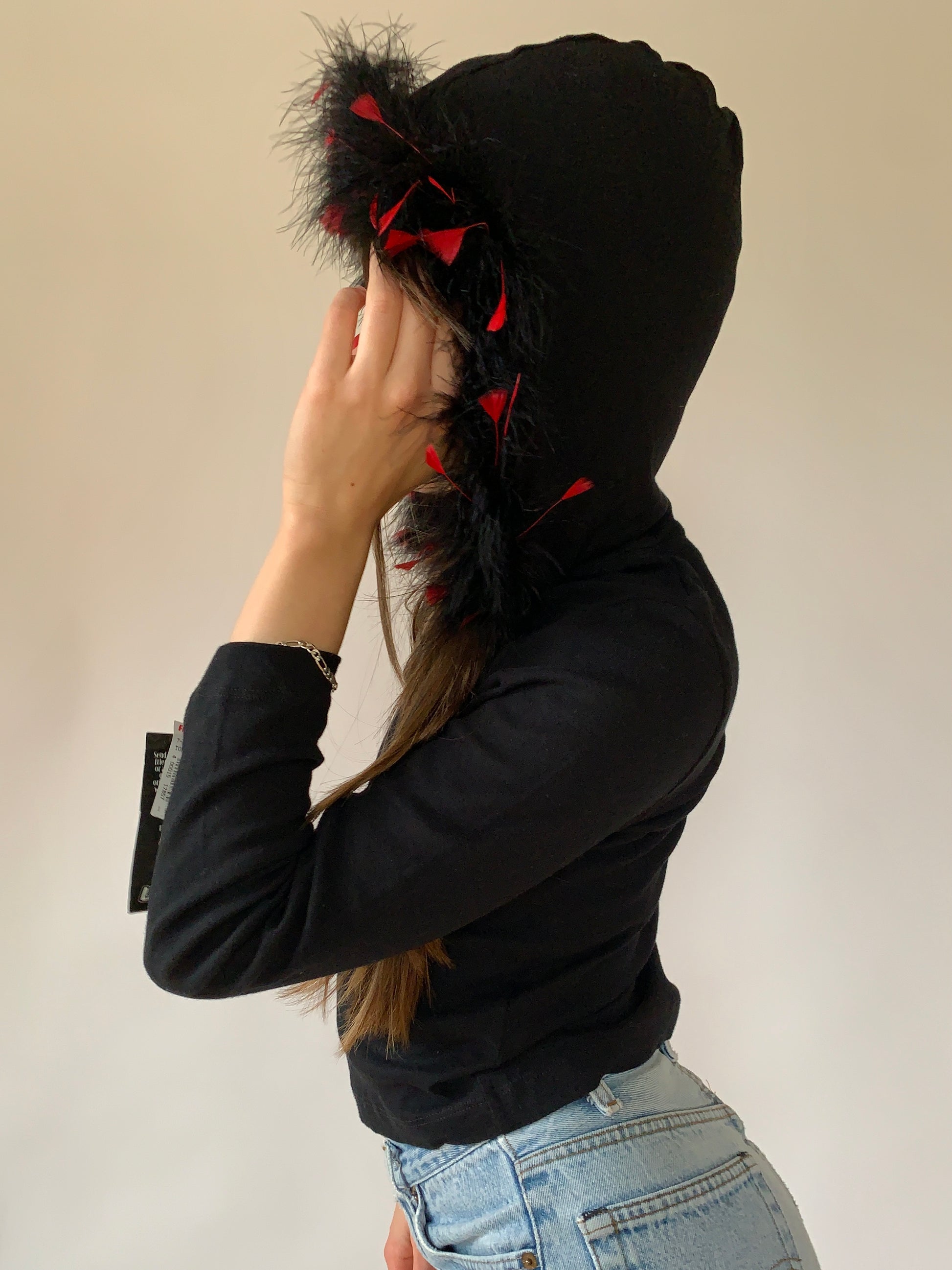 Y2K deadstock L.A. Movers feathered hoodie top. In back and red. 100% cotton. In brand new condition with original tag attached. Tagged youth XL, but best fits adult XXS-XS. Shown on size XS.