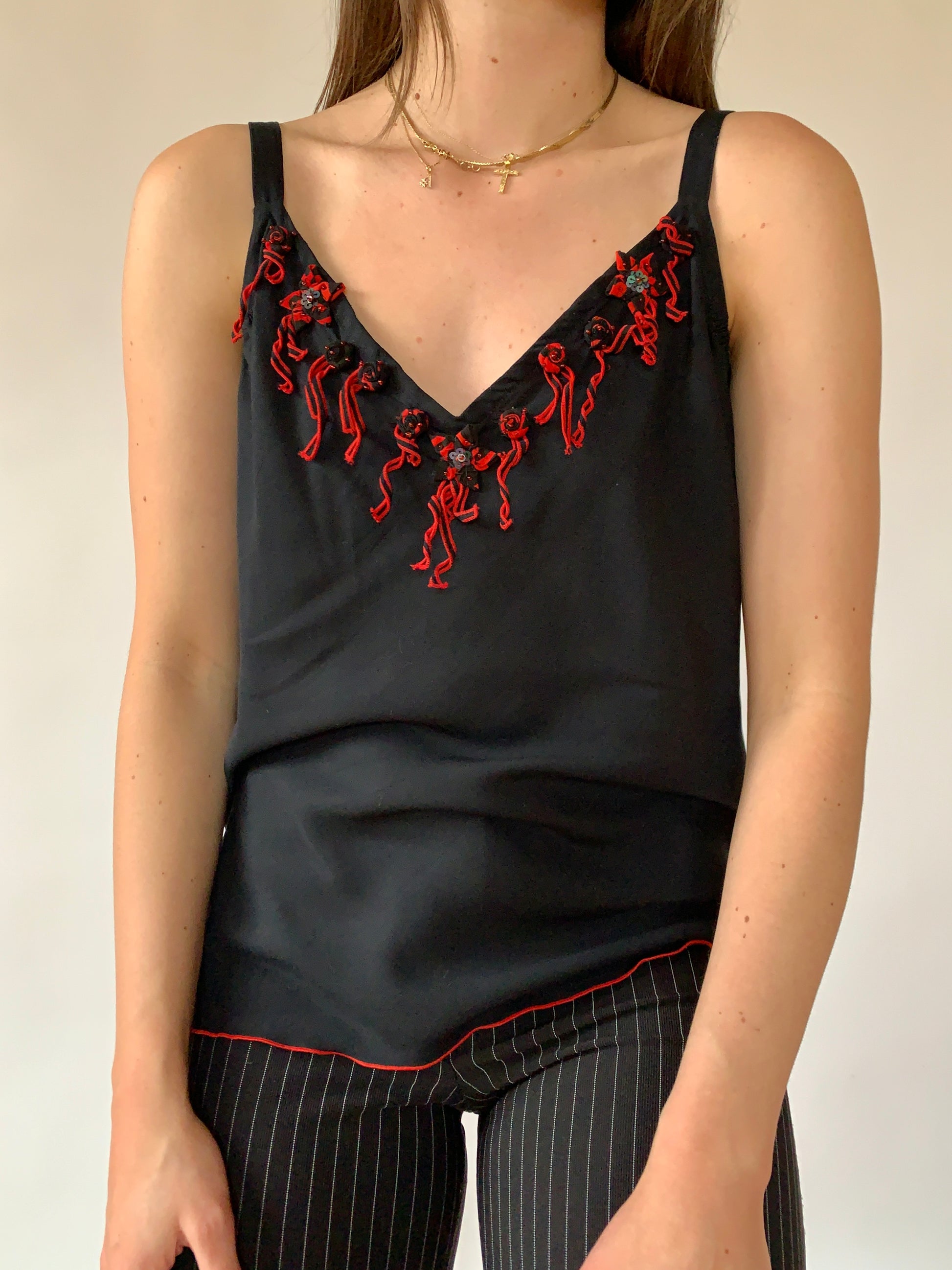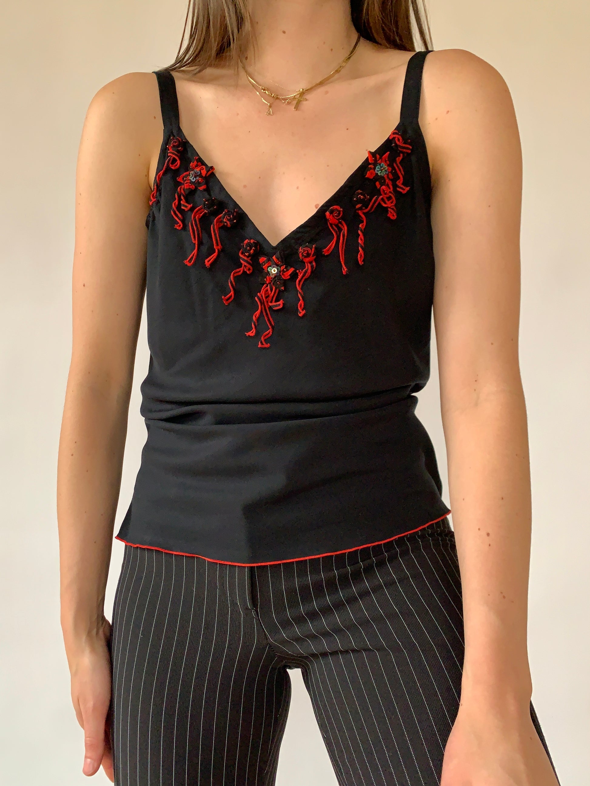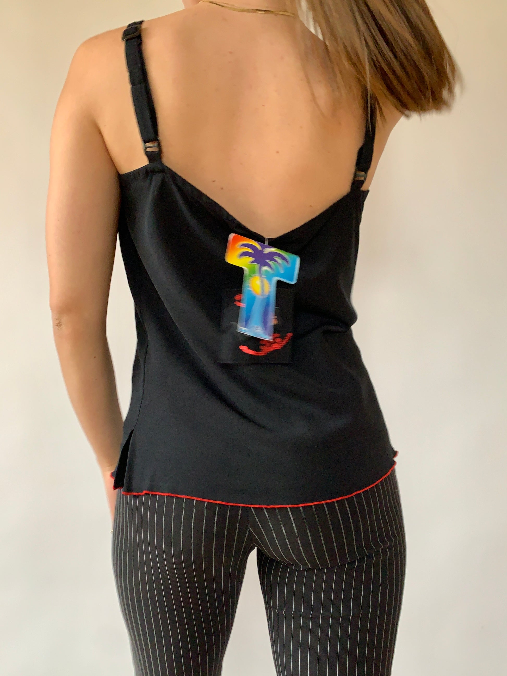 Y2K deadstock tank by Tropical Tantrum. Adjustable straps. In black with red details. Material is 100% rayon. Brand new condition with original tags attached. Tagged size medium. Shown on size XS.