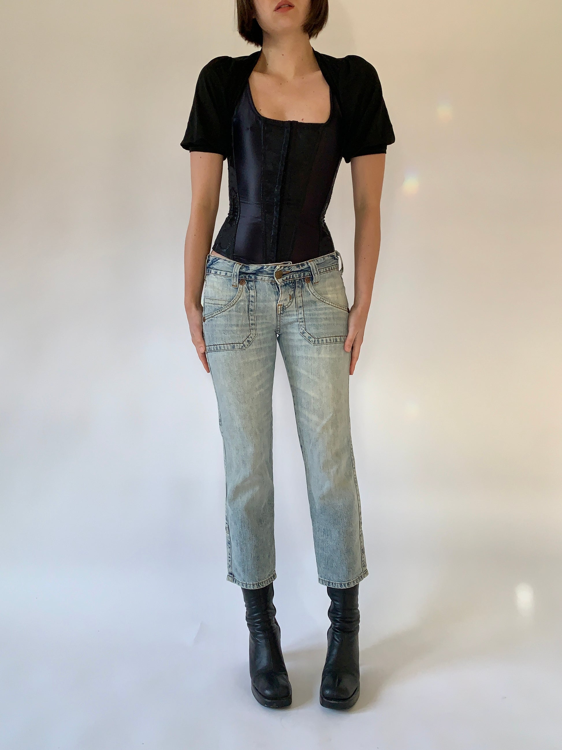 - Please refer to the measurements of the garment laying flat - waist (low rise): 30“ rise: 7.5” hips: 38” inseam: 25”