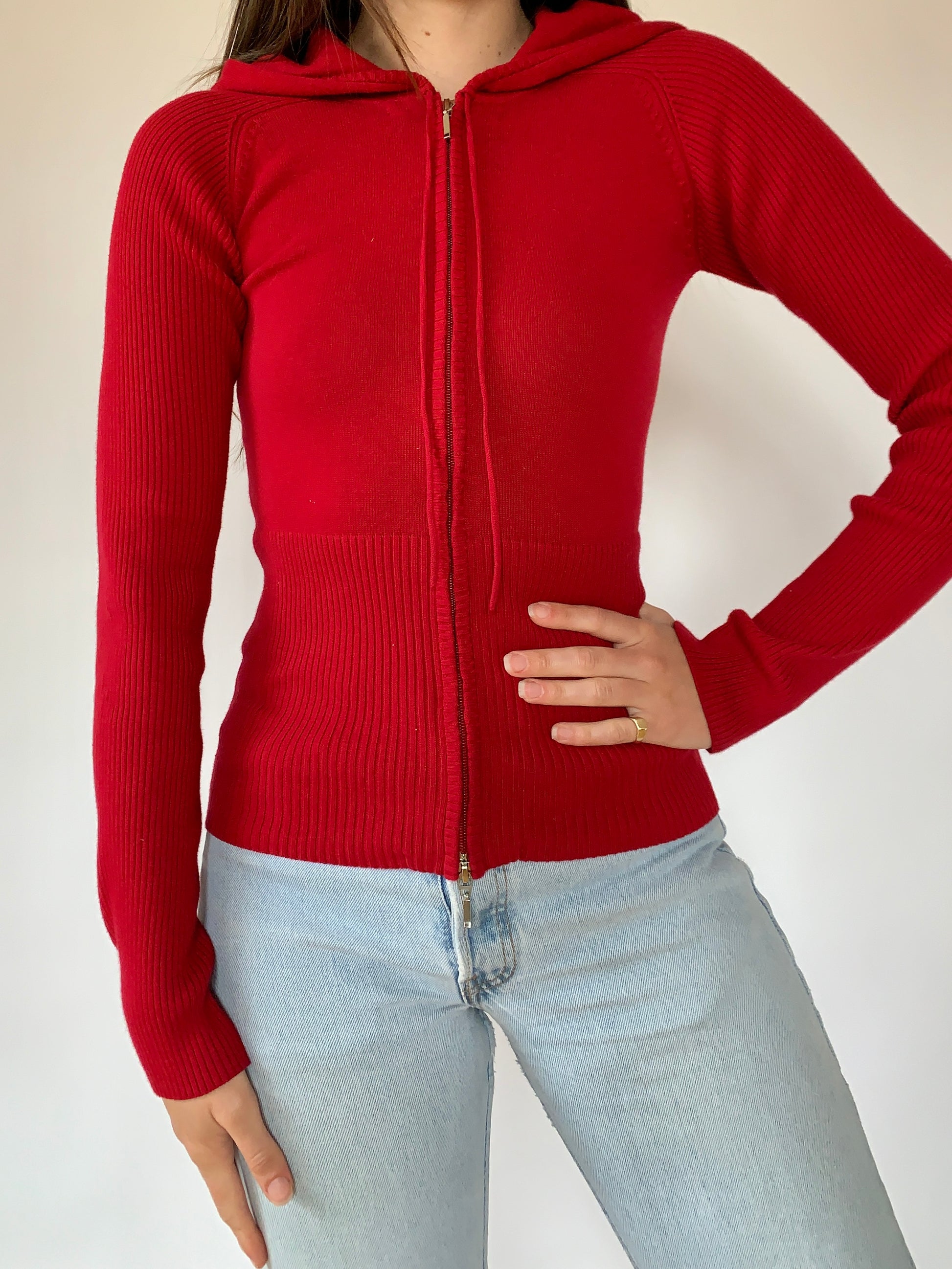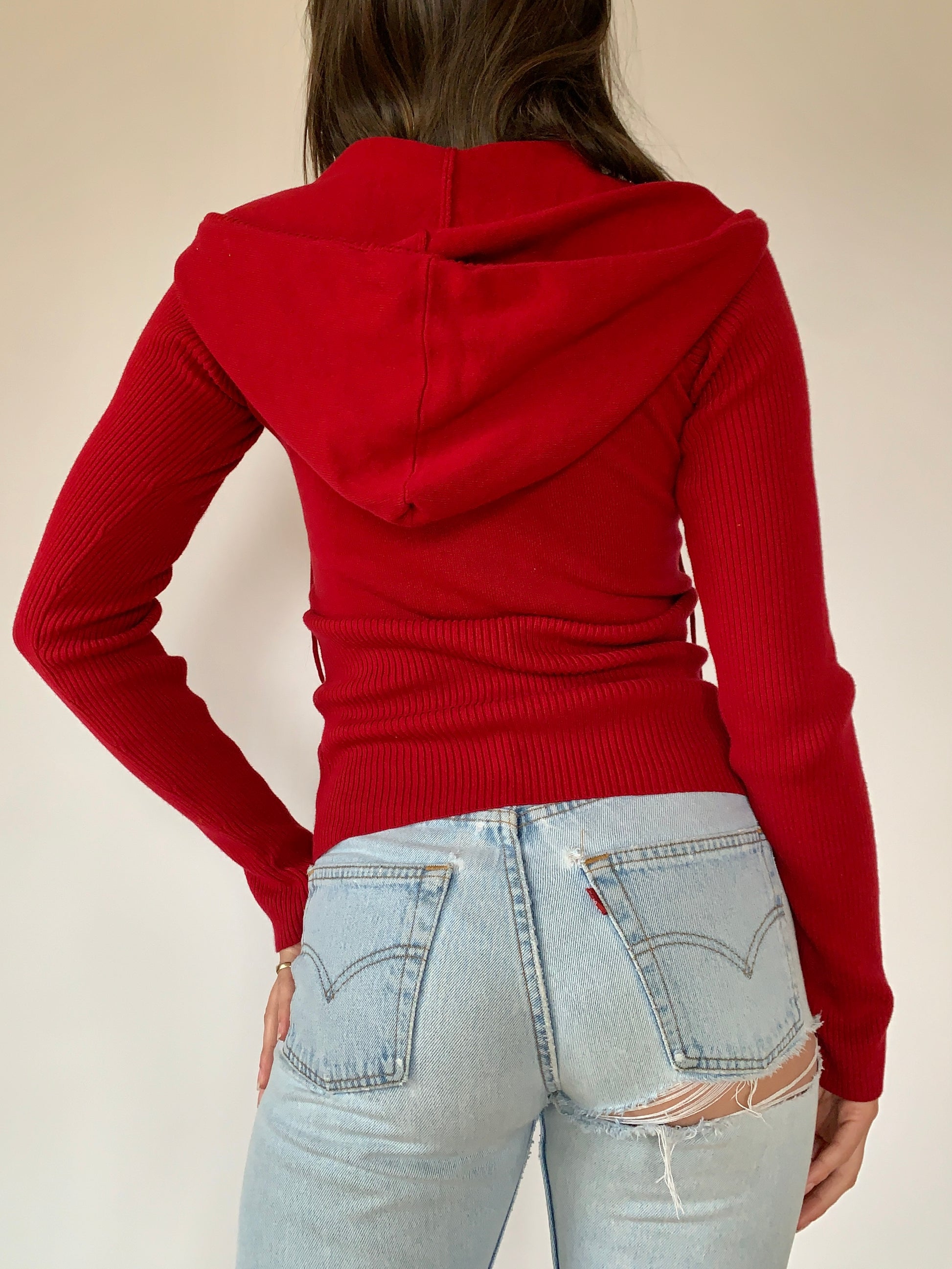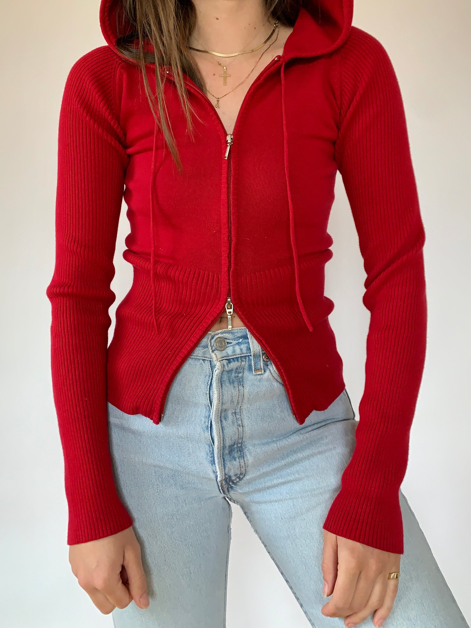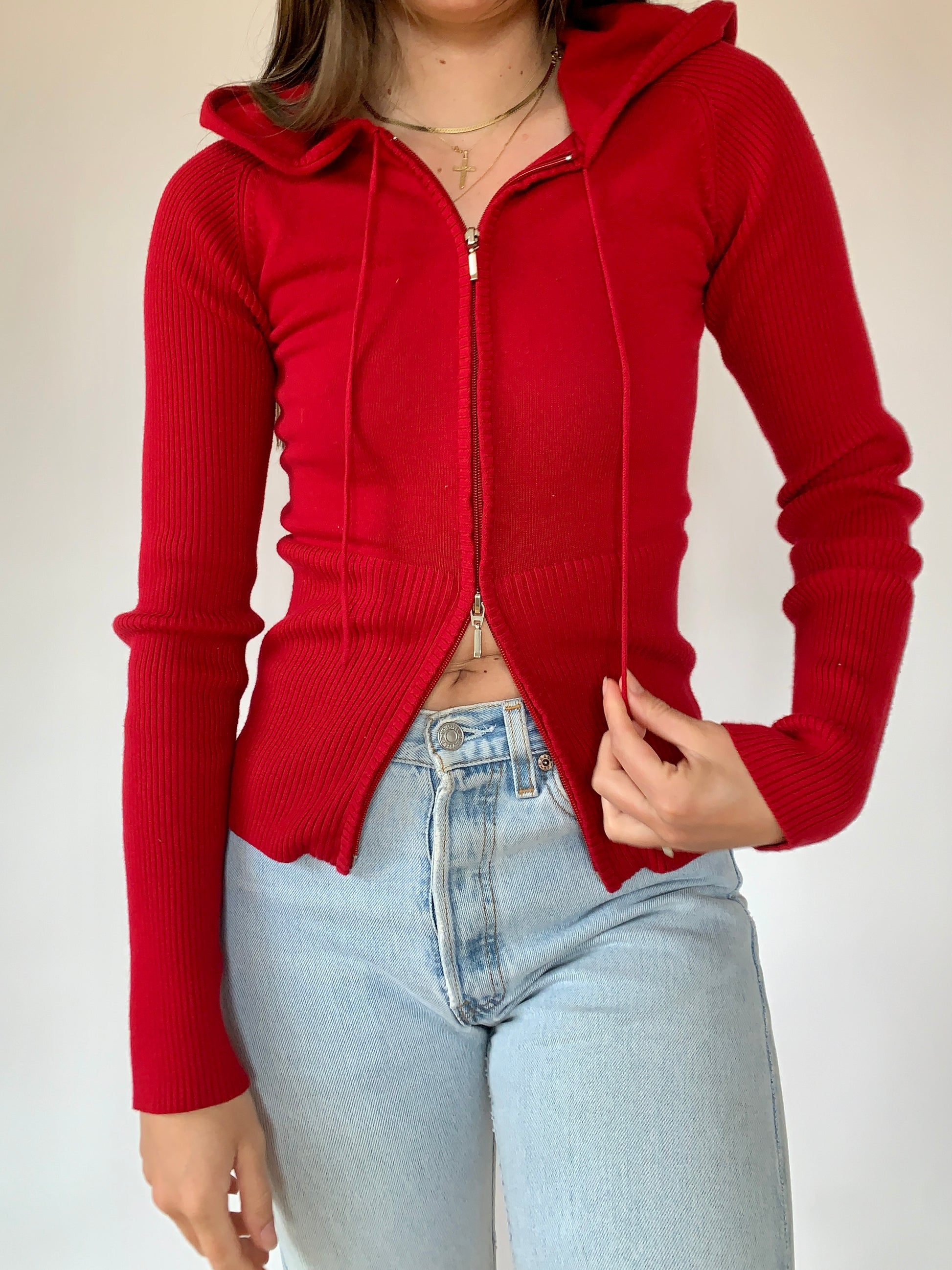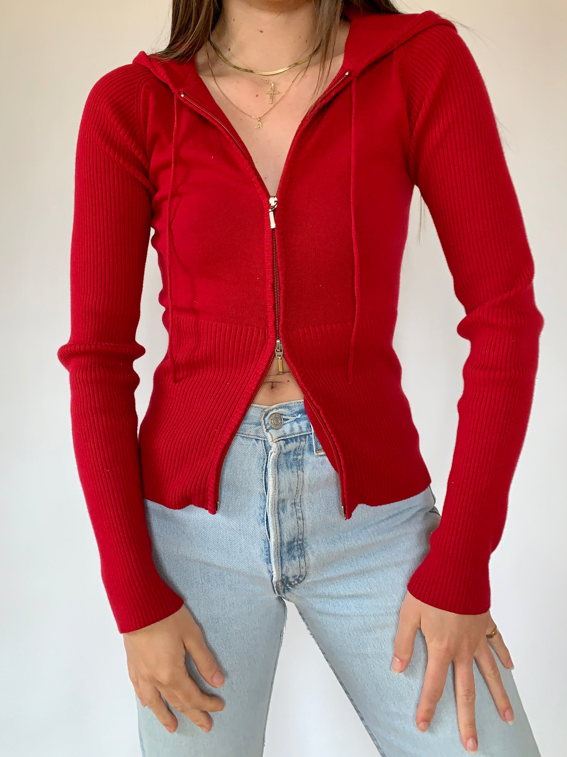 Y2K red double zip hoodie, made by Say What?. Material is a cotton spandex blend with stretch. Excellent condition. Tagged size small. Shown on size XS.