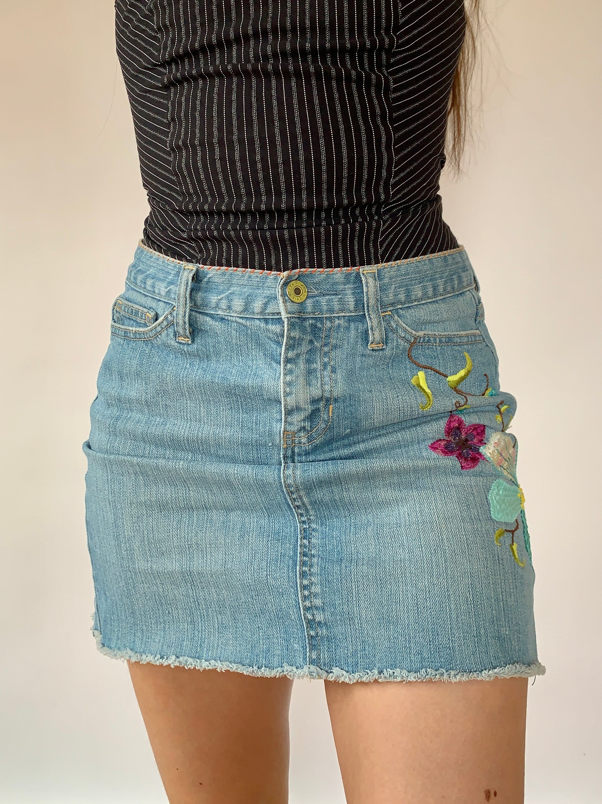 2000s Gap denim mini skirt. Mid rise. With embroidery detail. Material is a cotton spandex blend. Good condition. Tagged size 2, best fits 27” waist at mid rise.