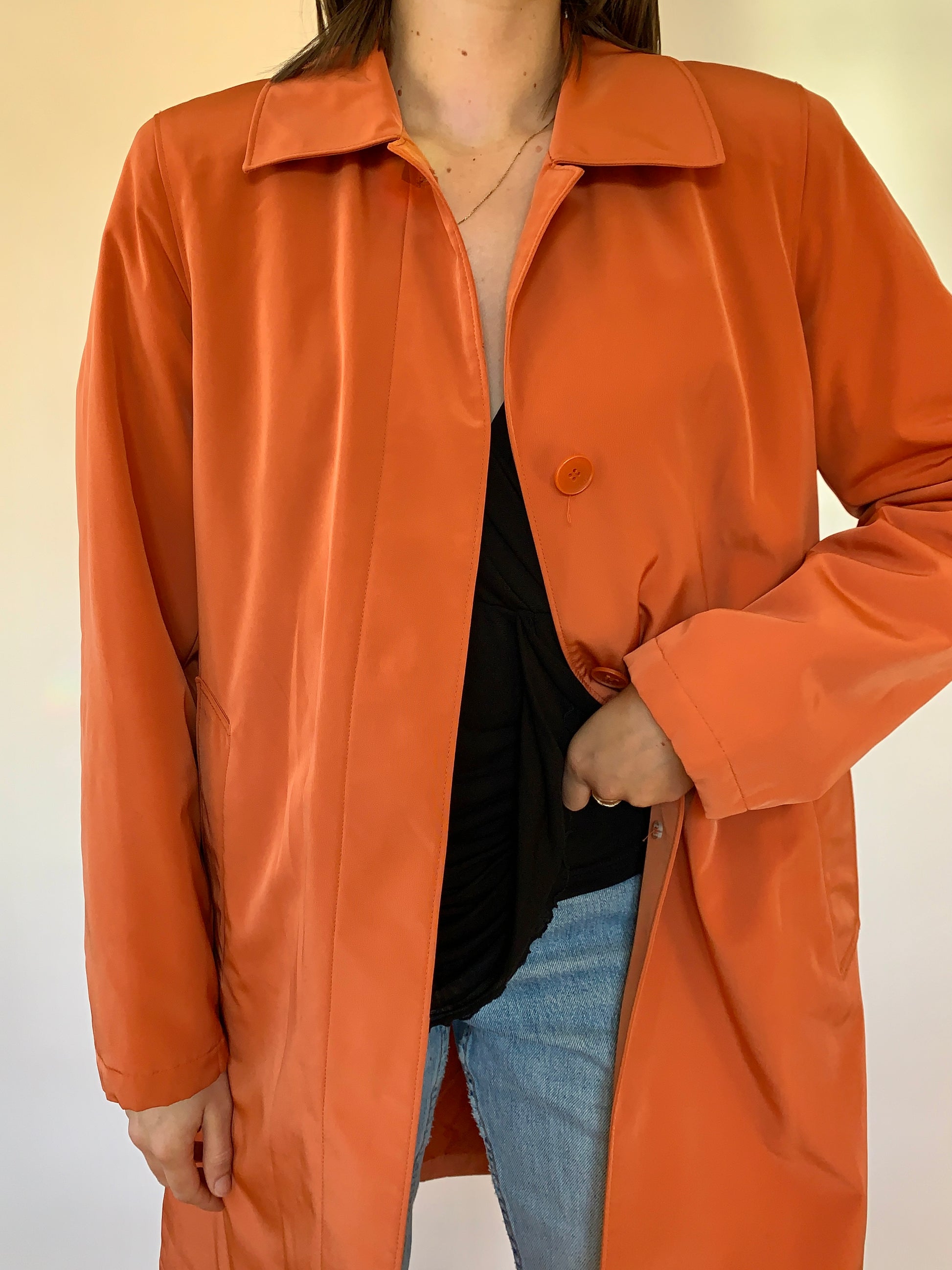 Y2K Esprit orange trench. Material is a windbreaker-like polyester with fleece lining. Good condition. Tagged size S, shown on size S.
