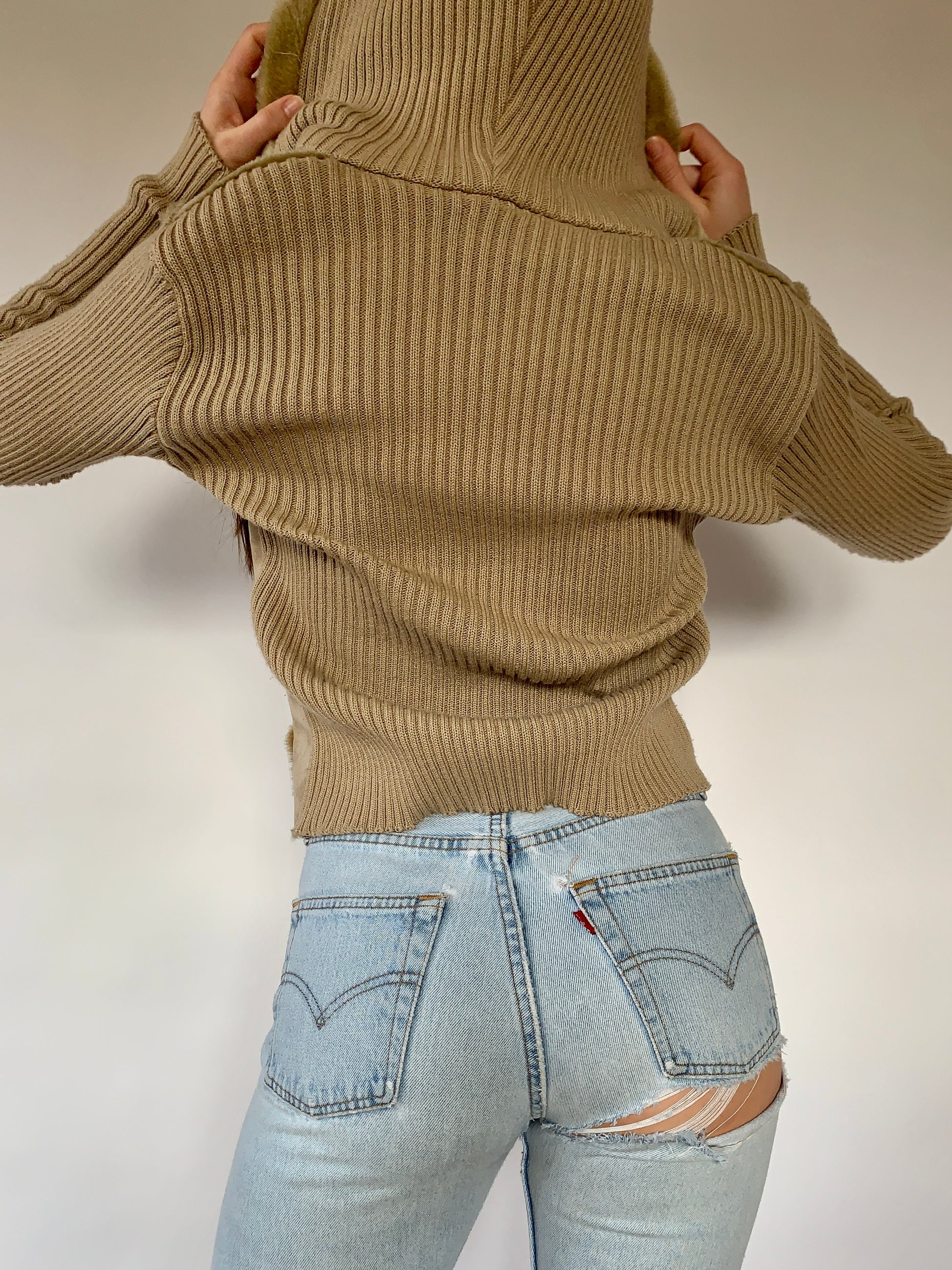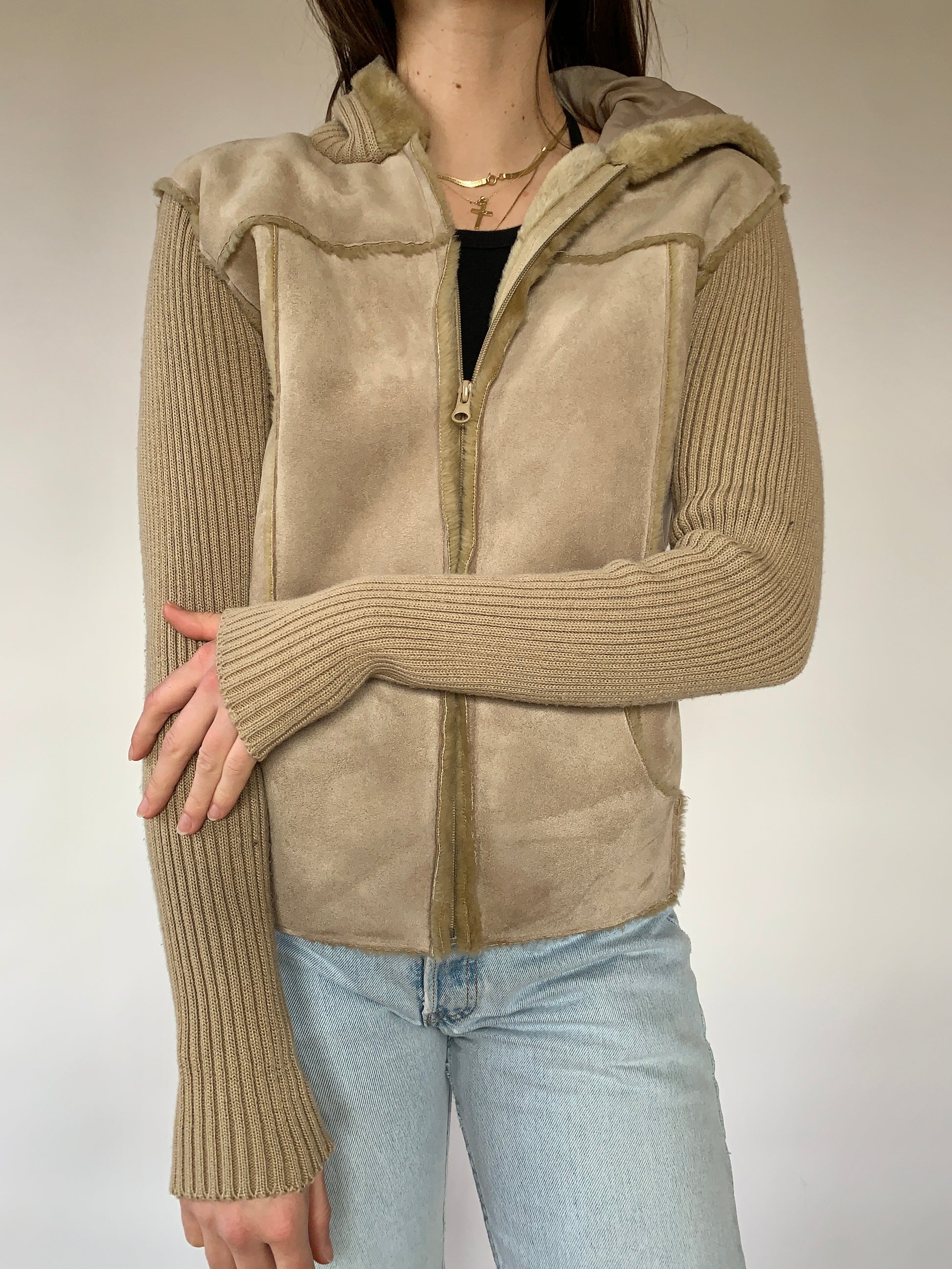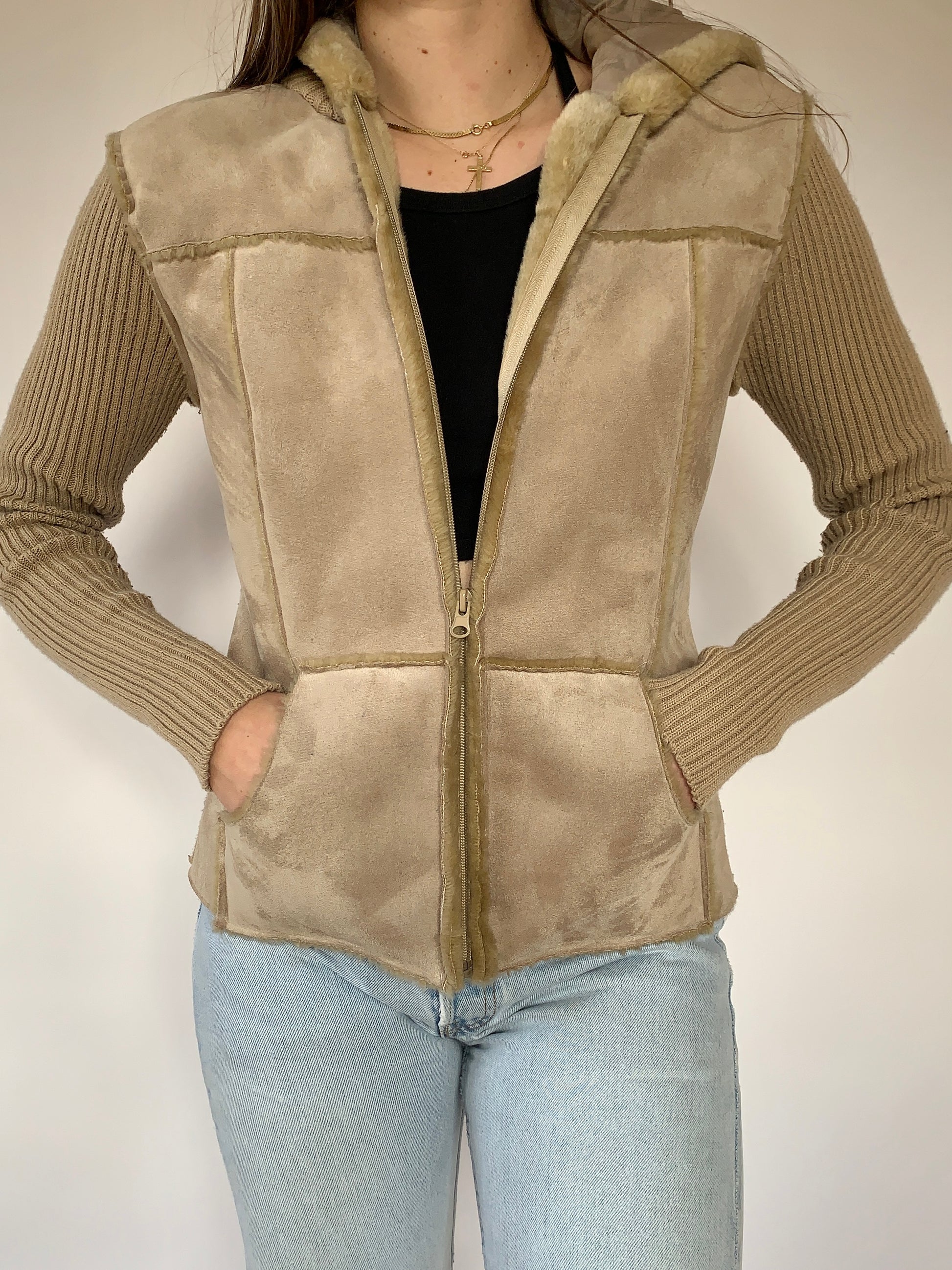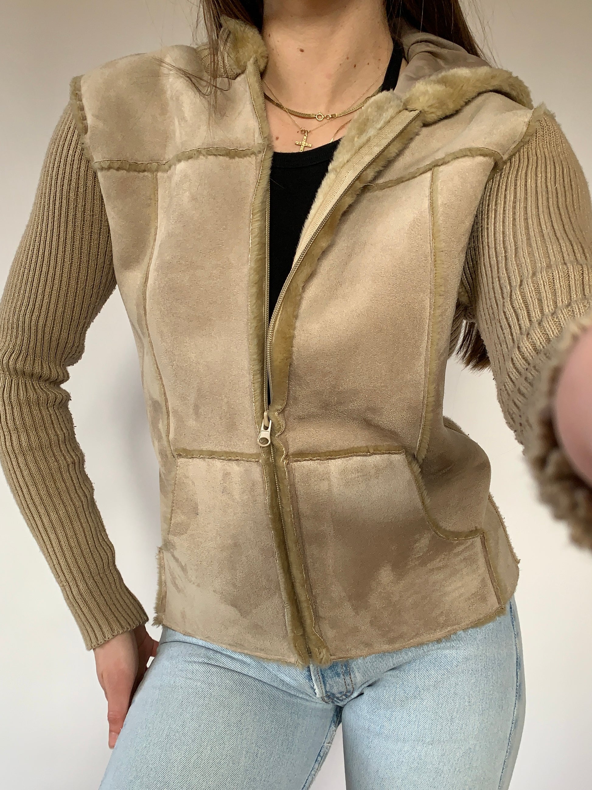 Y2K faux fur zip up hoodie, made by Say What? In a neutral beige. Material is polyester. Good condition despite minor discoloration spot on pocket. Tagged size M. Shown on size XS.