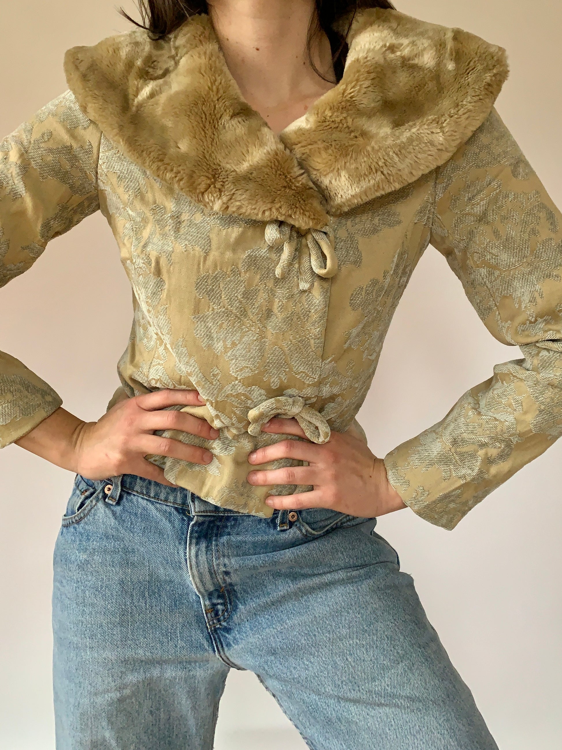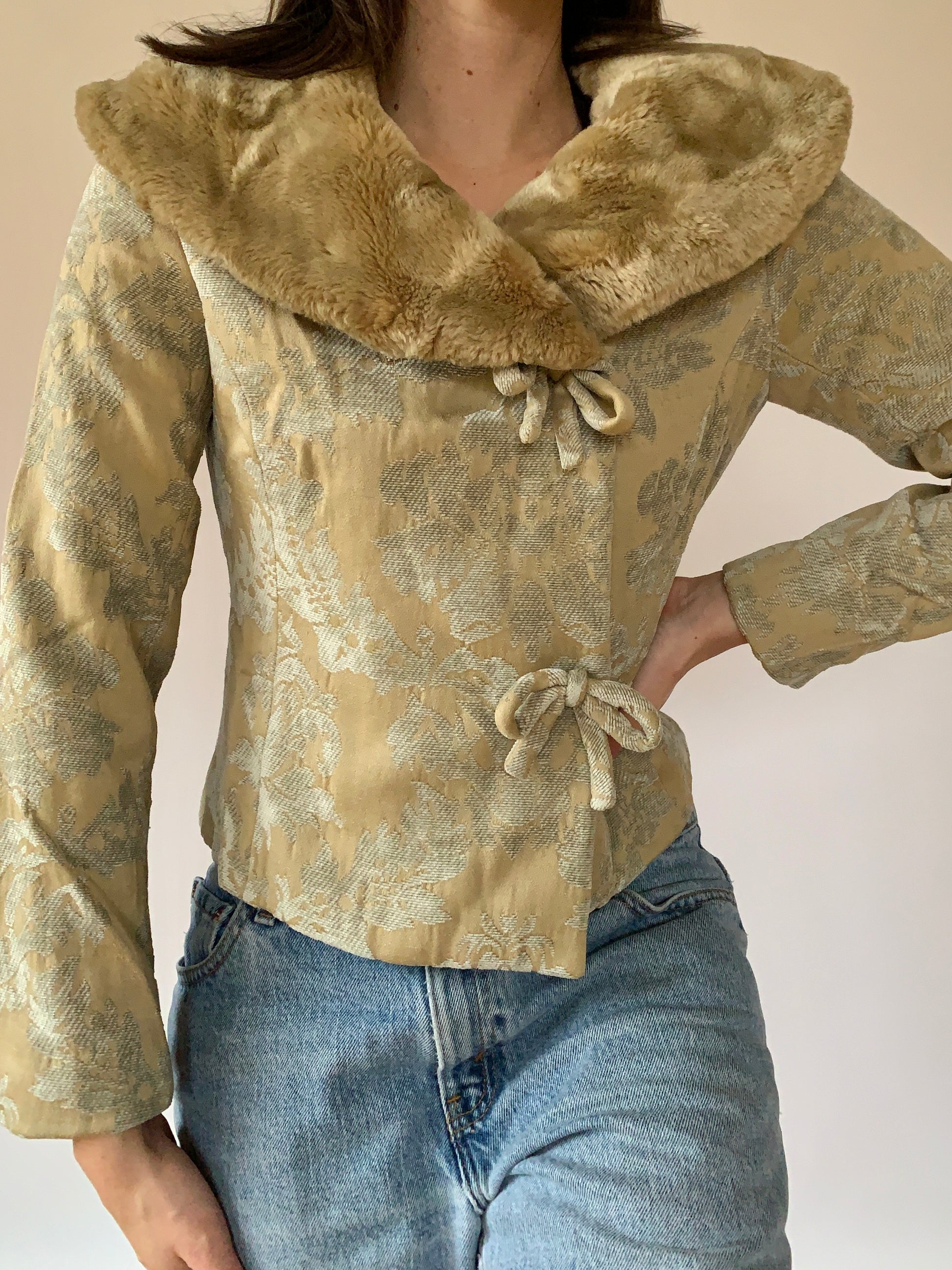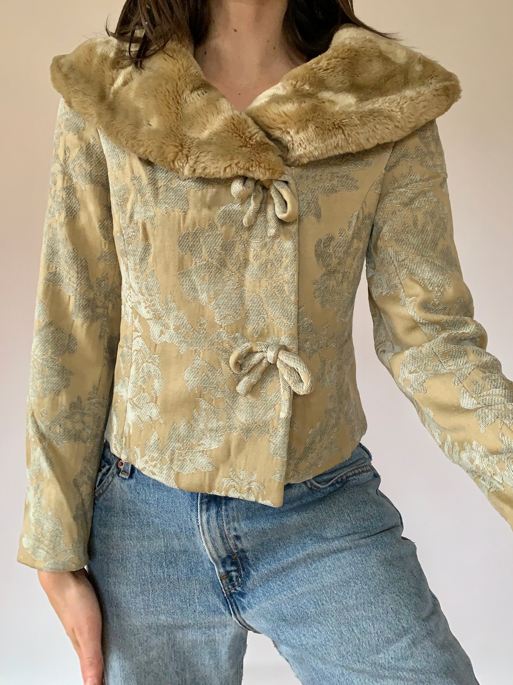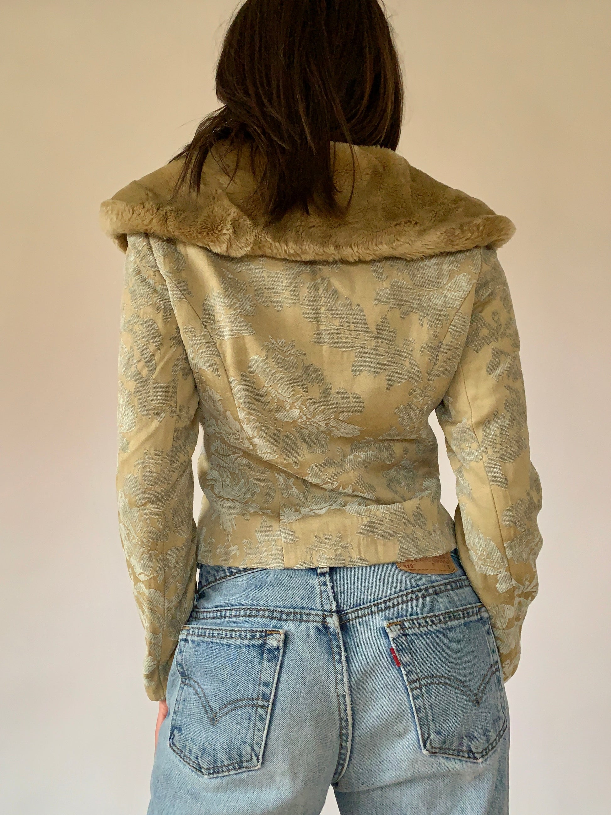 Y2K faux fur trimmed jacket, made by Odille. In tan. Material is a poly/rayon/cotton blend. Excellent condition. Tagged size 8. Shown on size S.