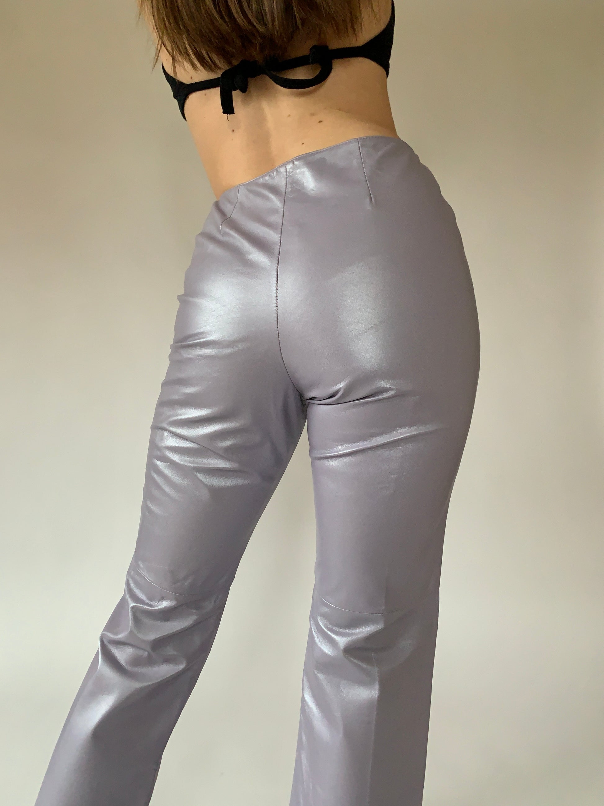 Y2K iridescent lavender leather pants. Mid rise with a straight leg. In silvery lavender, genuine leather with a nylon/acetate lining. In excellent condition. Tagged size 2, best fits 25” waist.