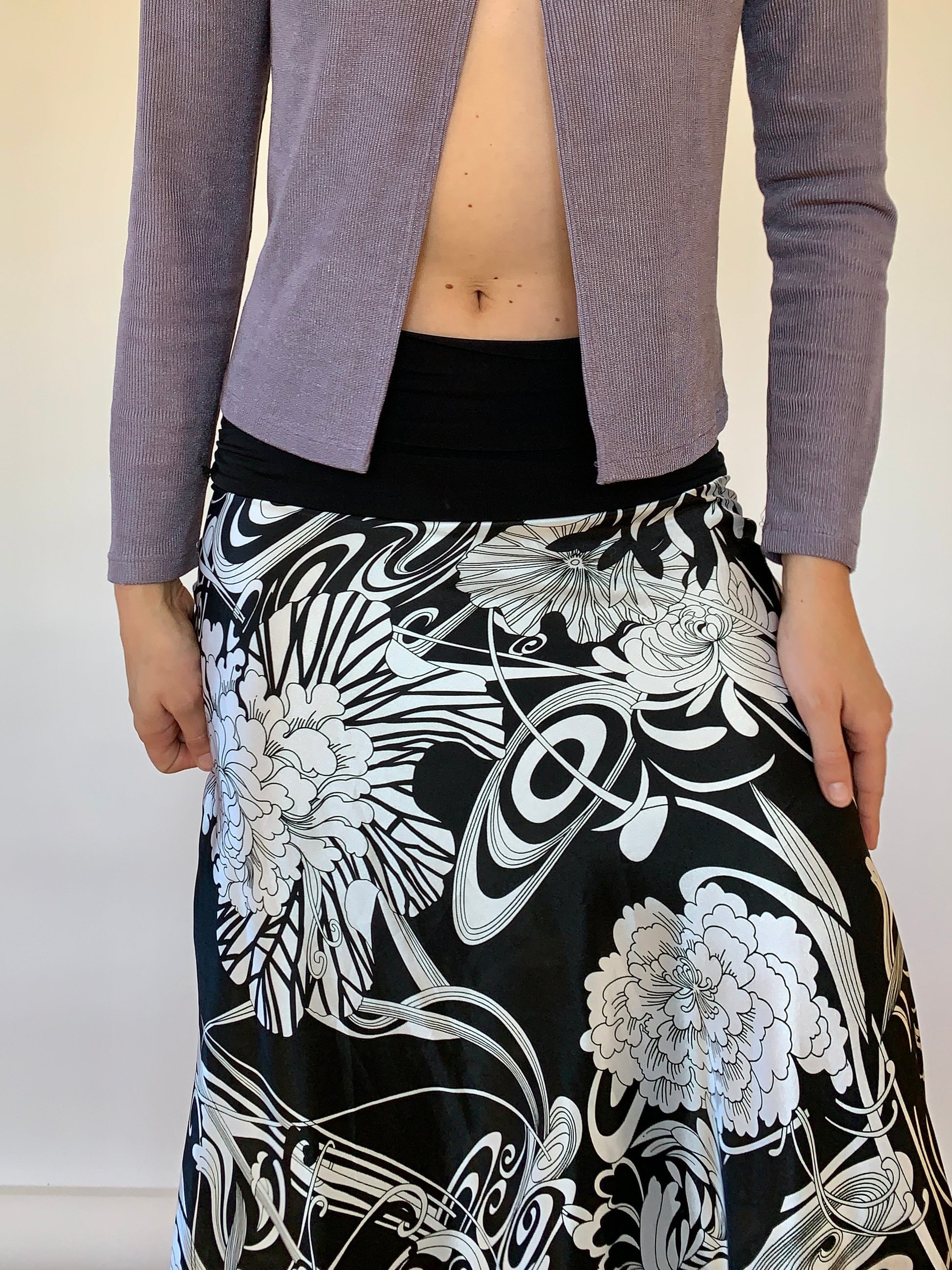 Y2K Body Central maxi skirt. In black and white. Material is satin polyester. Made in USA. Excellent condition. Tagged size S, shown on size S.