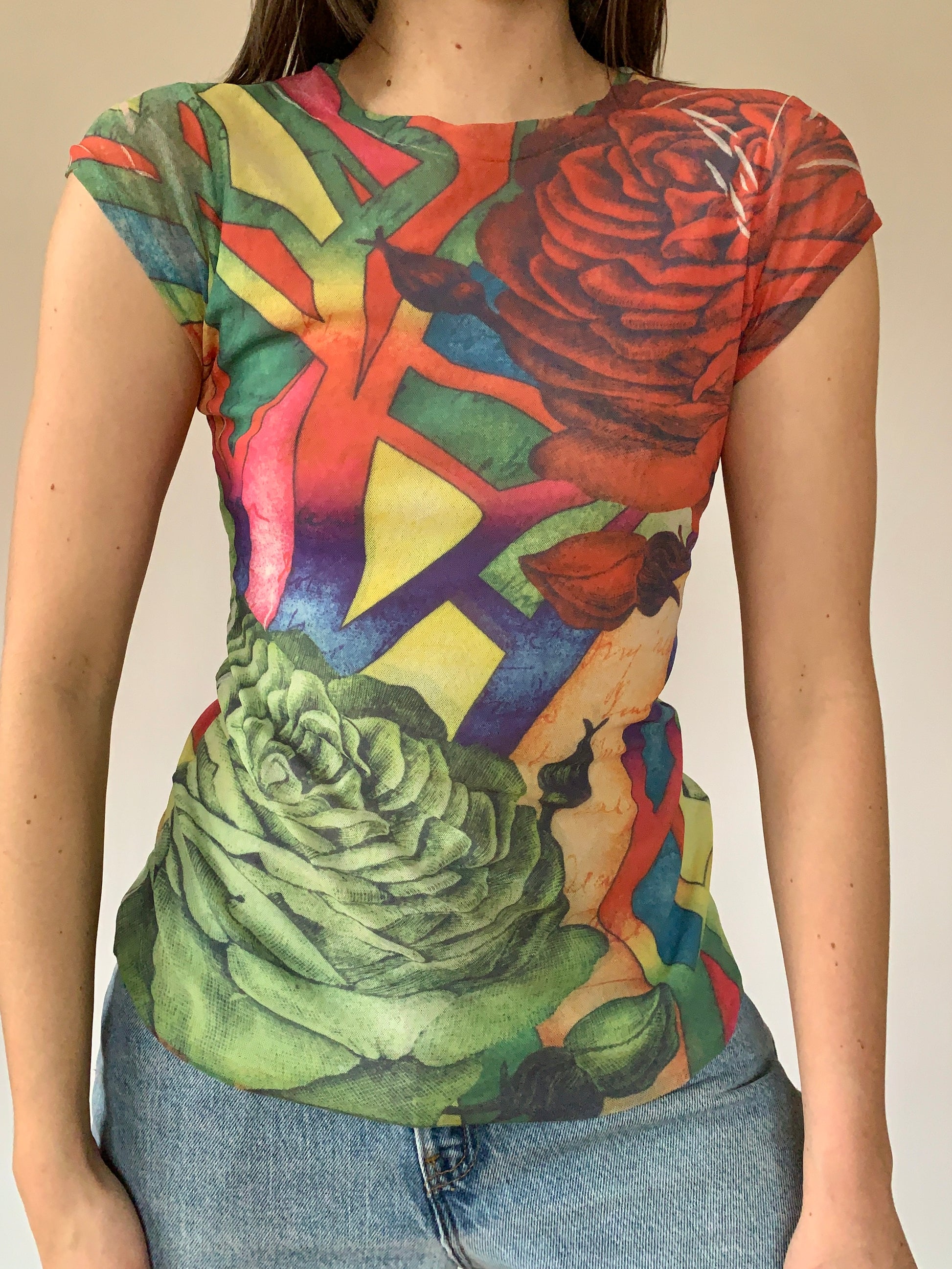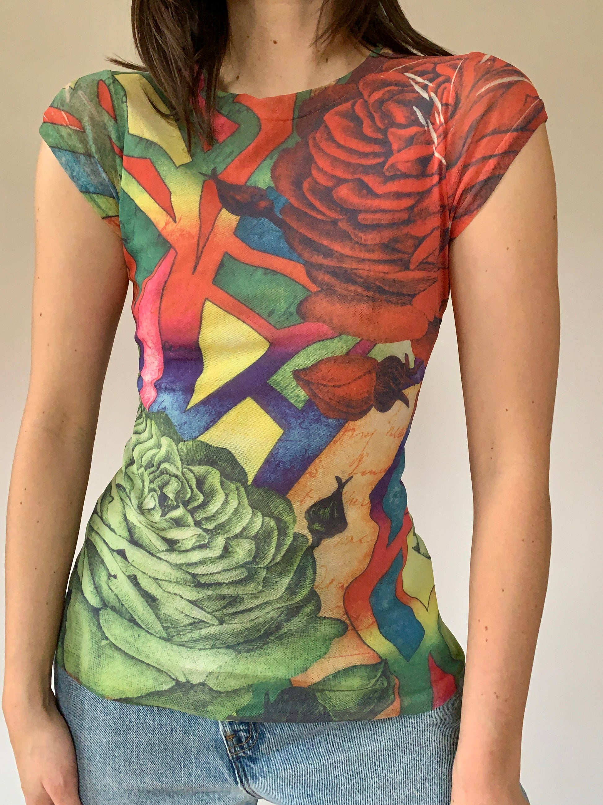 Y2K mesh top by Viviana G. Multicolored rose design. Material is 100% nylon mesh with stretch. Made in USA. Excellent condition. Tagged size M, shown on size S.