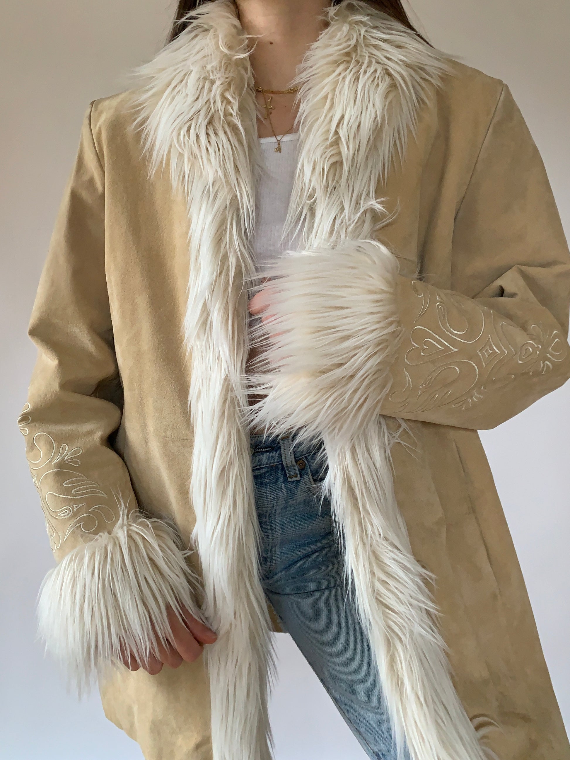 Y2K penny lane coat, made by Mix It. Genuine suede leather with a faux fur trim. In excellent condition overall despite a couple tiny discoloration spots. Has one hook for closure. Tagged size L, but fits more like M. Shown oversized on size XS.
